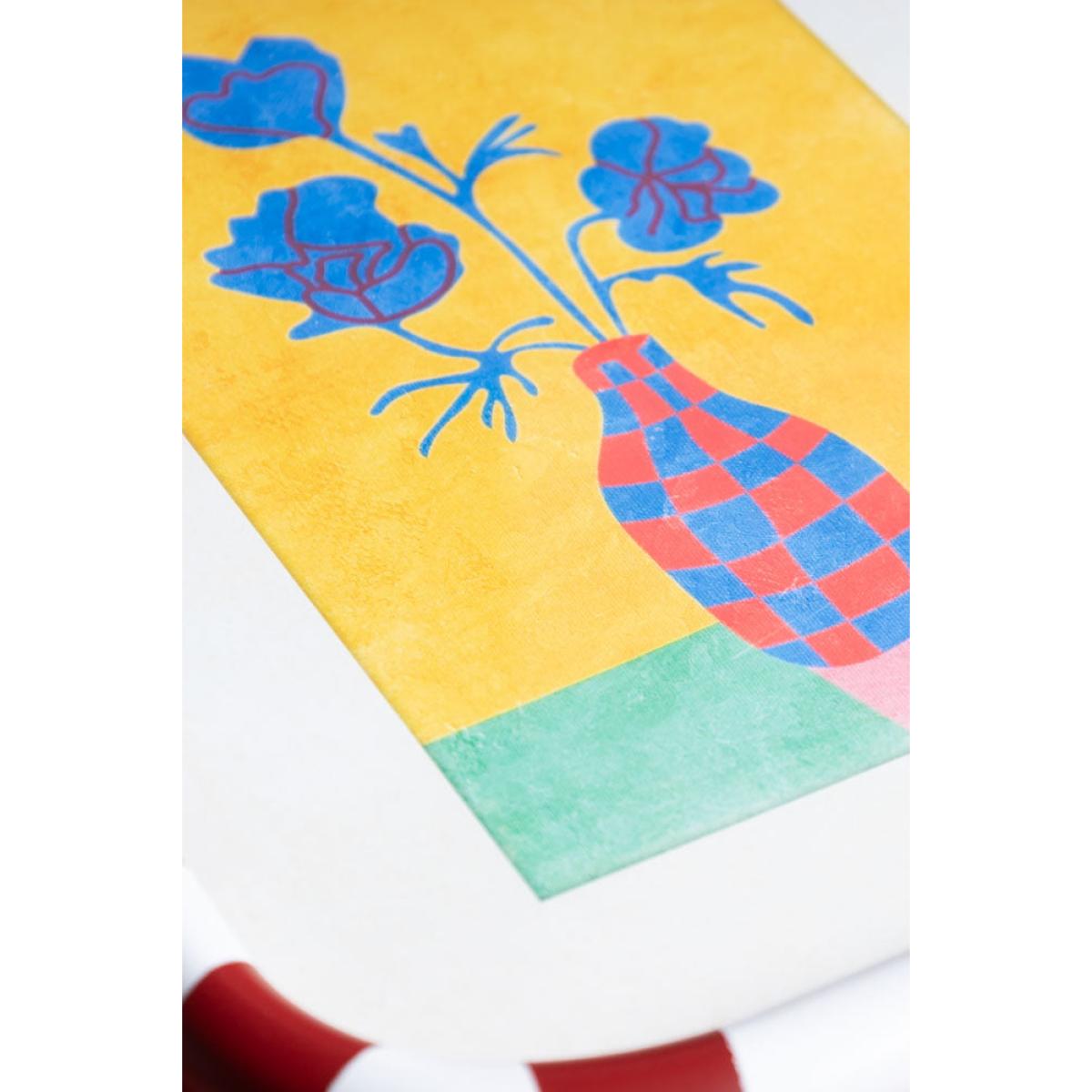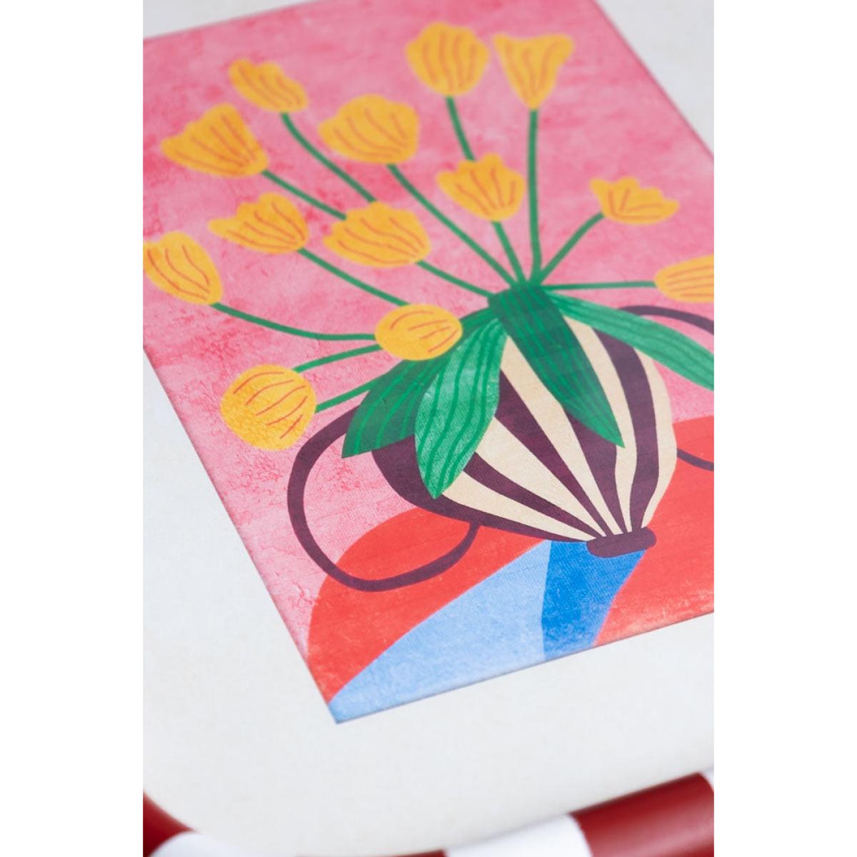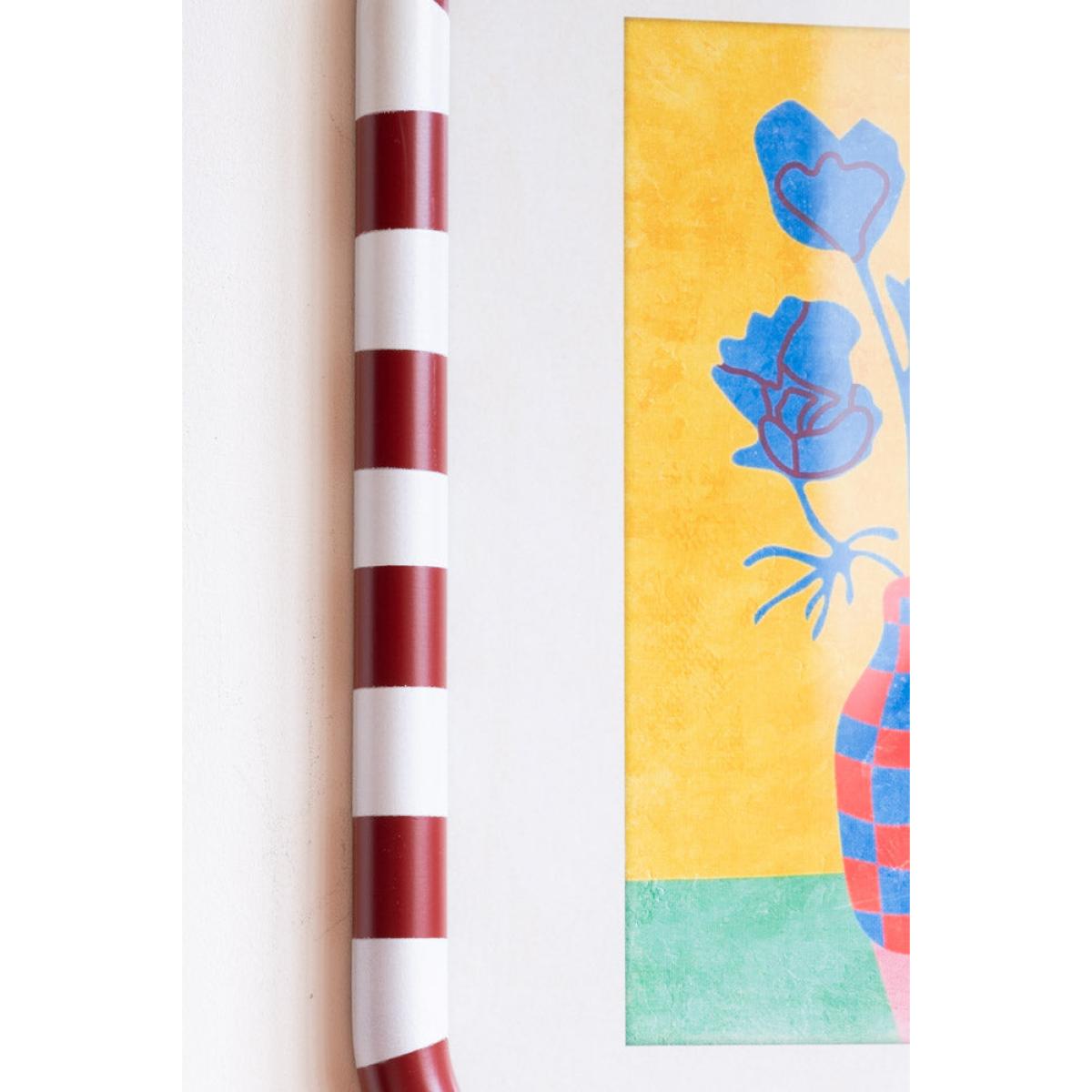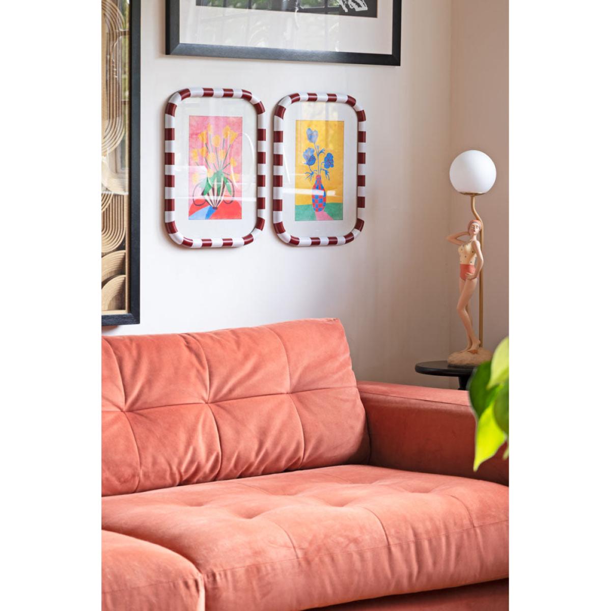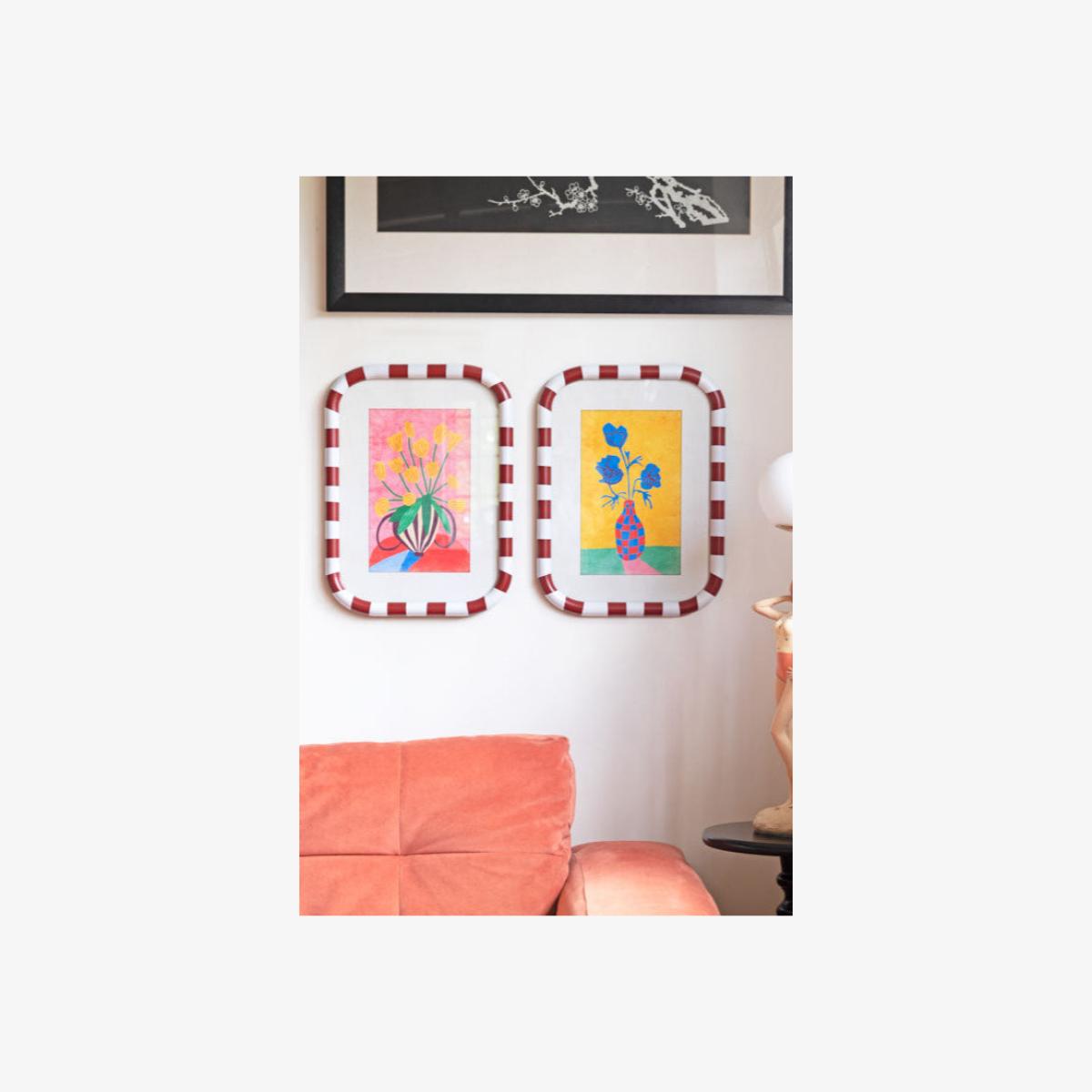 Feast your eyes on these beautiful framed art prints, with red and white striped frames and complete with the dreamiest, joy-sparking flower prints. Each frame is wrapped in cheerful stripes, perfectly cradling two gloriously colourful framed prints. One is a pop of sunny yellow blooms against a blush pink backdrop, the other a striking cobalt blue bouquet in a jazzy red-check vase, all set on a rich golden yellow backdrop. This art for your living room is like sunshine and good vibes in a frame. Hang them side by side for a punchy little art moment, or separate them to sprinkle the joy around your home. Either way, these beauties were made to be seen and adored. - Set of 2 Red & White Striped Frames With Colourful Flower Prints - Measures: W30cm x H40cm - Material: Glass