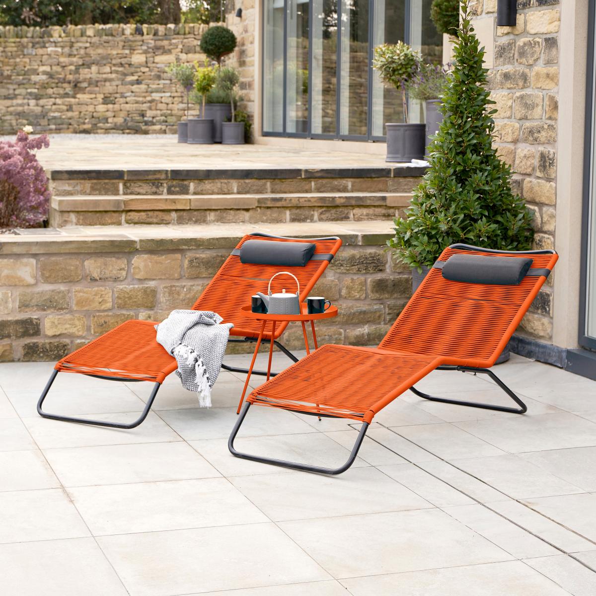 These sun loungers are a vibrant addition for outdoor spaces, bringing a pop of colour with their bold orange hue. I love them for their rattan-inspired finish, which adds texture and a relaxed, natural vibe-perfect for garden or patio settings. They work well in contemporary or boho-inspired gardens, especially when paired with neutral or earthy accessories to let colour truly stand out. Practical styling tips include adding some patterned cushions or throws for comfort, and pairing them with greenery or understated outdoor furniture to balance their bold look. They're ideal for creating a lively, inviting poolside or garden lounge area that feels both stylish and functional.