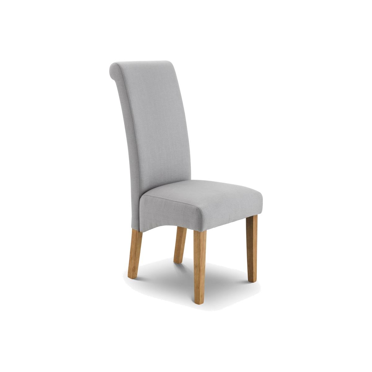 A tall yet sleek dining chair with stunning scrollback design and upholstered in a modern shale grey coloured linen effect fabric. Crafted from a hardwood frame with foam and fabric upholstery, with a sprung and webbed seat base for extra comfort.