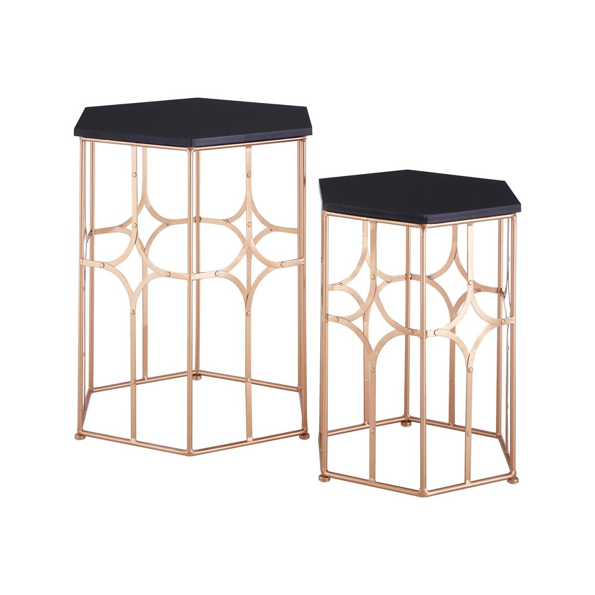 Geometric in style, the frame of each side table is made from robust iron, finished in soft rose gold. The black finish of the hexagonal table tops offer a pleasing counterpoint to the warm metallic frame. Capable of being nested, each table has small feet that enhance stability. Display them beside a sofa or armchair. Product Dimensions: 48cmx54cmx62cm Please remember to measure your available space before ordering. Packaged Dimensions: 65cmx 58cmx 51cm Weight: 9kg. This product will be dispatched by one of our trusted suppliers. You’ll be contacted by their selected courier about your delivery.