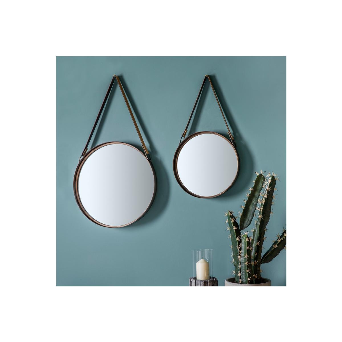 Dimensions W40 x H40 cm and; W30 x H30 cm Set of 2 round mirrors in bronze finish with a faux leather strap. Features. Perfect for wall hanging as a room accessory Set of 2 mirrors. Versatile will suit a number of home decor Faux leather hanging strap. Suitable for any room in the home..