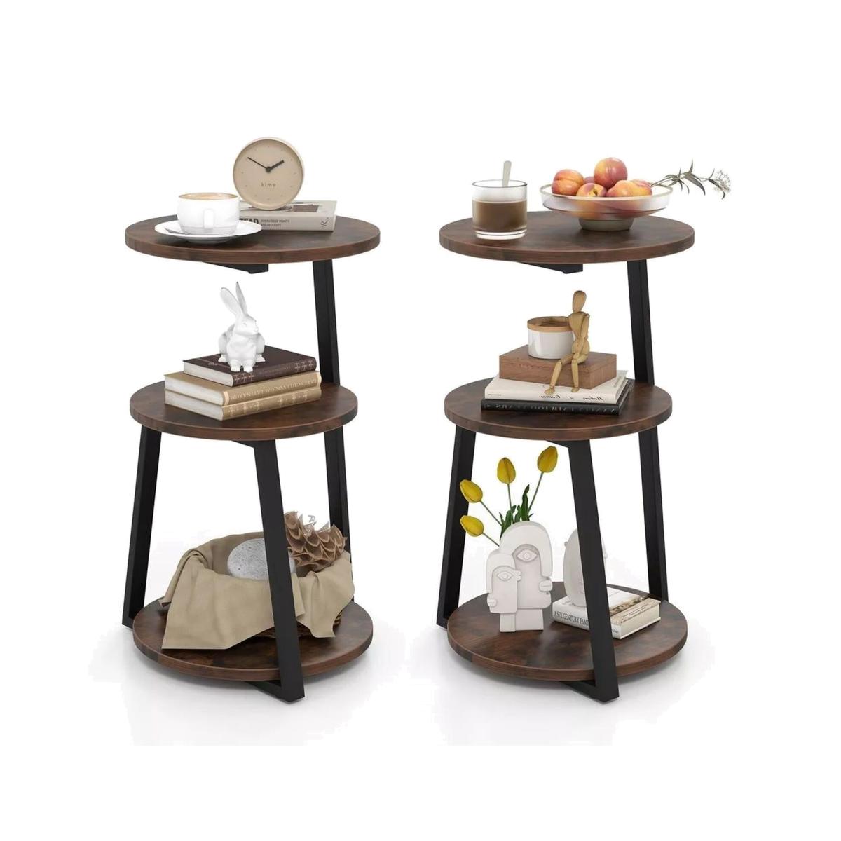 I’m a big fan of these round wooden bedside tables for their compact footprint and clean lines. The dark brown shelves paired with black metal legs suit modern Scandinavian or industrial-inspired bedrooms, and they work equally well in a cosy cottage scheme thanks to their warm timber tones. For styling, use the top shelf for a simple lamp and a small plant or clock, leave the middle tier for your current reads, and reserve the bottom shelf for a woven basket to hide extra throws or bedding. Mixing in white ceramics or a pop of colour on each level will keep the look fresh without feeling cluttered.