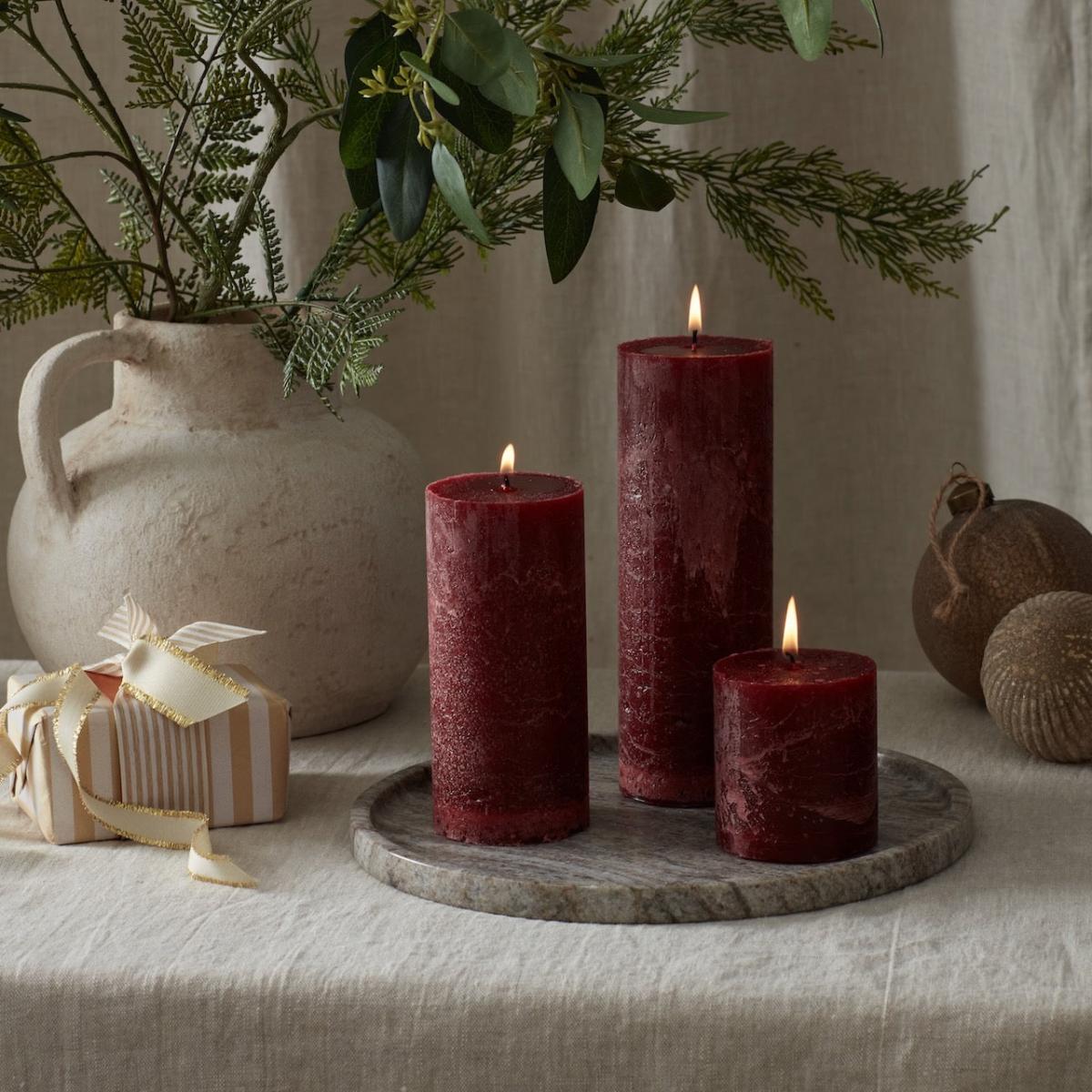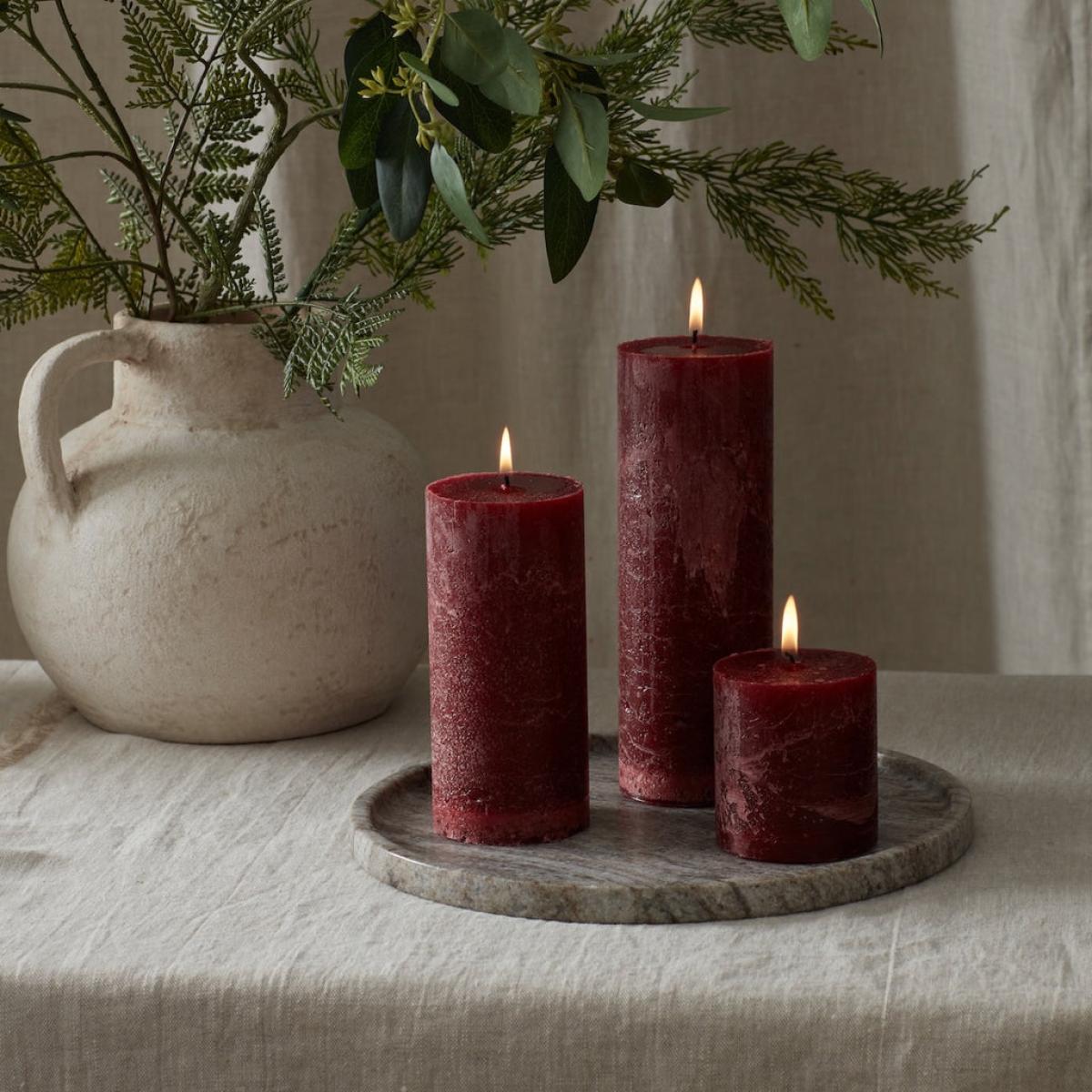 Handmade, these rustic burgundy pillar candles have a beautiful natural finish. Place in a candle tray or lantern and create an atmospheric entertaining space for family & friends.  A beautifully rich tone for a luxurious look.