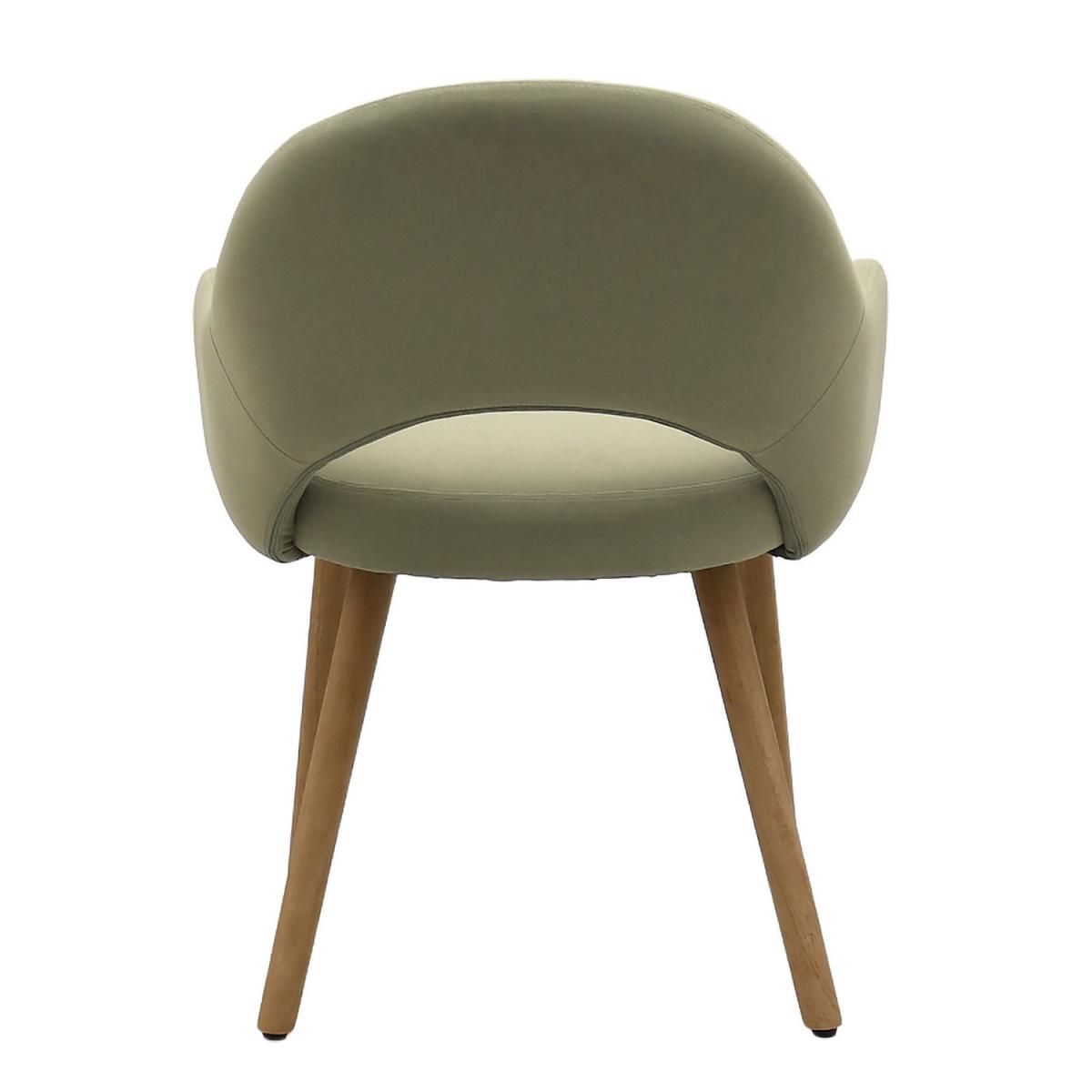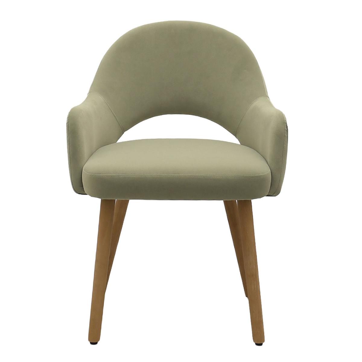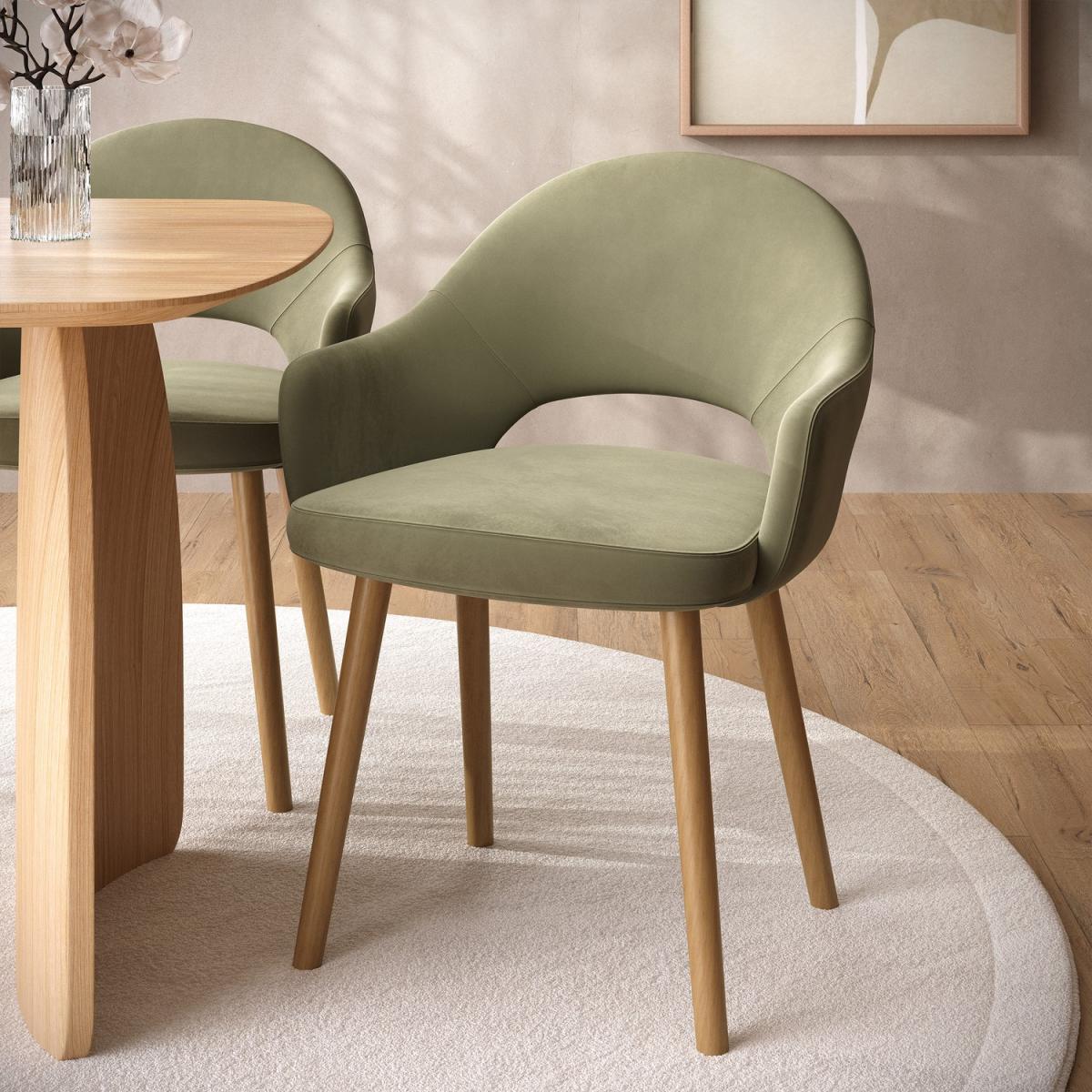 The modern tub chair design adds a touch of elegance to any dining room or space. The sage green velvet brings together rich texture and soothing colour, making it a perfect blend of elegance and warmth. The solid rubberwood legs are stained in a rich oak tone, offering strength, stability and a high-end finish that complements the velvet beautifully. Ideal as dining chairs or stylish occasional seating in bedrooms, living rooms, or offices. The gently curved backrest and padded seat ensure comfort for long dinners or casual gatherings. This pair of Colbie chairs is the ideal combination of style and versatility, suiting a dining room setting or as occasion chairs for bedrooms and more. Sophisticated in their design, they can provide the finishing touch you've been striving for. Upholstered in a sage green velvet and finished off with sleek oak legs, these chairs offer a timeless design and comfortable dining experience.