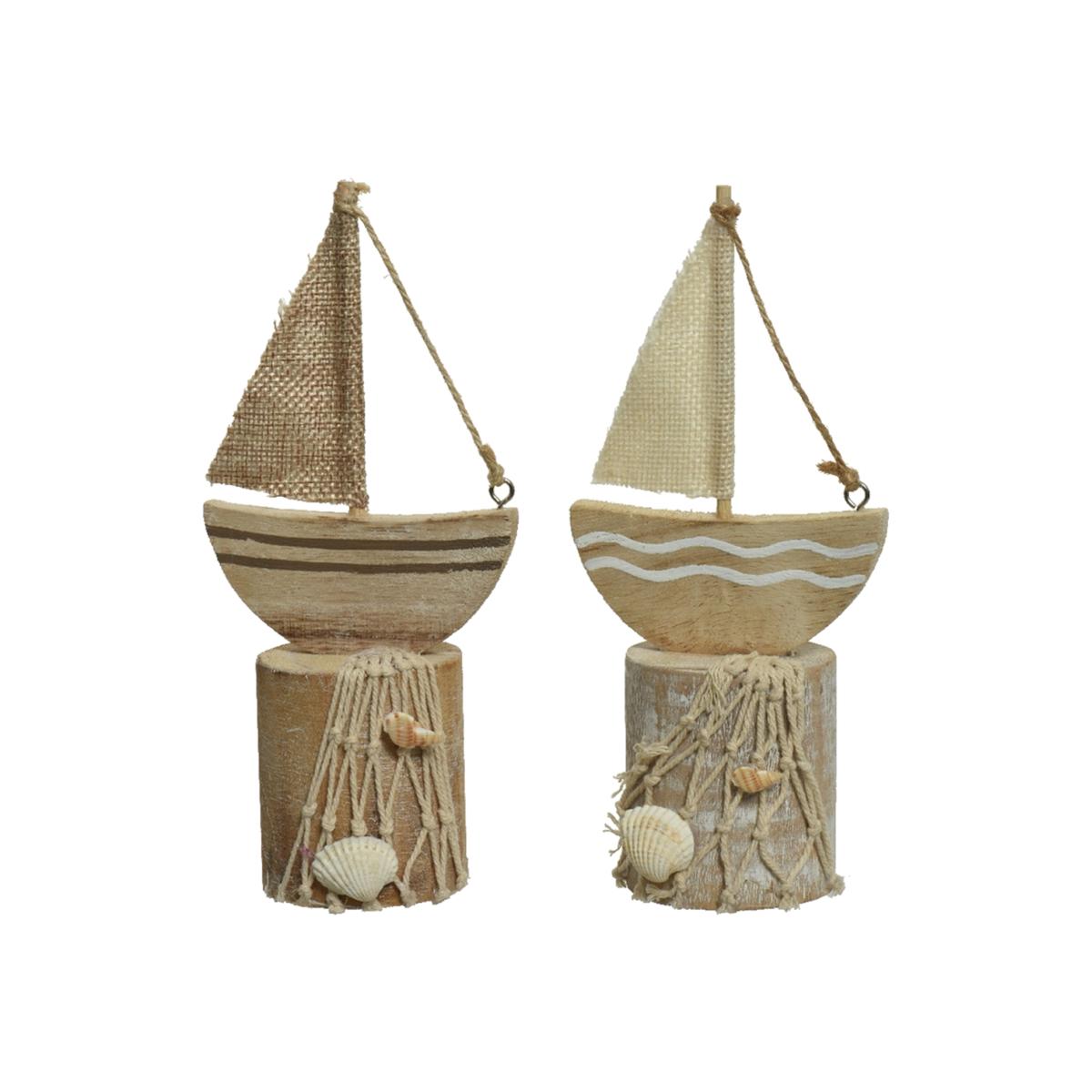 Set of 2 Sailing Boat On Log Ornaments - Neutral