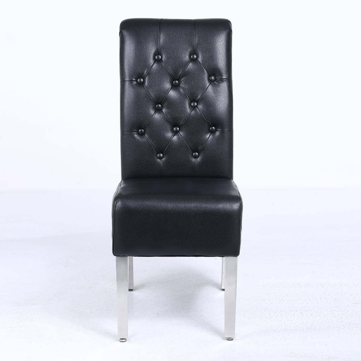 Sara Leather Aire High Back Stunning Soft Padding Dining Chairs with Chrome Legs. Available in 4 different colours Black Brown Grey and Cream. This is one of our Leather Air Popular Range Updated Version with Studs and Knocker at the Back. Thick Cushion padded Dining Chairs in Black Brown Grey and Cream Available for Immediate Dispatch. Product Dimensions Approximately Total Height: 108 cm Seat Height: 50 cm Width: 44 cm Leg Space: 55 cm front to back Leg Space: 41 cm side to side front Seat Width Depth: 44 cm Note Self Assembling Required where 4 legs need to be attached with the main body part along with provided hardware fittings and Tools.