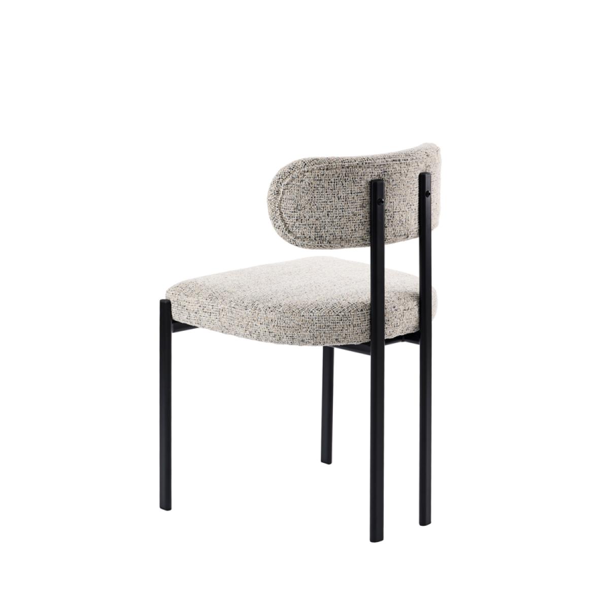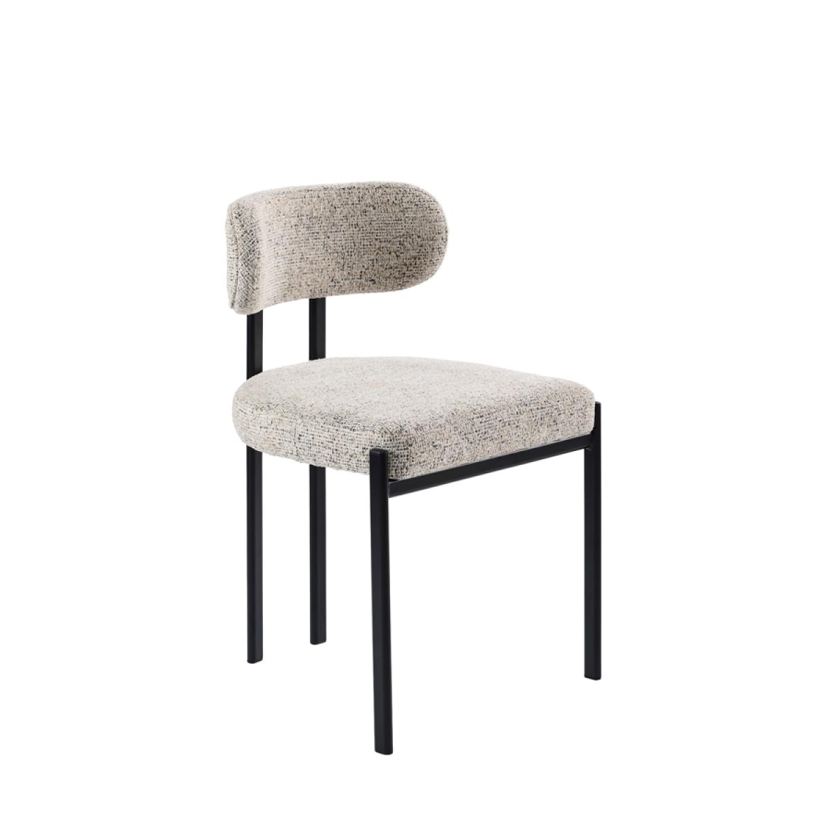 A distinctive, contemporary dining chair with a body-hugging wraparound backrest. Foam-padded seat and backrest, upholstered in a comfortable multi-tone chenille fabric. Steel frame finished with durable black powder-coating. Minimal assembly required — approximately 5 minutes.