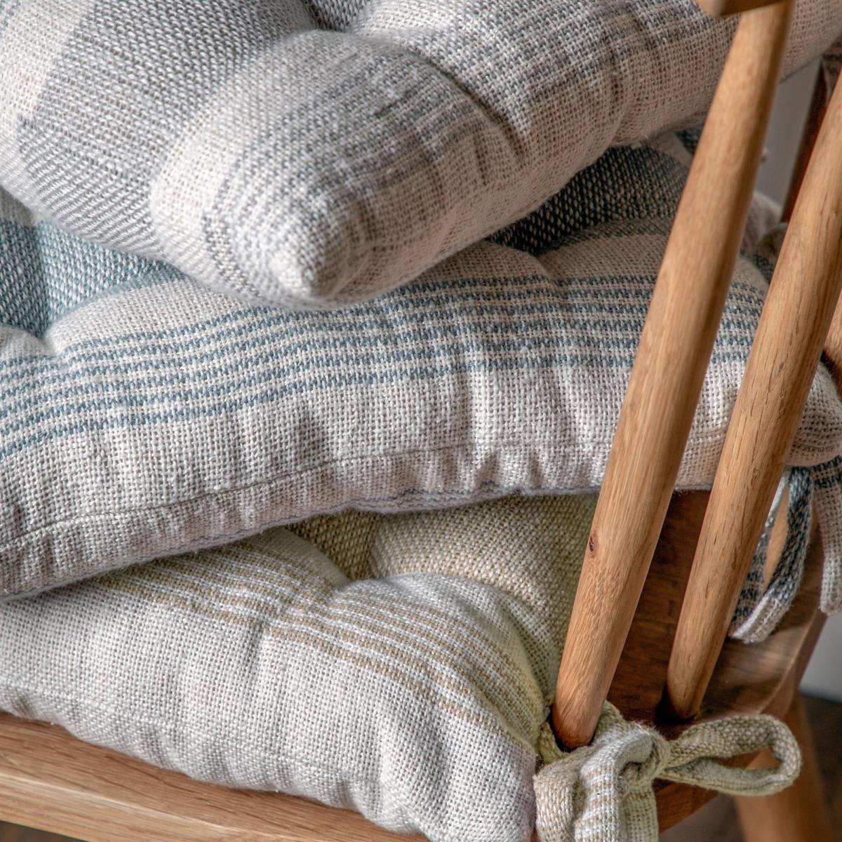Transform your tired and dull chairs with this set of 2 Simply Organic Seat Pads. Made from woven organic cotton and filled with durable polyester filling, these seat pads will be sure to provide you with a plump and comfortable seat while the neutral colour options and simple stripe design create a delightful appearance. With tie fastenings, these seat pads will stay securely attached to your chair and come presented in a neat cream herringbone ribbon.