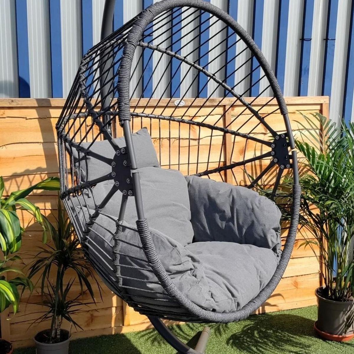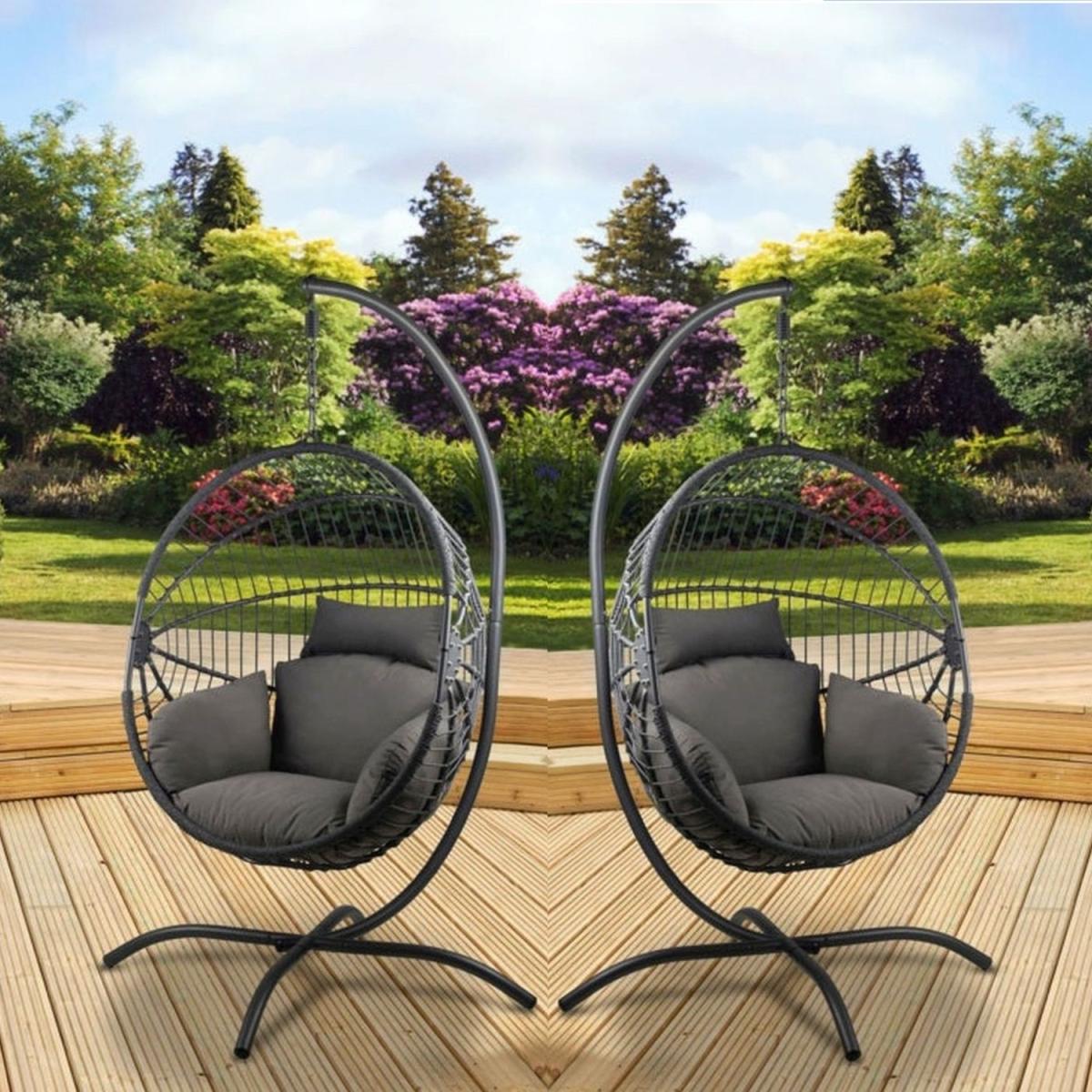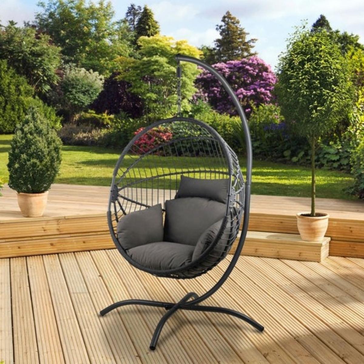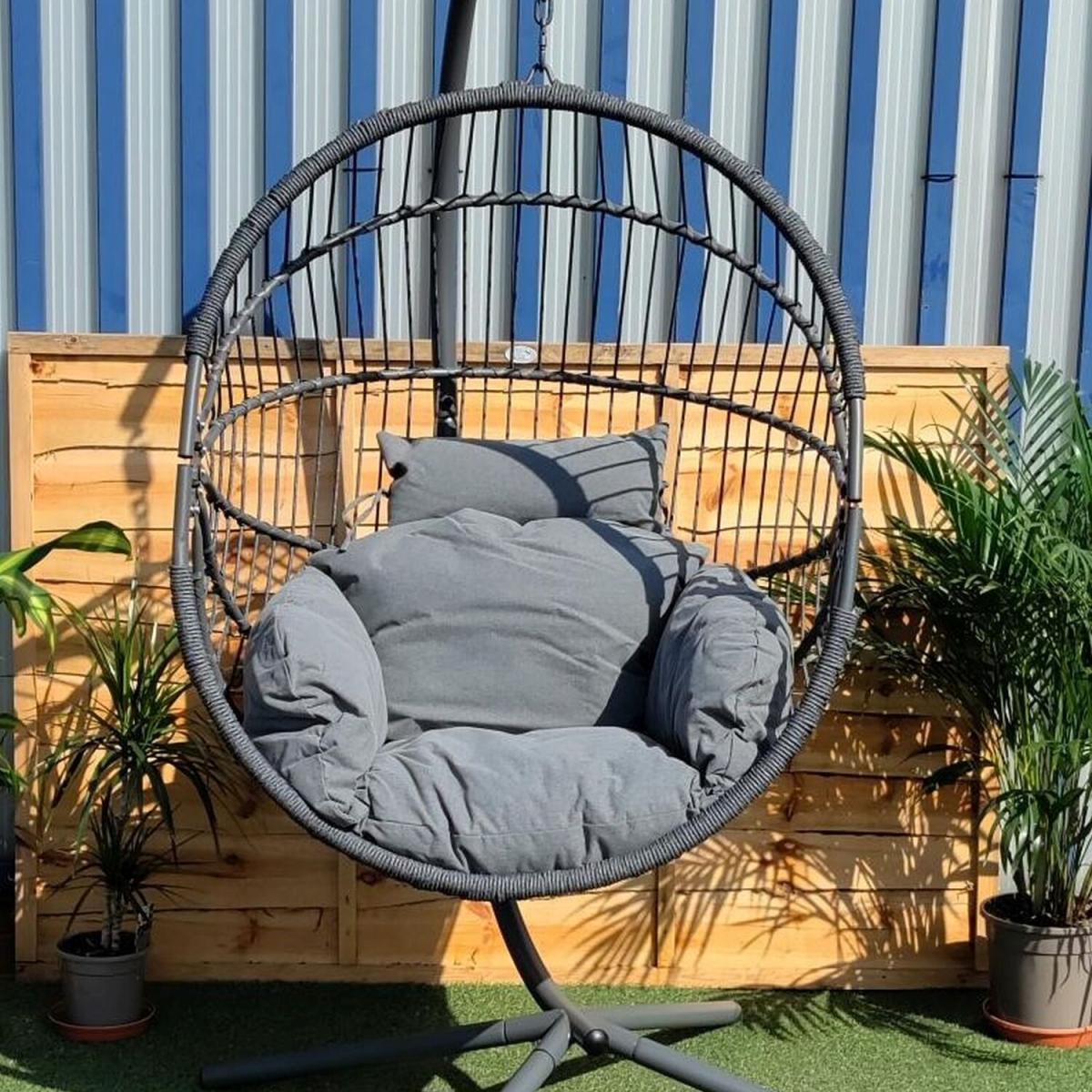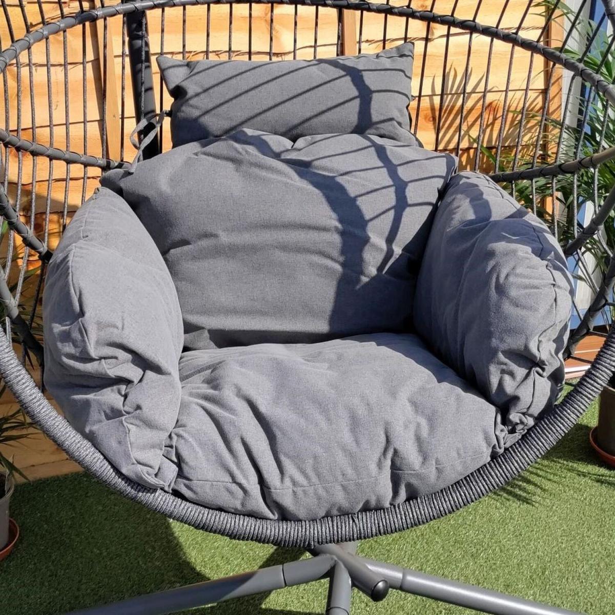 Relax & unwind in supreme comfort with this deluxe Bali Hanging Swing Egg Chair. Suited for both indoor & outdoor use, this freestanding hanging chair features a cocoon-shaped hammock seat complete with an extra thick padded cushion and headrest for extra comfort. The grey powder-coated steel collapsible frame structure enables easy storage all year around, and the hand-woven synthetic rattan ensures low maintenance is needed providing elegance and comfort throughout the year. Designed for single-person use with a maximum weight capacity of 120kg. Measuring (base) 134cm x 205cm (basket) 120cm x 97cm x 68cm, provides a generous-sized relaxer chair Ideal for any garden or patio area, conservatory, bedroom or even a home living room. Just sit back and let the soothing gentle swinging motion help you to relax in style. Assembly is required but everything you need is included to help you get set up and unwind in no time at all! Two-man lift advised as boxed weight is approximately 27kg.