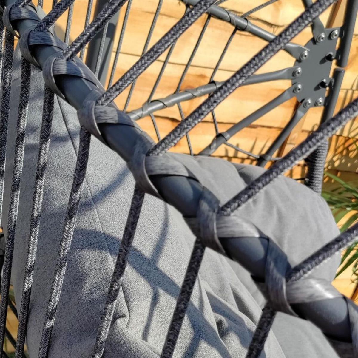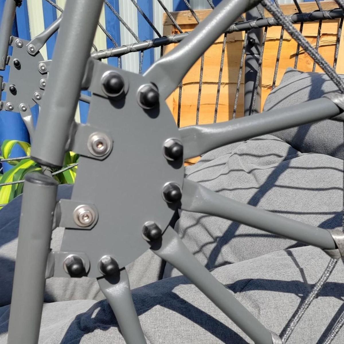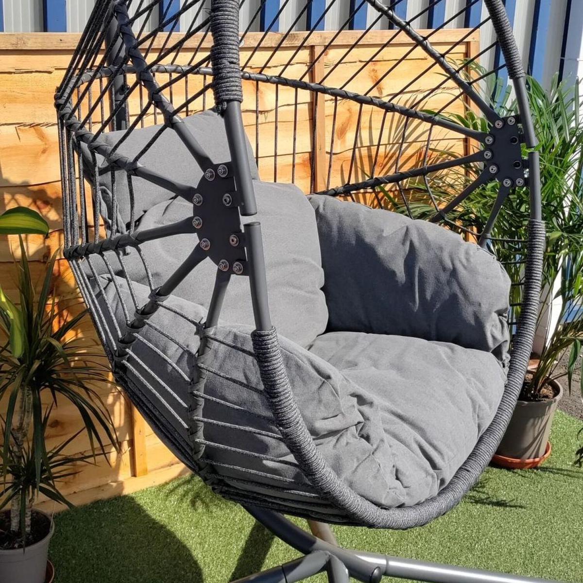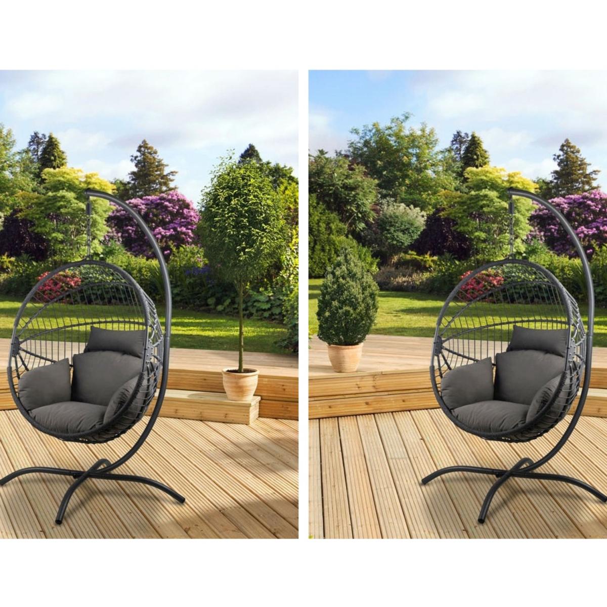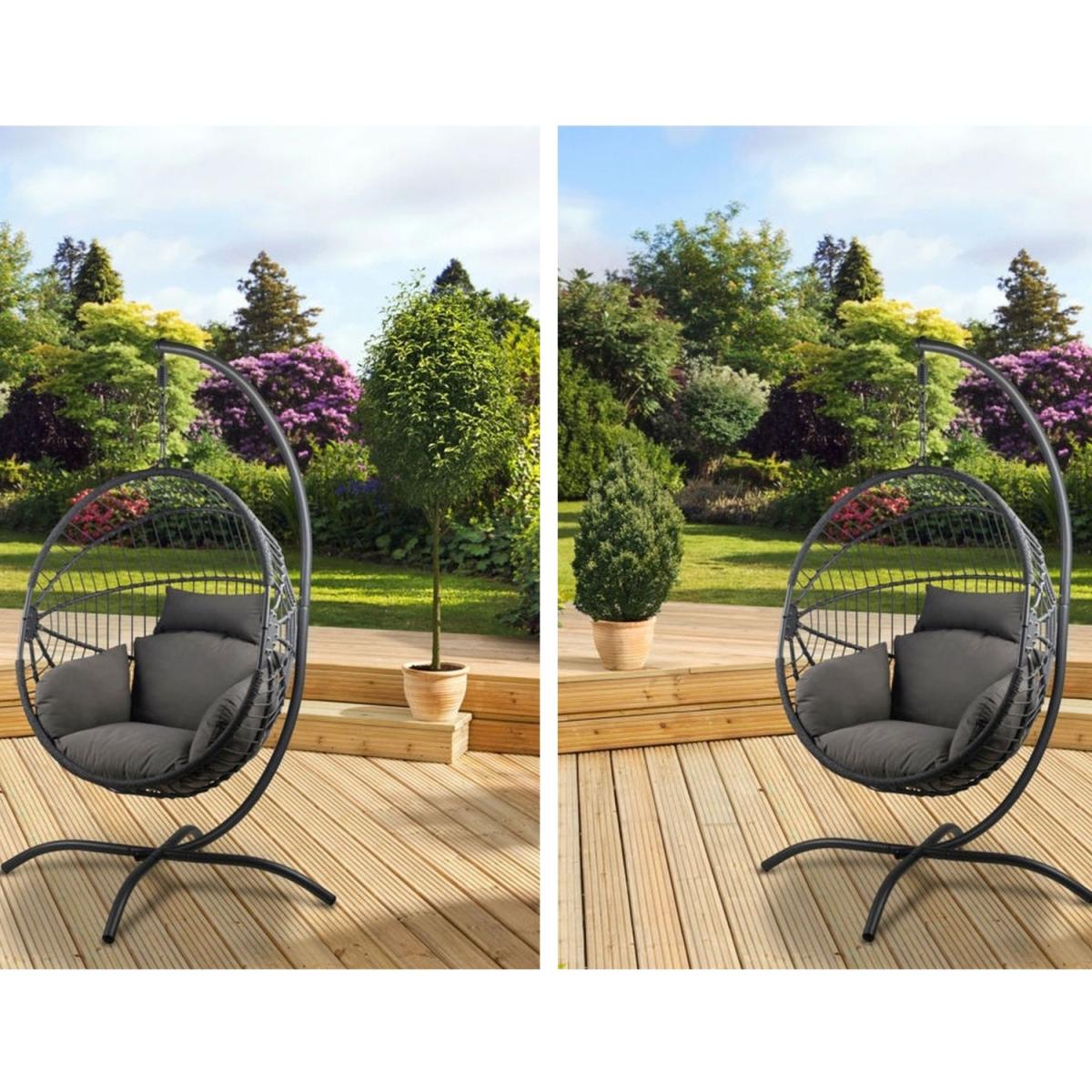 Relax & unwind in supreme comfort with this deluxe Bali Hanging Swing Egg Chair. Suited for both indoor & outdoor use, this freestanding hanging chair features a cocoon-shaped hammock seat complete with an extra thick padded cushion and headrest for extra comfort. The grey powder-coated steel collapsible frame structure enables easy storage all year around, and the hand-woven synthetic rattan ensures low maintenance is needed providing elegance and comfort throughout the year. Designed for single-person use with a maximum weight capacity of 120kg. Measuring (base) 134cm x 205cm (basket) 120cm x 97cm x 68cm, provides a generous-sized relaxer chair Ideal for any garden or patio area, conservatory, bedroom or even a home living room. Just sit back and let the soothing gentle swinging motion help you to relax in style. Assembly is required but everything you need is included to help you get set up and unwind in no time at all! Two-man lift advised as boxed weight is approximately 27kg.