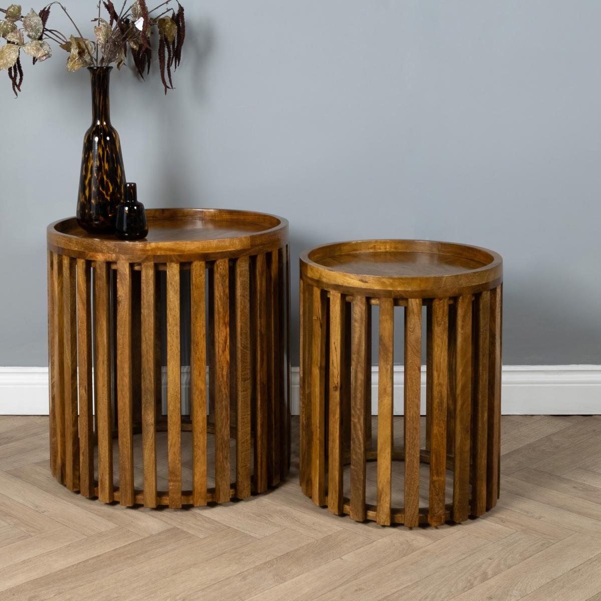 We present this Striking set of Mango Wood Circular Tables from Elm Home and Garden, a perfect combination of classic craft with contemporary panache. Constructed solely from rugged yet refined solid Mango wood free from any veneers, they add an air of natural allure certain to beautify any home.