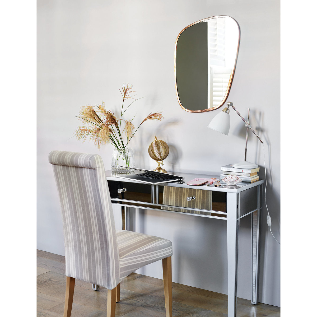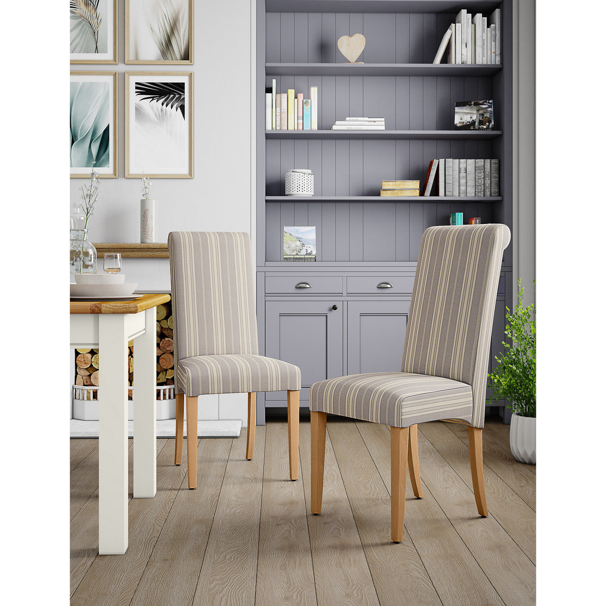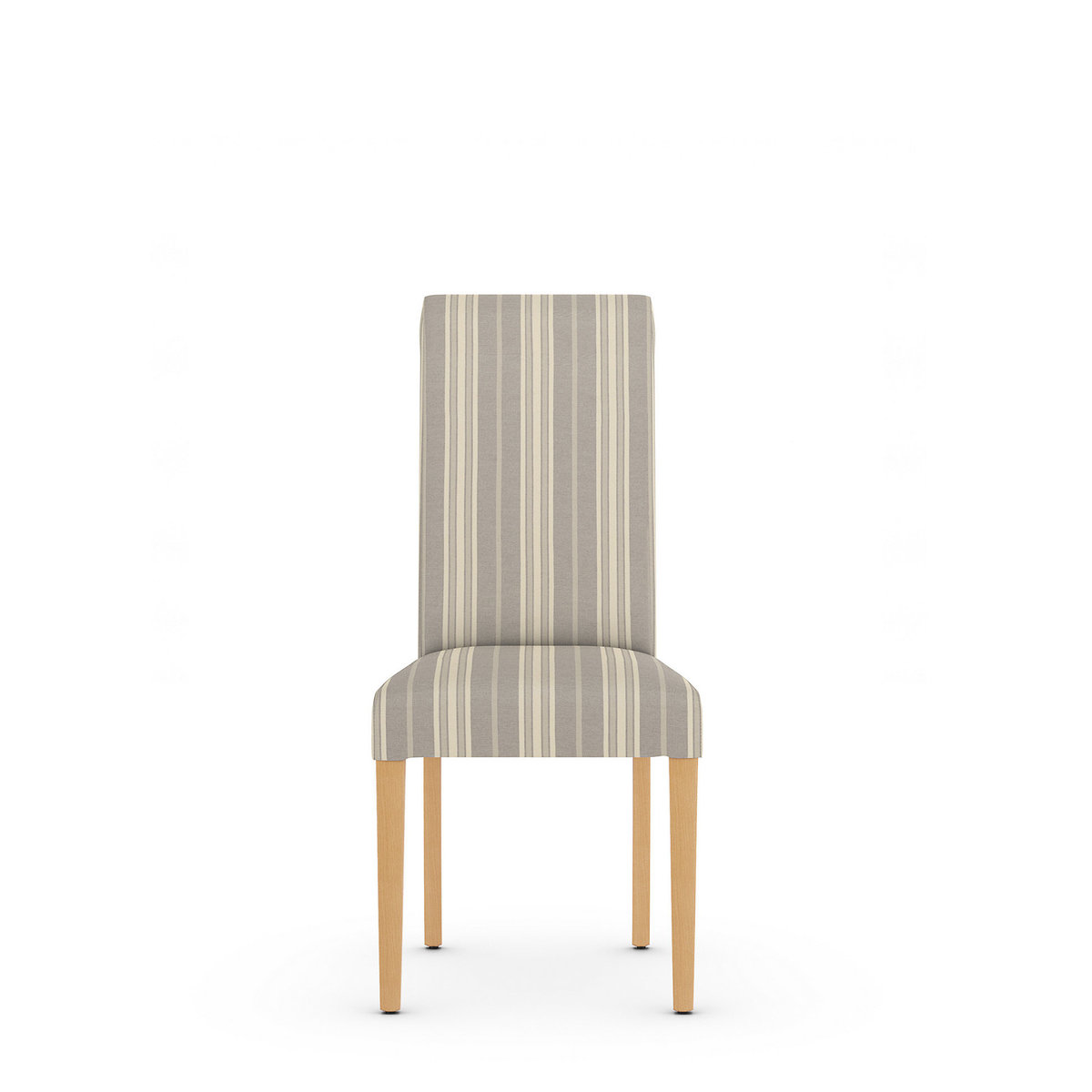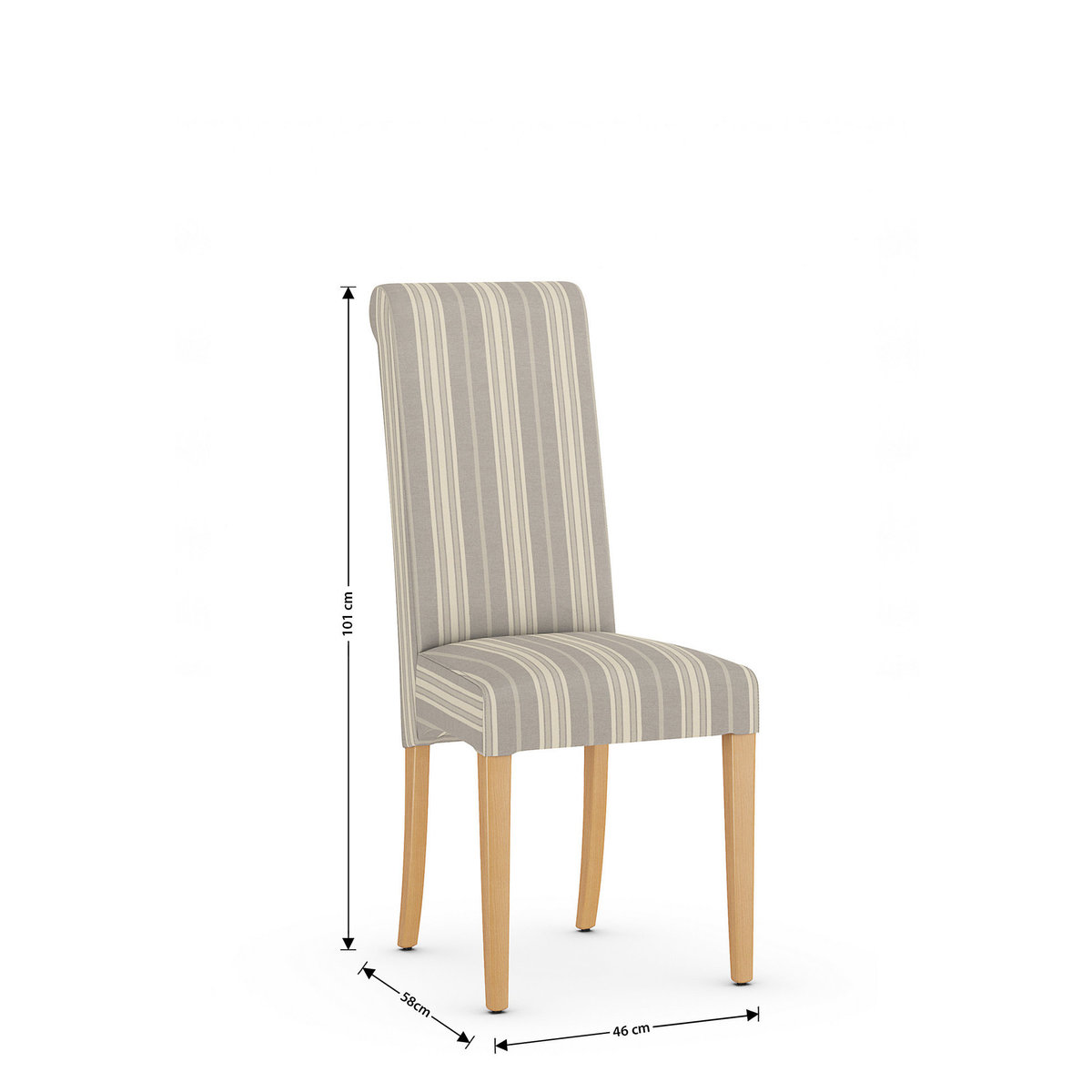 These dining chairs are upholstered in a modern striped print, putting a fresh twist on the classic Parsons chair shape. Fabric cover over solid beech frame. Thickly padded seat for added comfort. High curved back with a squared-off profile. Made from sustainable wood. Supplied as a pair. We’re so confident our furniture is built to last, our industry-leading guarantee covers any manufacturing failure on all furniture. That’s our promise, and why our furniture comes with a 10-year guarantee that you can trust. Excludes: outdoor furniture and any issues that are a result of normal wear and tear, improper care or accidental damage.