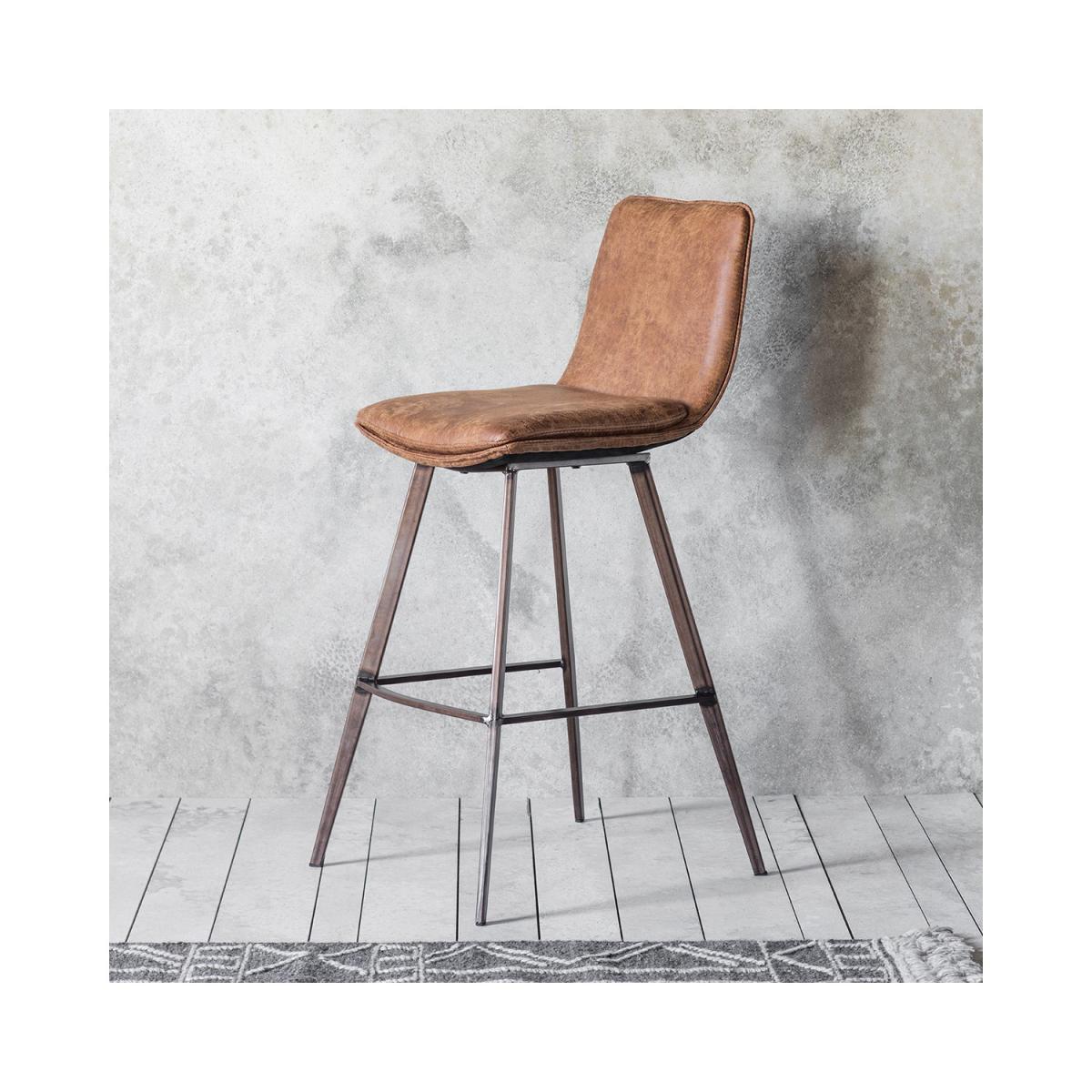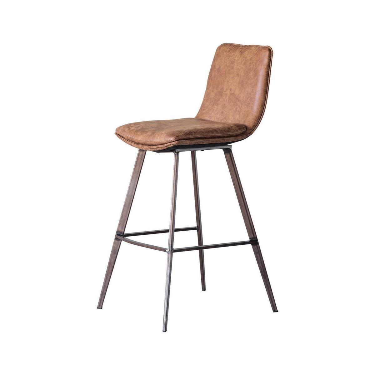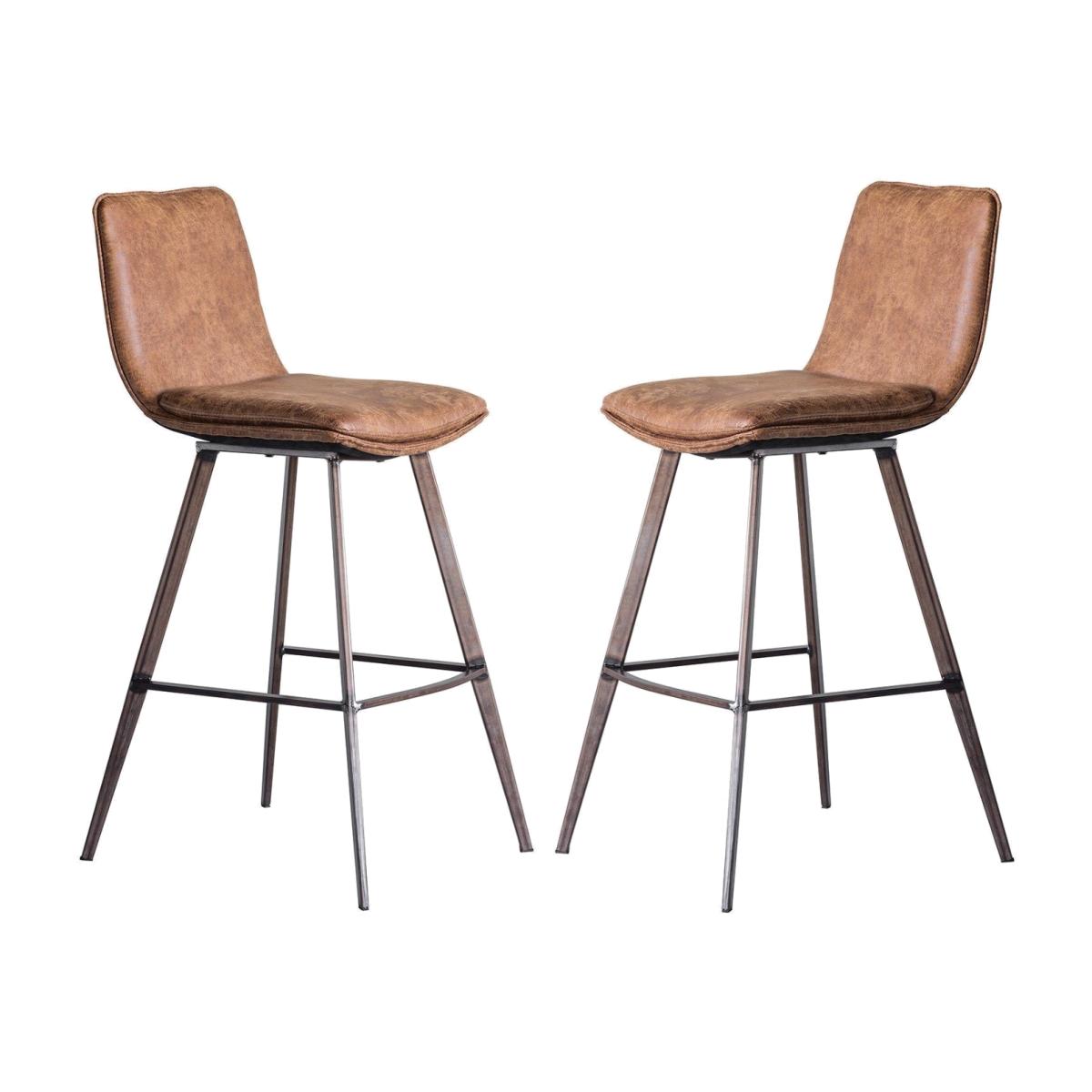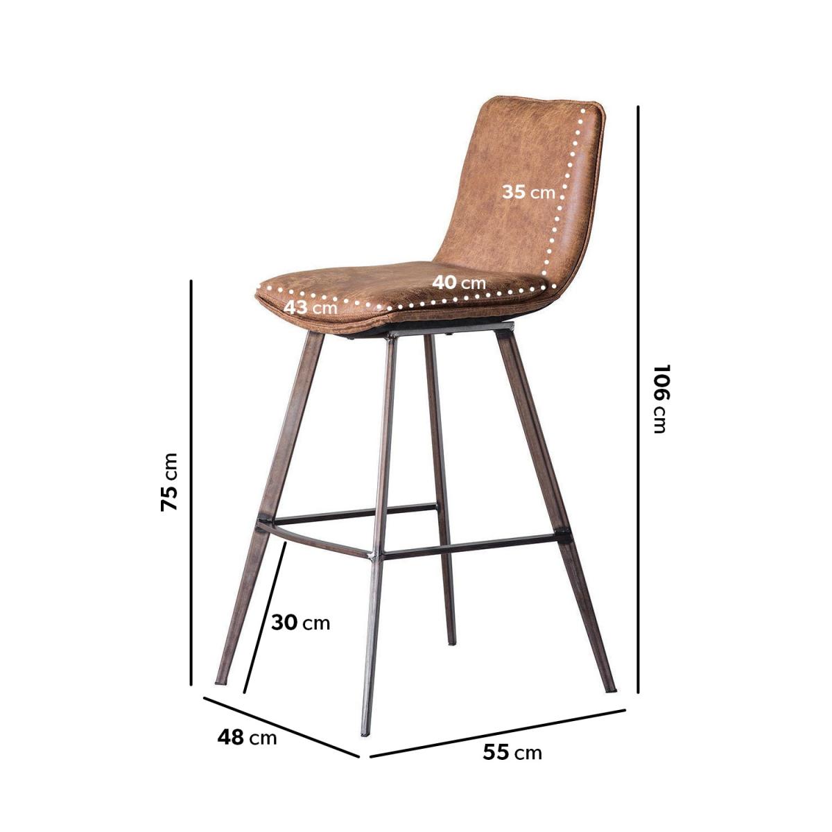 Set of 2 leather bar stools Brown vintage weathered look leather Suitable for bar table heights of 104-109cm, please measure before purchasing Cushioned seat Metal frame with foot rest No assembly required Maximum load weight: 120kg
