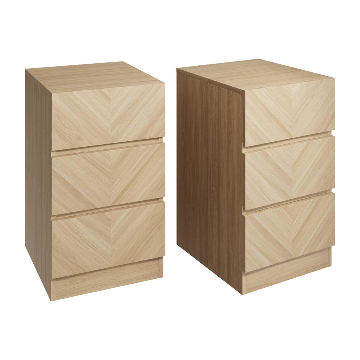 A must-have in any bedroom, this stylish bedside table is a must-have. Its sleek herringbone design is accented with a warm oak wood effect finish while its minimalist handles offer a modern twist. Finished with metal runners, this 3 drawer bedside table is ideal for housing linens, books and more.