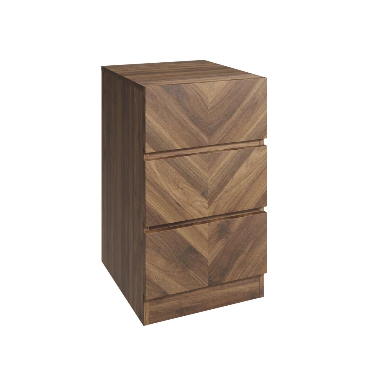A must-have in any bedroom, this stylish bedside table is a must-have. Its sleek herringbone design is accented with a warm walnut wood effect finish while its minimalist handles offer a modern twist. Finished with metal runners, this 3 drawer bedside table is ideal for housing linens, books and more.