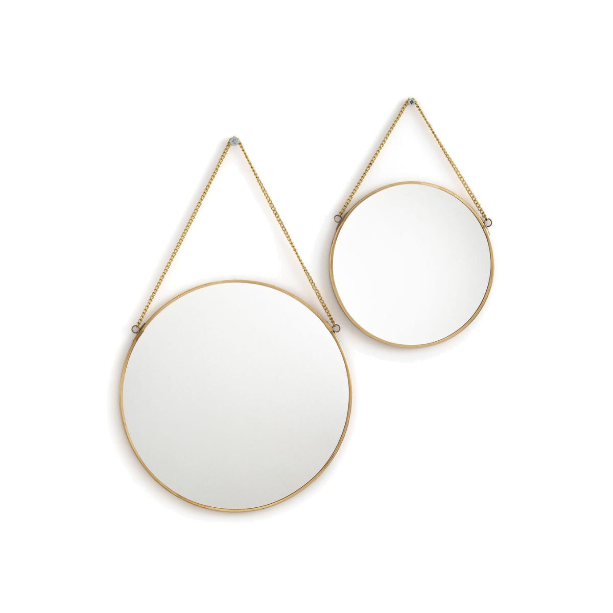 The set of 2 Uyova round brass mirrors. Play with different looks in your home with this set of 2 different sized mirrors. Product Details • Brass or black steel metal structure • Hanging mirrors with chain (hook not supplied) • Screws and plugs not included • Sold as set of 2 different sizes. Dimensions • Size 1: Diameter 18cm • Size 2: Diameter 25cm. Quality Info • Hand-crafted, each piece is unique: colours and dimensions may vary from product to product