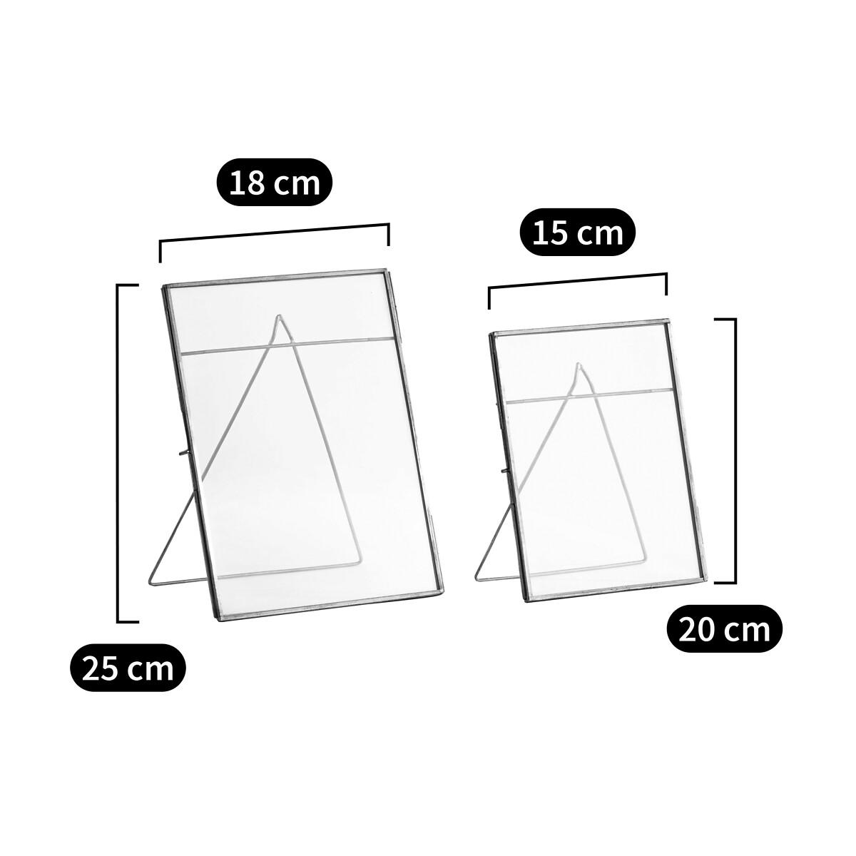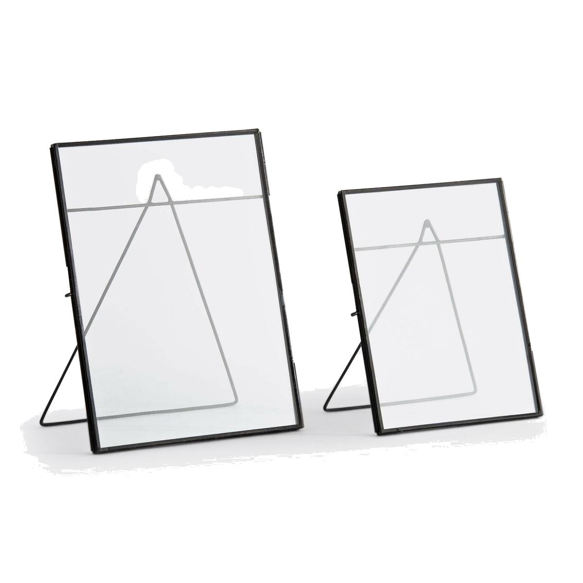 The 2 Uyova metal frames. Available in either a black or brass finish, these simple frames are chic and elegant!Product Details • Metal (brass or black finish) and glass standing photo frames • Sold in sets of 2. Dimensions • Size 1: L18 x H25cm • Size 2: L15 x H20cm