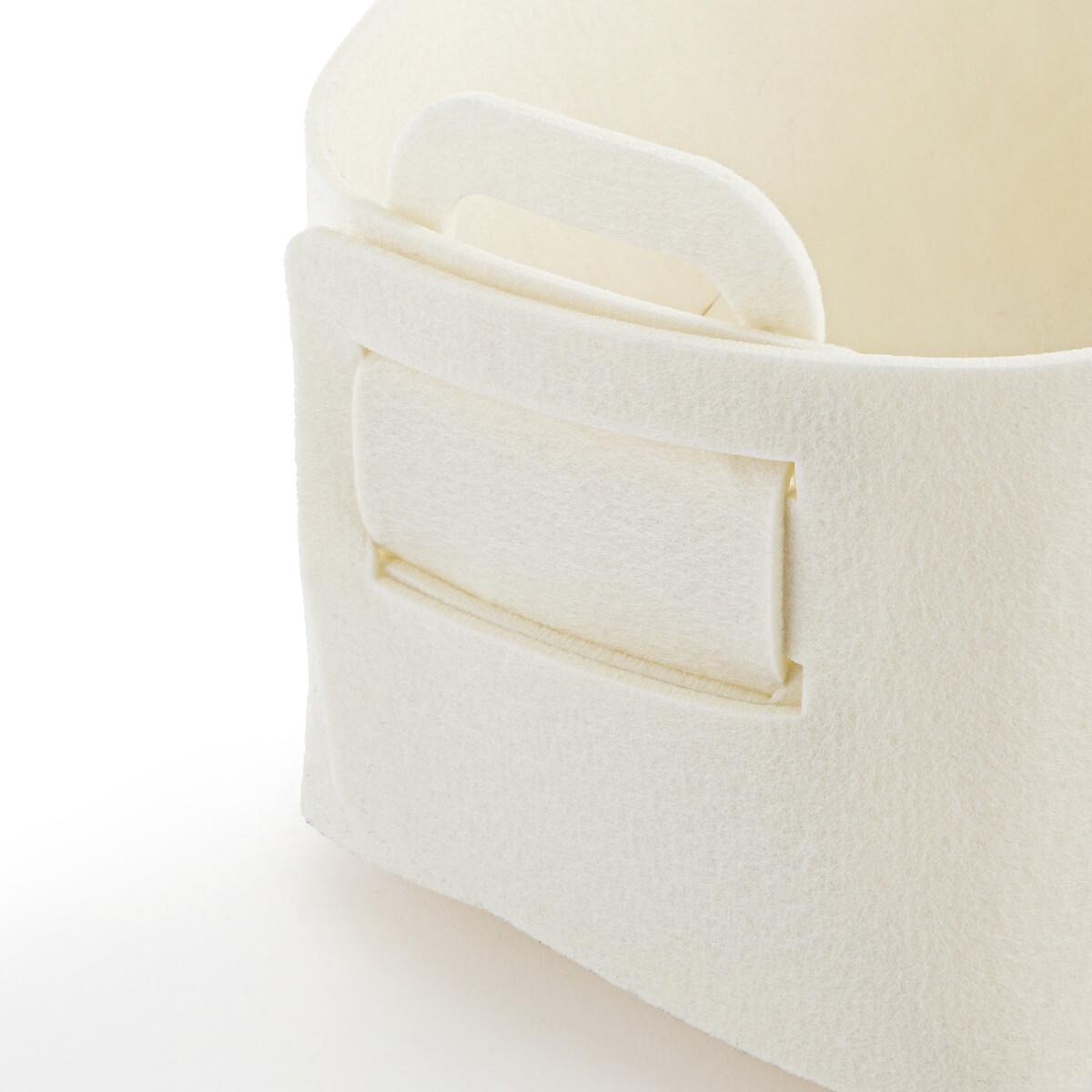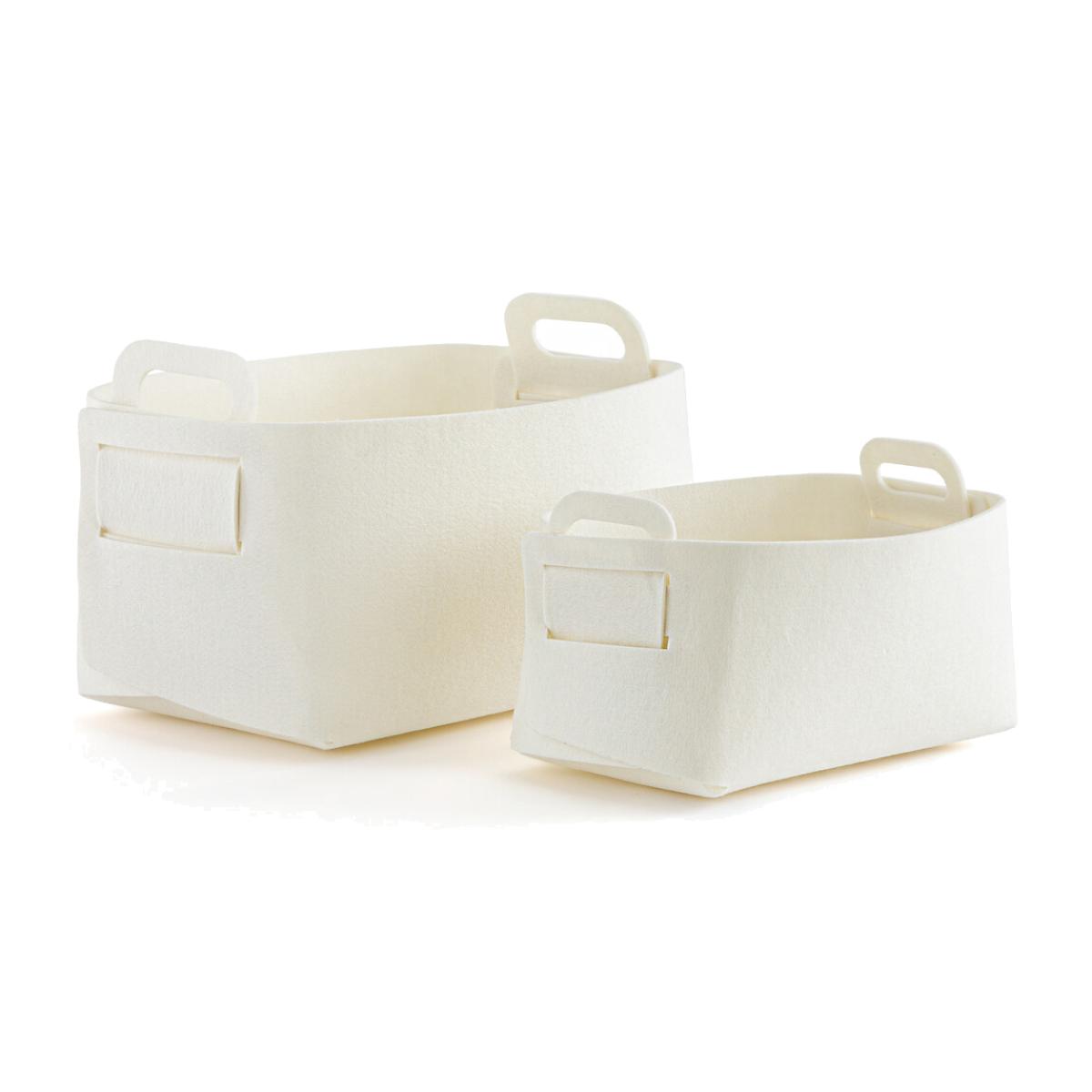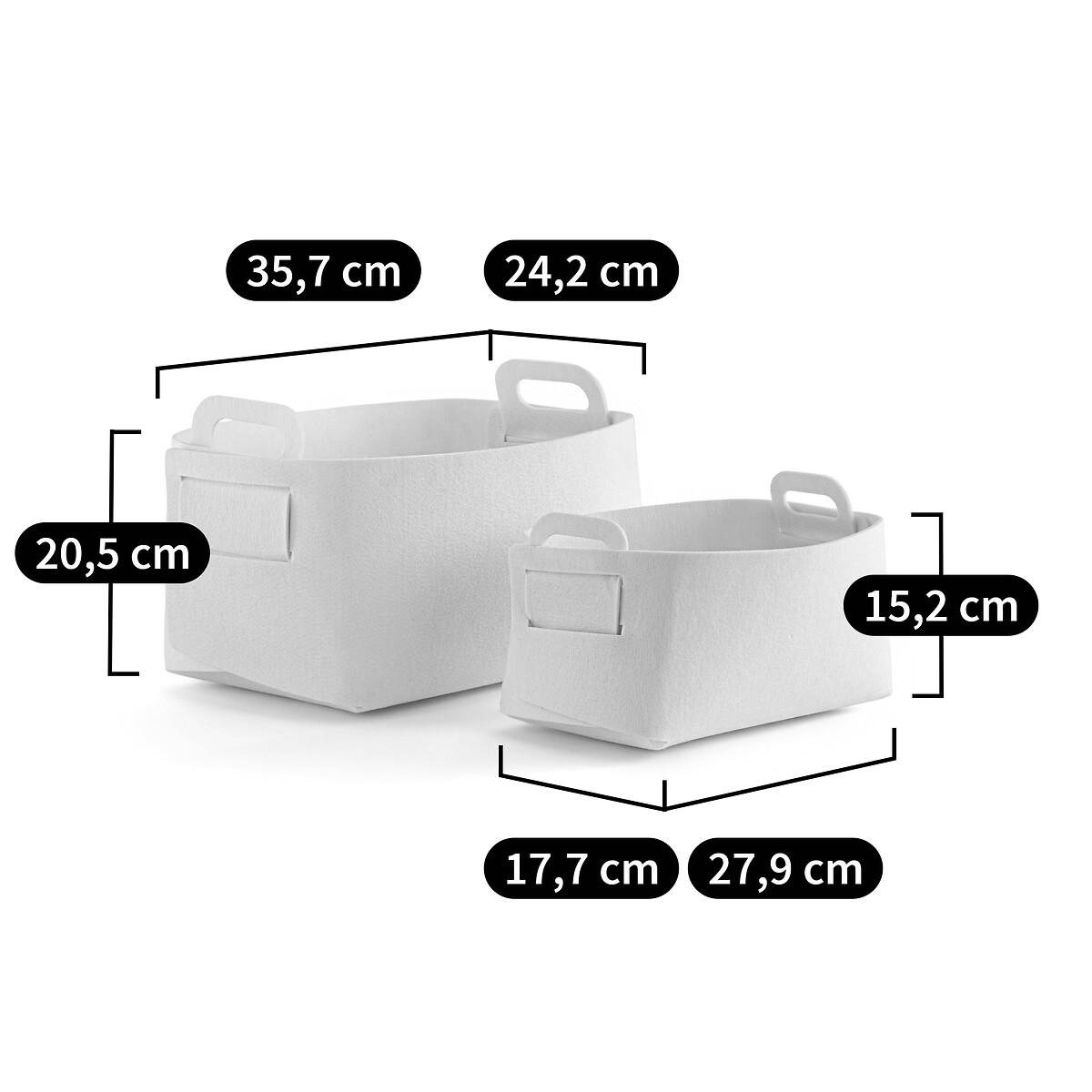 Clean design, Nordic spirit: the two Veltinis felt baskets are as beautiful as they are practical. To store everything, in every room: lingerie, comforters, household linen, beauty products... Product Details • 100% polyester felt • Delivered flat, to assemble yourself • Set of 2 different sizesDimensions. Size 1 • Length: 35.7cm • Width: 24.2cm • Height: 20.5cm. Size 2 • Length: 27.9cm • Width: 17.7cm • Height: 15.2cm Parcel dimensions and weight:1 parcel • L39 x H20.7 x D25cm. 1kg