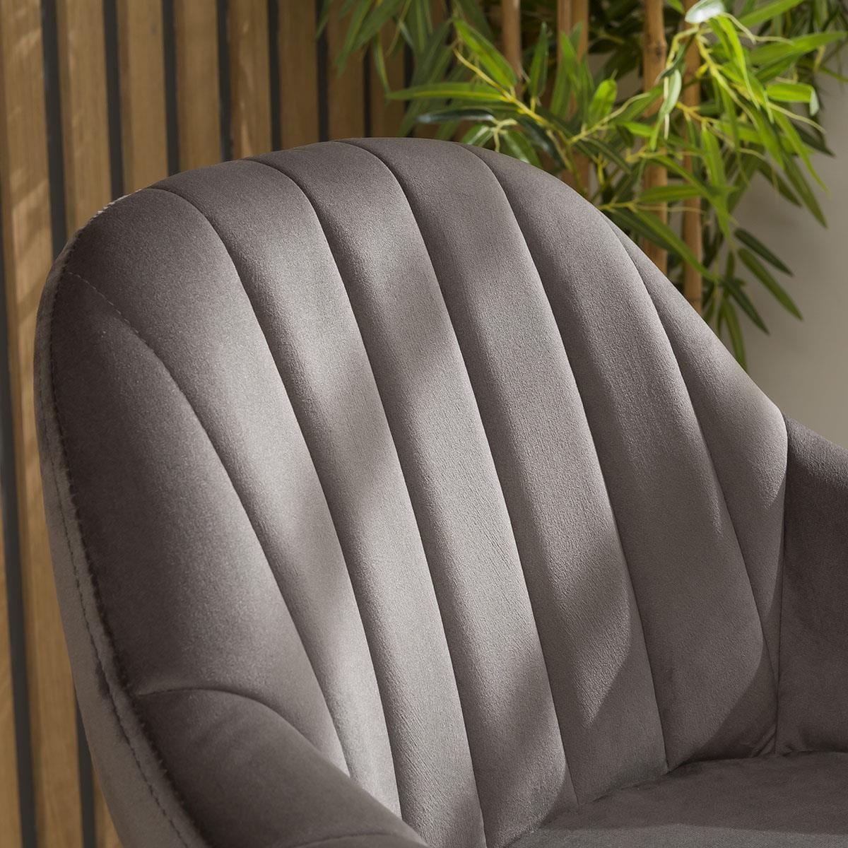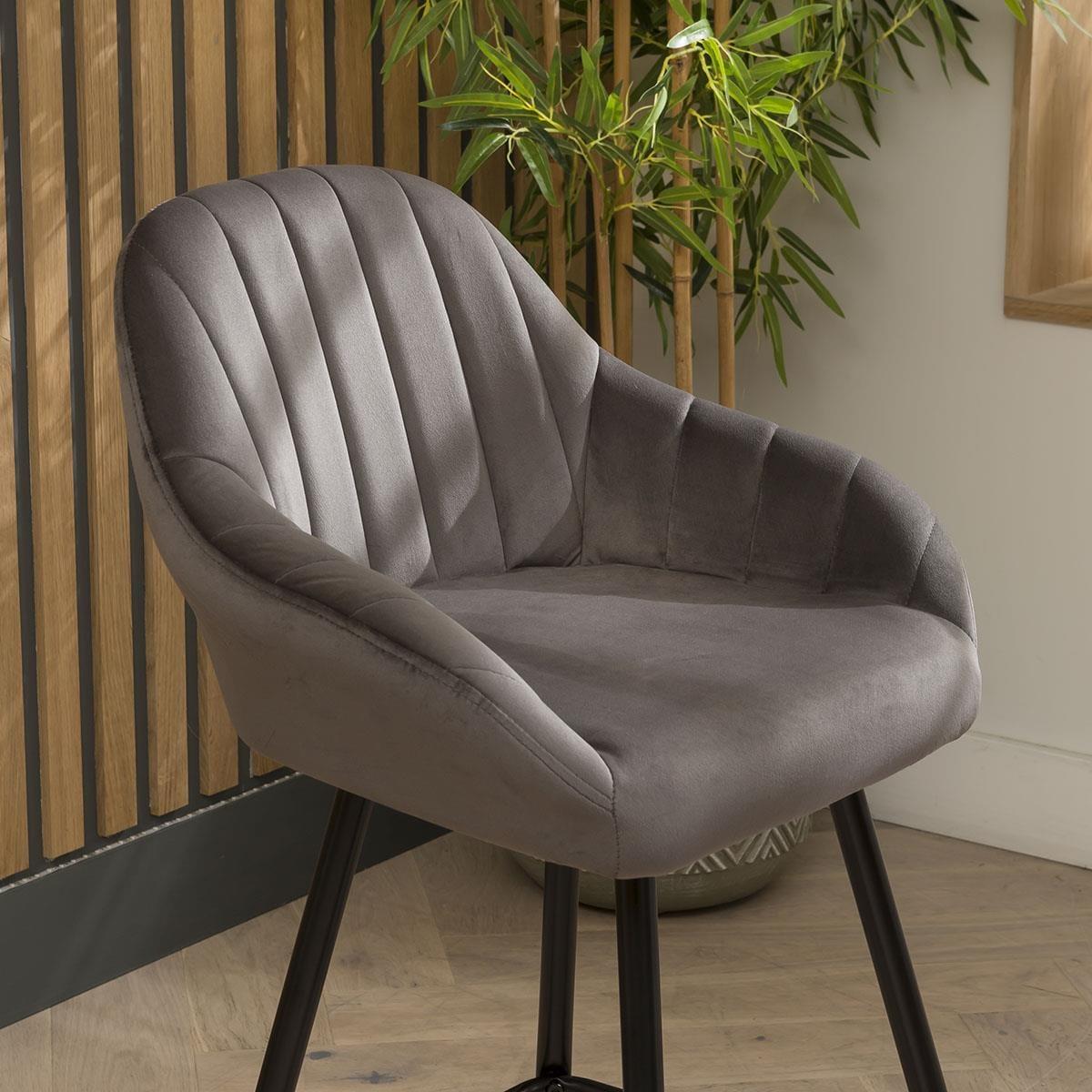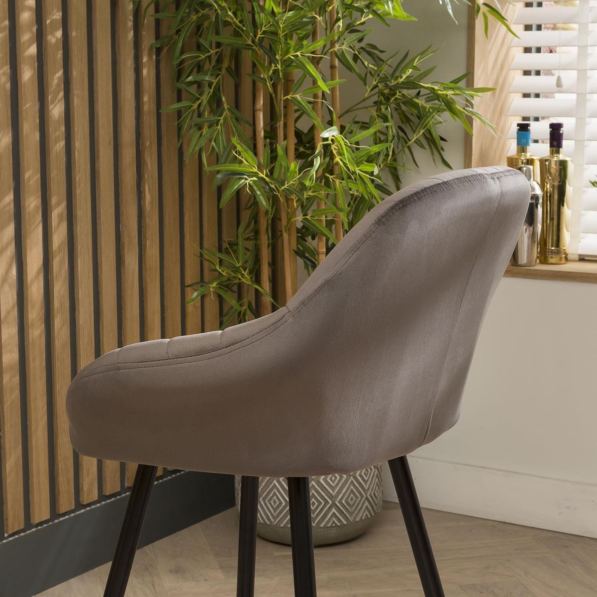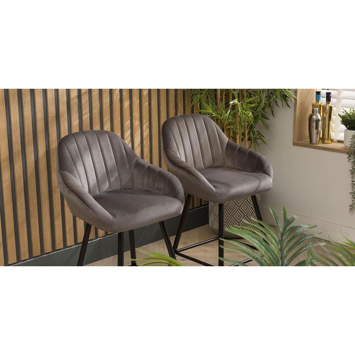 Elevate your home bar or kitchen island with this set of 2 Harper Rich Grey Velvet Bar Stools with Backs and Quilted Line Detailing. The modern bar stools are crafted with attention to detail, the stools feature a luxurious rich grey velvet upholstery on the seat and backrest with sleek black metal legs and footrest. The Quilted Line Detailing on the seat not only adds a touch of elegance but also provides extra cushioning for unparalleled comfort during long gatherings or quick meals. The wrap-around style low arms offer a sense of security while you relax, making this bar stool perfect for leisurely chats with friends or enjoying a morning cup of coffee. Designed for durability and aesthetic appeal, the black metal legs offer a modern contrast to the plush velvet upholstery. The smooth finish on the legs not only complements the overall design but also ensures stability and support. The integrated footrest adds an extra layer of comfort, allowing you to fully unwind without any compromise. Upgrade your space with this set of rich Grey Velvet Bar Stools with backrests, Quilted Line Detailing, and sleek black metal legs. Whether you're entertaining guests or enjoying your daily meals, this bar stool provides the perfect blend of style, comfort, and functionality. W53cm D49cm H92cm Seat Height 66cm Set of 2 kitchen bar stools