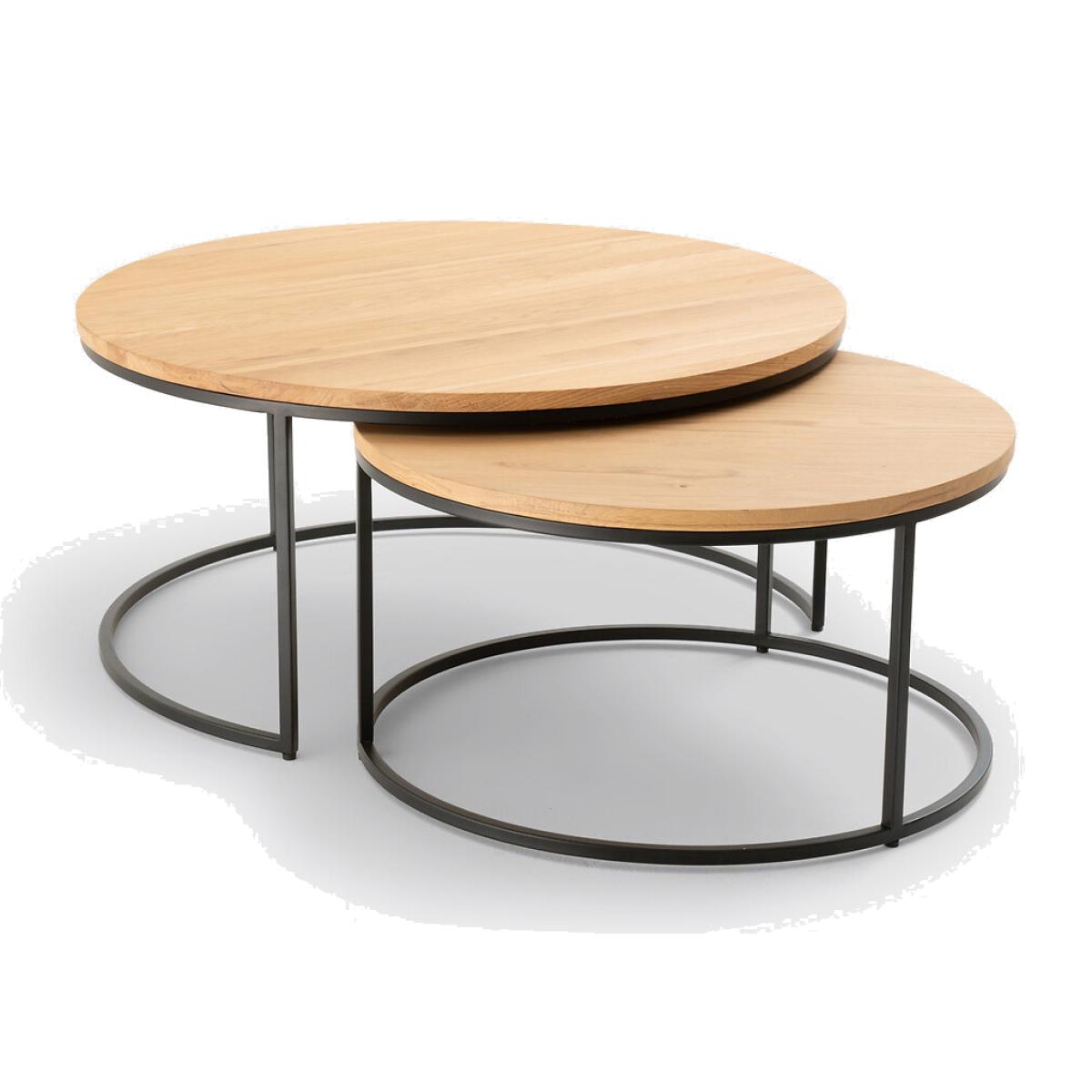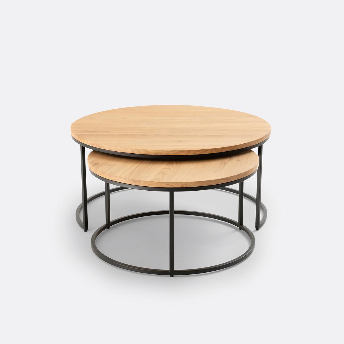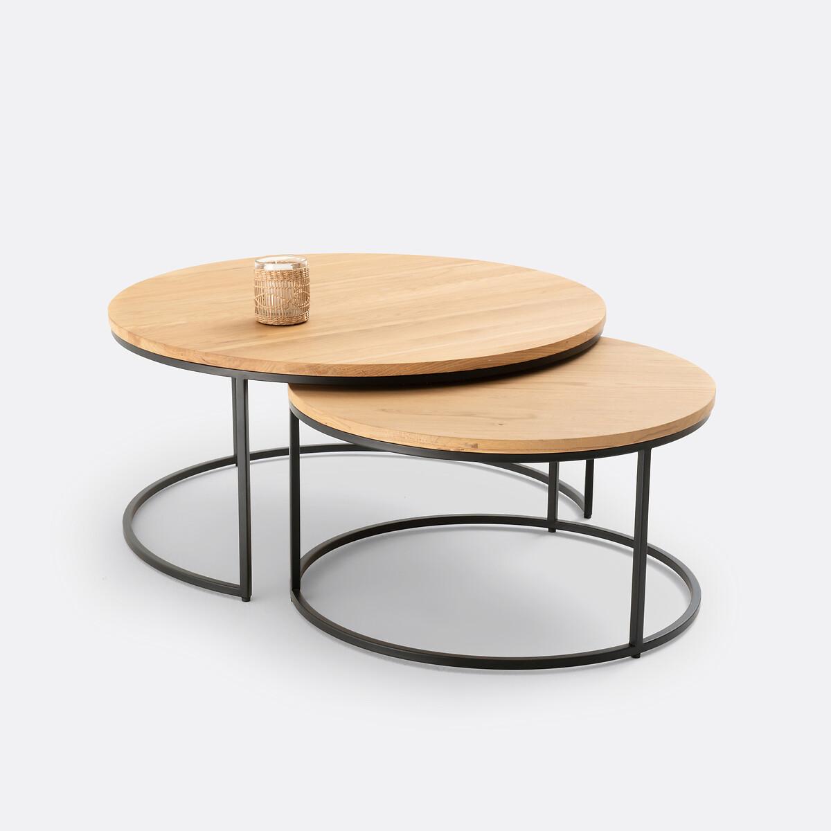 Perfect combination of oak and metal! These round coffee tables will look great in any style of living room. Created by La Redoute Interiors. Product Details • FSC® certified solid oak top, colourless nitrocellulose varnish finish. Thickness 2.2cm • Black painted steel legs, epoxy finish • Polypropylene glidesDimensionsOverall. Small table • Diameter: 70cm • Height: 37.2cm. Large table • Diameter: 90cm • Height: 42cm • WOOD FROM SUSTAINABLY MANAGED FORESTS. FSC® certified wood comes from forests that are environmentally, socially and economically well managed. Dimensions and weight of parcel • L97.5 x H47.5 x D98.5cm • 32.5kg