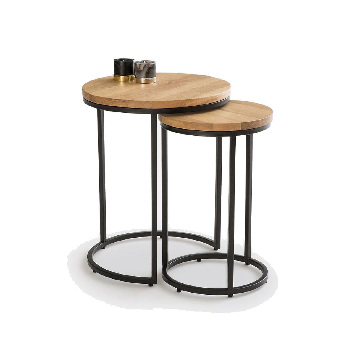 Vova nest of 2 side tables. Perfect combination of oak and metal for a sober tone: beautifully rounded for an aesthetic and space-saving shape, they will soon find a place in your home. Product Details • Solid oak top, colourless nitrocellulose varnish finish. FSC® certified wood • Black painted steel legs, epoxy finish. • Plastic pads on feet. Dimensions • Large: Diameter 45 x H55cm. • Small: Diameter 35 x H50cm. • Tabletop thickness: 2.2cm. Delivery:Sold pre-assembled. It will be delivered to your door. Note! Please check that all access points are large enough to accommodate your delivery (doors, stairs, lifts). • WOOD FROM SUSTAINABLY MANAGED FORESTS. FSC® certified wood comes from forests that are environmentally, socially and economically well managed. Parcel dimensions and weight:1 parcel. • L51 x H62 x D51cm. • 15.6kg.