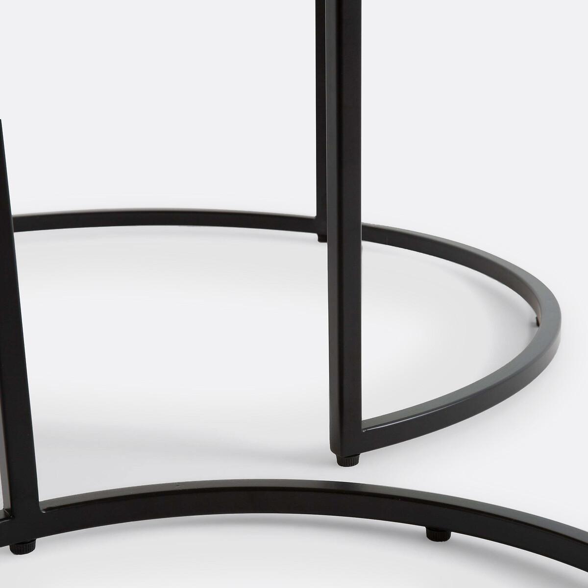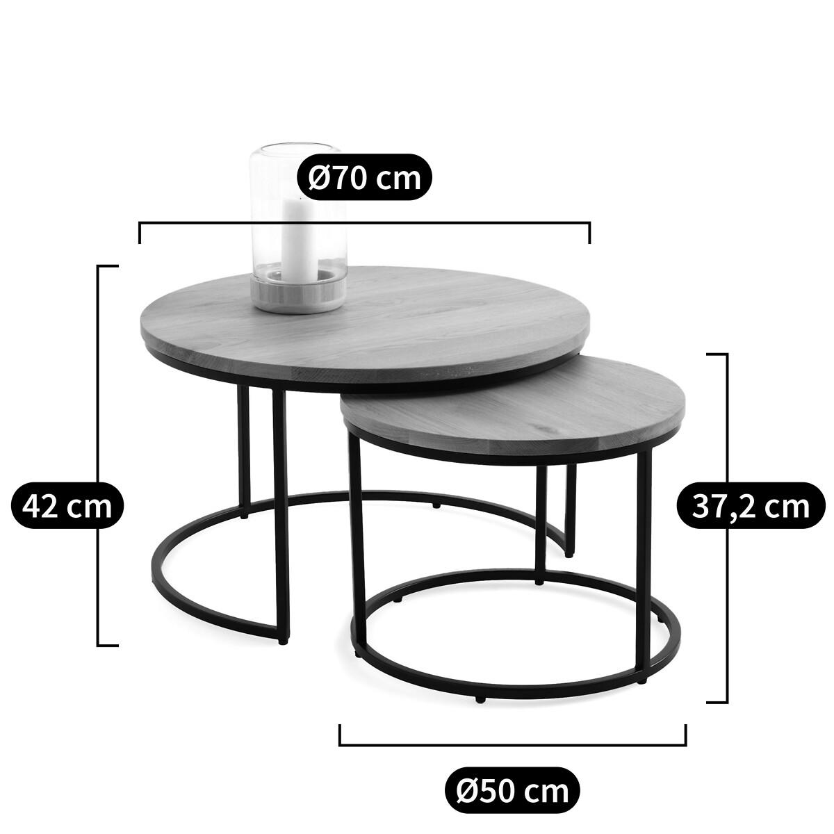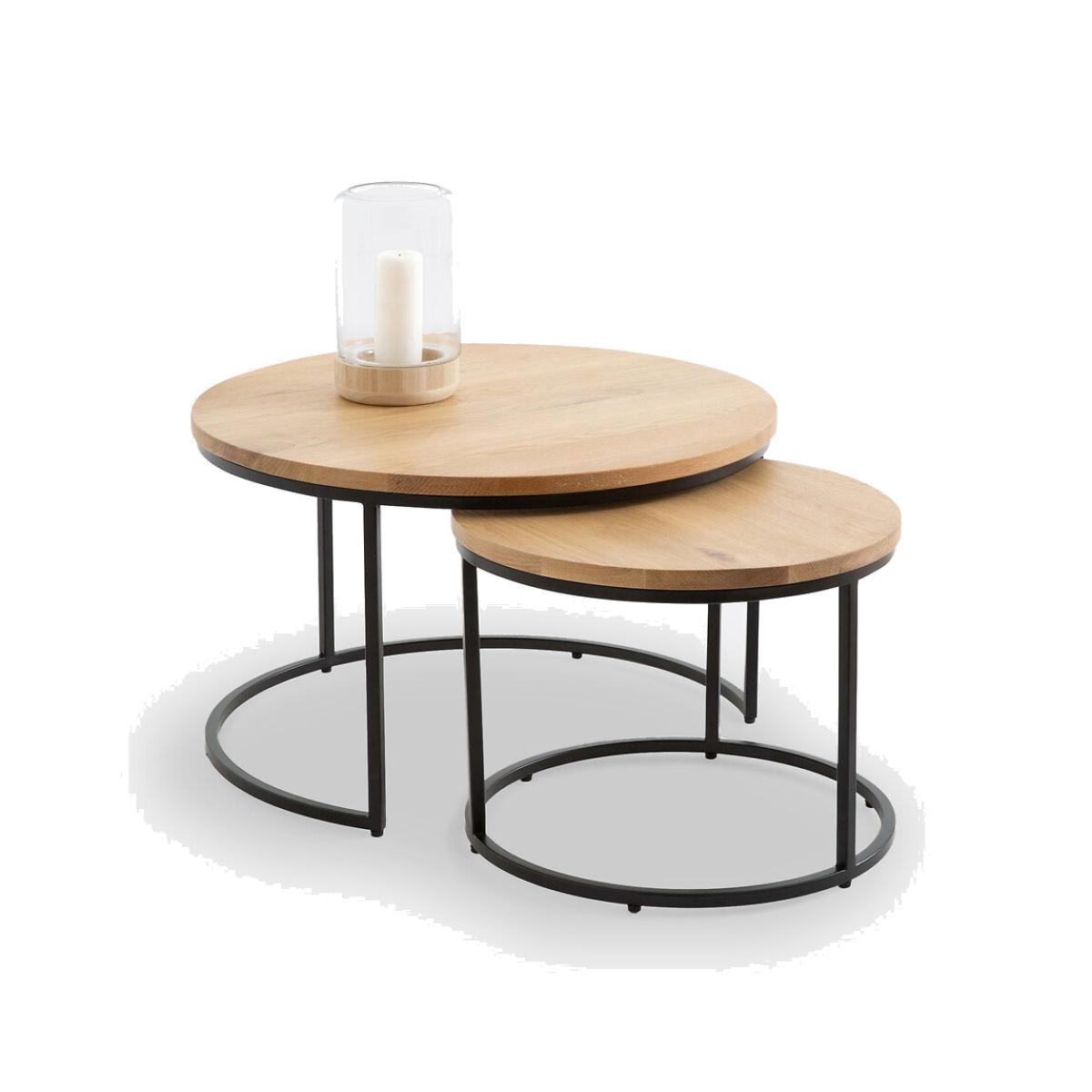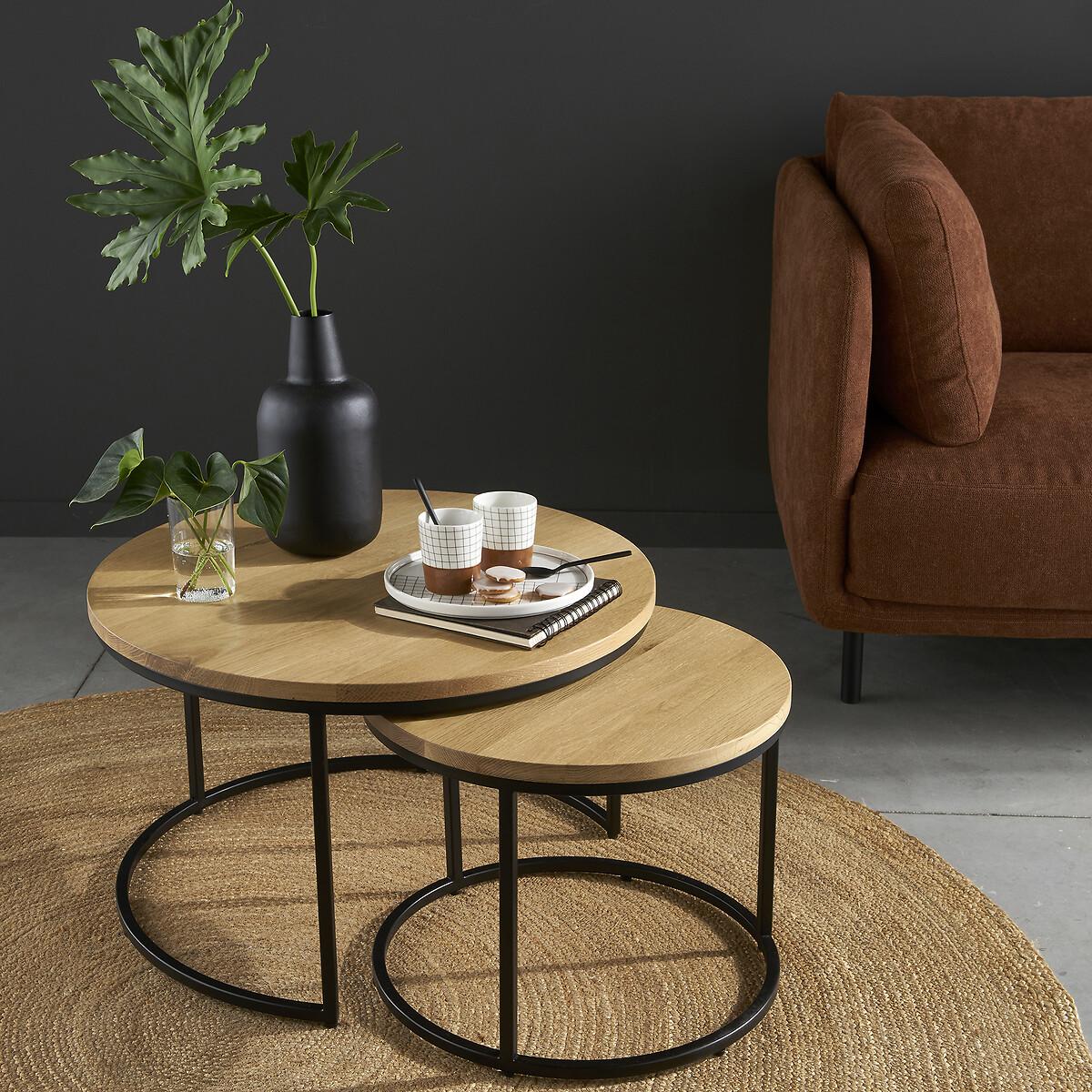 The 2 Nova nesting coffee tables. Perfect combination of oak and metal for a sober tone: beautifully rounded for an aesthetic and space-saving shape, it will soon find its place in your home.. Product Details • Solid oak top, colourless nitrocellulose varnish finish, FSC® certified • Black painted steel legs, epoxy finish. • Plastic pads on feet. Dimensions • Large: Diameter 70 x H42cm. • Small: Diameter 50 x H37.2cm. • Tabletop thickness: 2.2cm. • Sold pre-assembled. • WOOD FROM SUSTAINABLY MANAGED FORESTS. FSC® certified wood comes from forests that are environmentally, socially and economically well managed. Parcel Dimensions:1 parcel. L76 x H50 x D76cm.24kg.