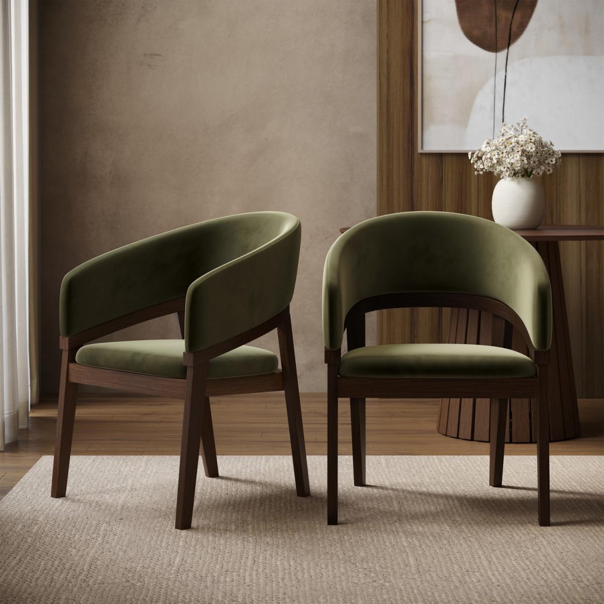 A curved backrest and armrests with a stylish cut-out detail create a sophisticated look. Solid wood construction ensures durability while adding warmth to your space. The olive green velvet upholstery provides a soft, inviting seat for dining or relaxing. The curved backrest offers excellent support, perfect for extended seating. Upgrade your dining space with these curved dining chairs. Featuring an elegant cut-out and curved backrest design, these chairs blend modern sophistication with everyday comfort. The plush olive green velvet upholstery and padded back and armrests are perfect for long dinners or casual gatherings. Built for durability, the solid wood frame with a walnut-stained finish adds warmth and stability, making these chairs a long-lasting addition to your home.
