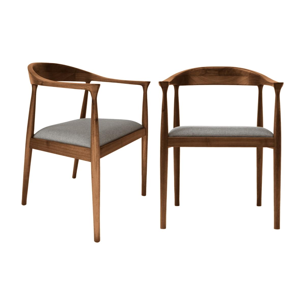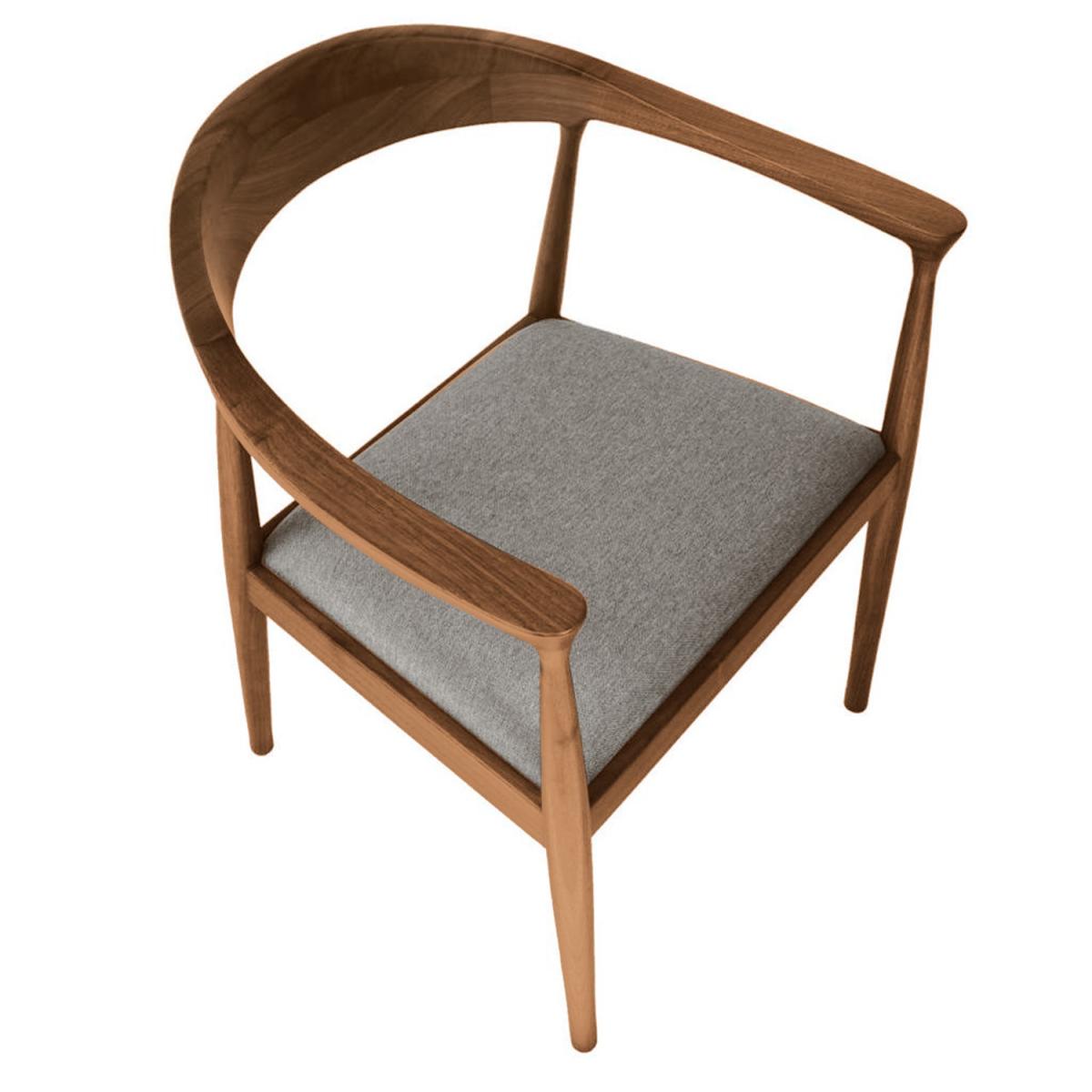Dining chair finished in a sleek mid-century shape Curved backrest wraps around you to ensure comfort Made from high-quality materials with solid walnut Timelessly elegant design will never go out of style Cushion is upholstered in a light-grey woven fabric Matching dining table available in the Cooper range Need to know Product weight: 7kg Max supported weight: 130kg Colour: Walnut Material: Solid walnut wood frame with fabric cushion seat Finish: Fabric upholstery Assembly required: No