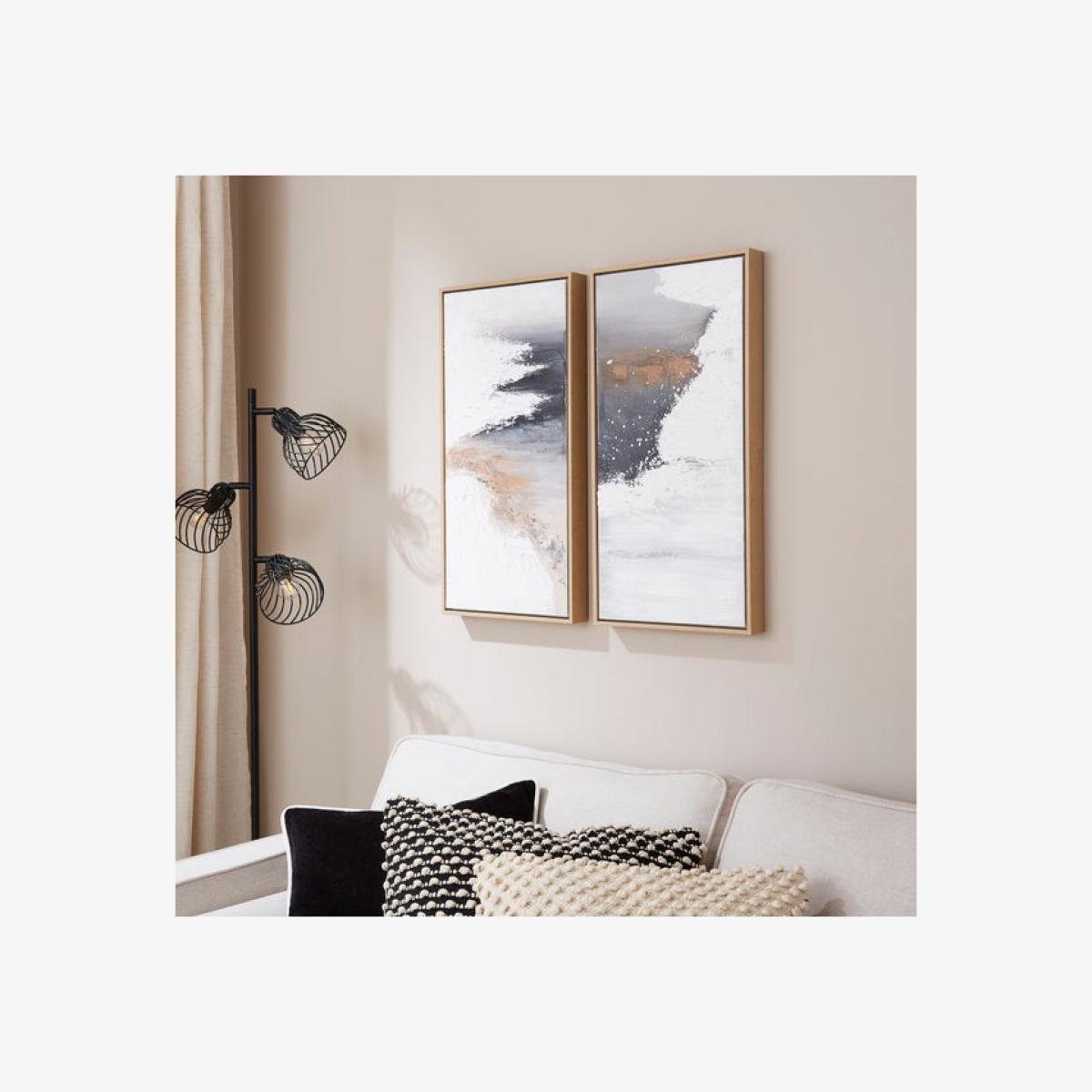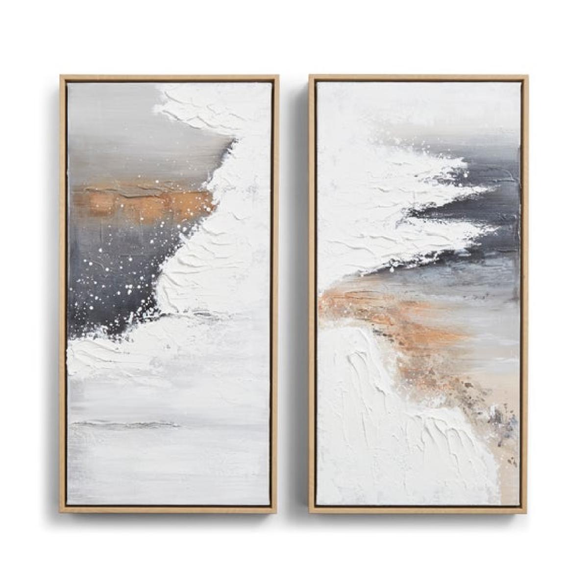 * Set of 2 canvases * Framed and ready to hang * Neutral palette * Abstract waves This set of 2 framed canvases features abstract waves in a soothing neutral palette. Ready to hang, these pieces bring a calming, modern touch to any room. The soft flow of the design creates a sense of movement, while the muted colours keep the look balanced and versatile. Ideal for living rooms, bedrooms or spaces that need a subtle statement, the simplicity of the abstract design makes it easy to pair with various interior styles. A perfect way to add both texture and elegance to your walls.