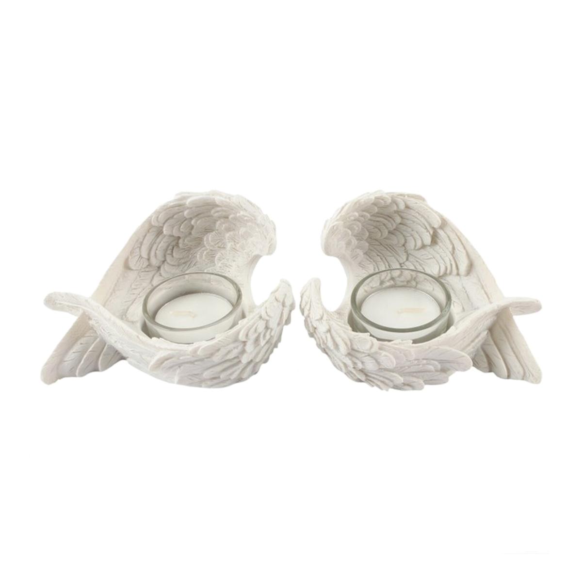 A pair of white resin angel wing tealight holders. Would look great on its own or as a pair on a mantle or table top. A great little addition to your homeware and would also make a great gift.