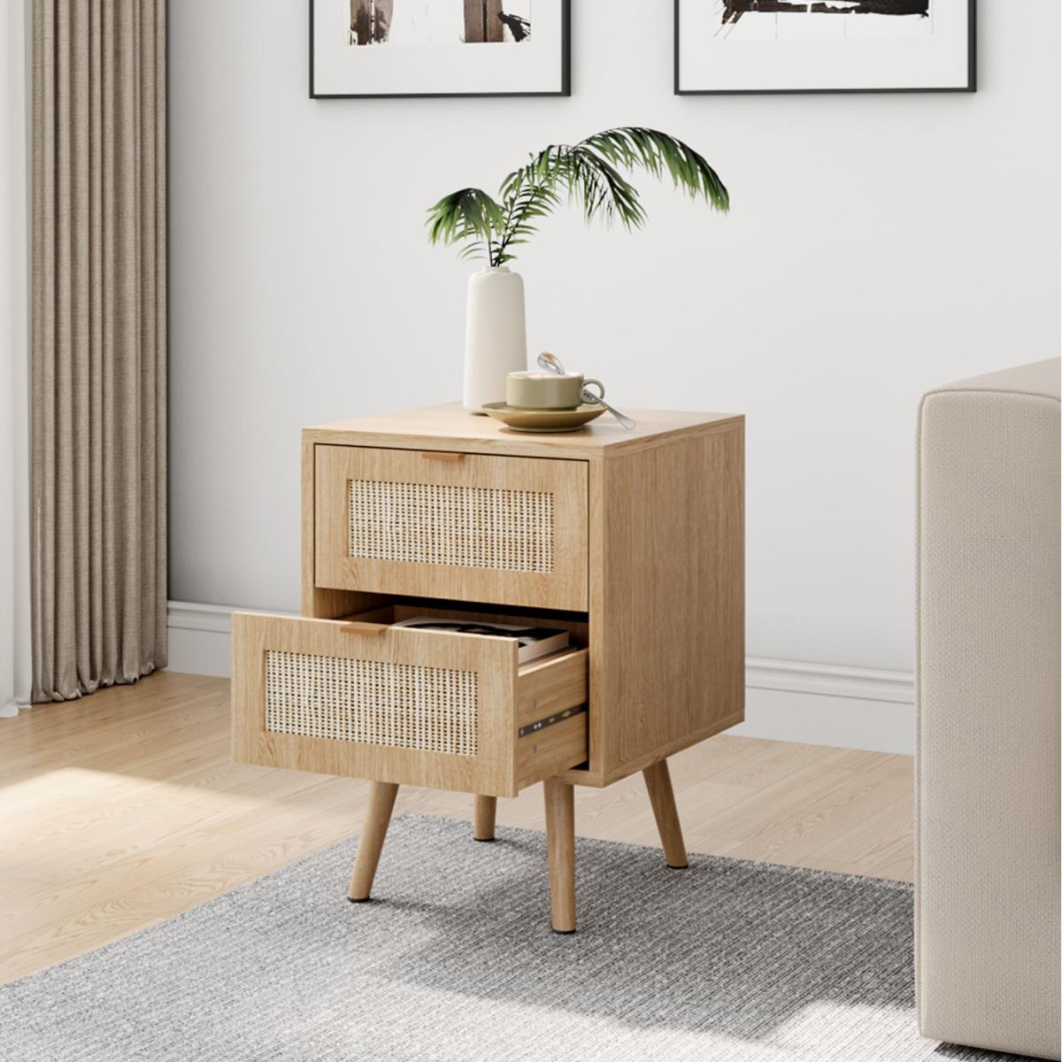 This side cabinet, crafted from solid wood and decorated with woven rattan, combines simplicity with elegance. The golden drawer handles add a touch of sophistication to its minimalist design. Supported by four sturdy wooden legs, the cabinet also features anti-skid pads at the base to protect your floor from wear and tear. Versatile in use, it works perfectly as a bedside table, or placed next to a sofa or TV to store small items while providing convenient storage space.
