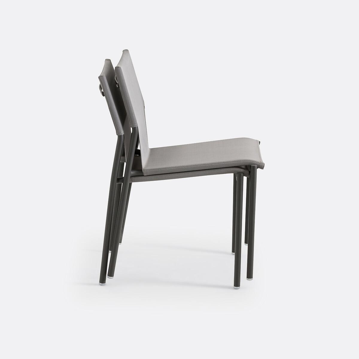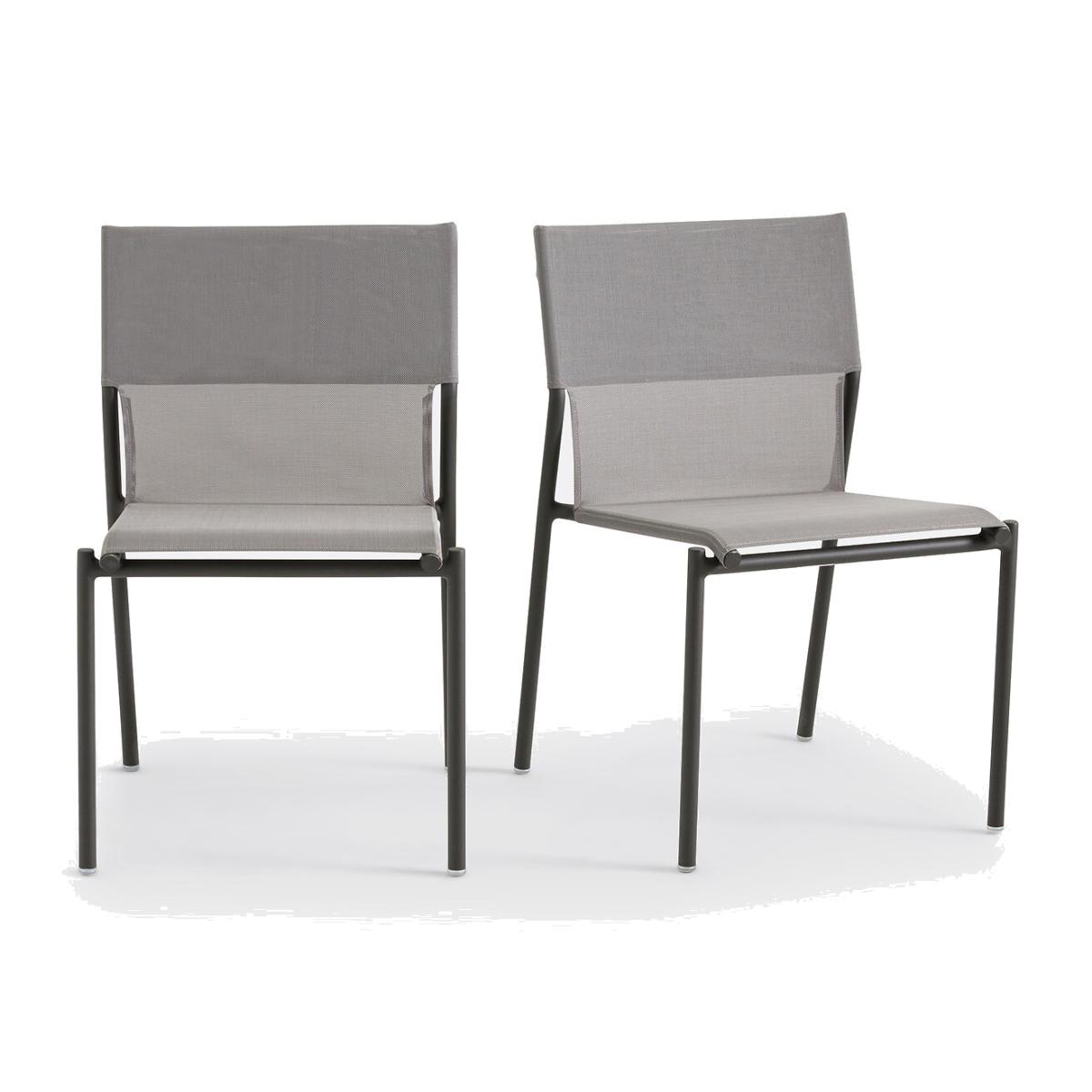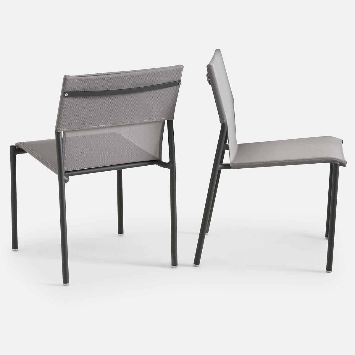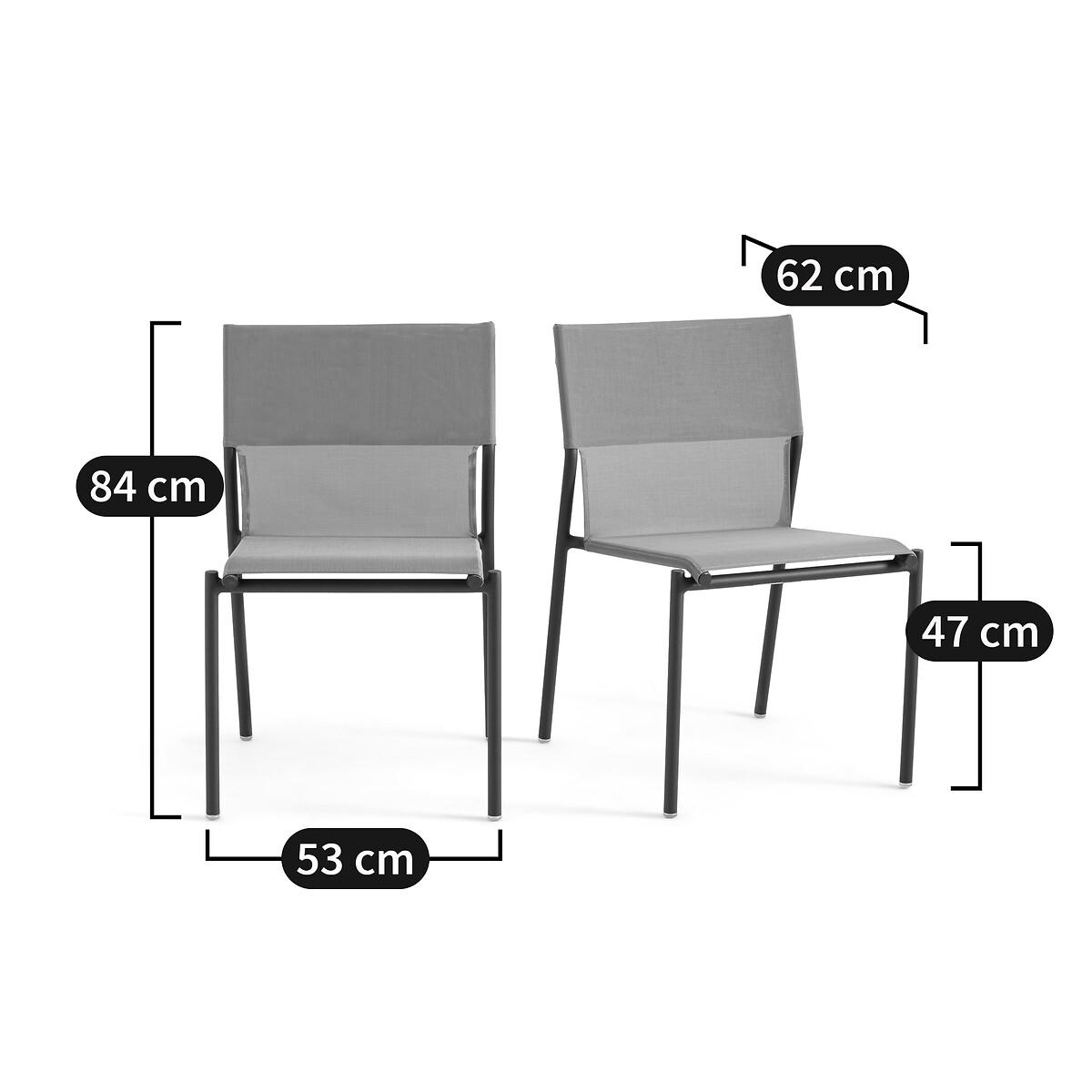 Combining a tubular aluminium structure and a textilene seat, the two Zory chairs are comfortable, light and contemporary.. Stackable and easy to move, they are perfectly suited to outdoor use. Product Details • Aluminium tube structure (diameter 2.5cm) with epoxy finish • Seat and back in textilene (70% PVC and 30% polyester) • Stackable • 4 polyethylene glides • Sold in packs of 2. Quality • Aluminum offers the advantage of not rusting. Easy to clean, it can be washed with soapy water. This material is ideal for outdoor furniture. This lightweight table is easy to carry and store. Dimensions • Width: 53cm • Height: 84cm • Depth: 62cm • Seat: L46 x H47 x D45cm • Weight: 2.2kg (chair)Delivery:Sold pre-assembled. Parcel dimensions and weight1 parcel • L58 x H87 x D64cm. 8kg.