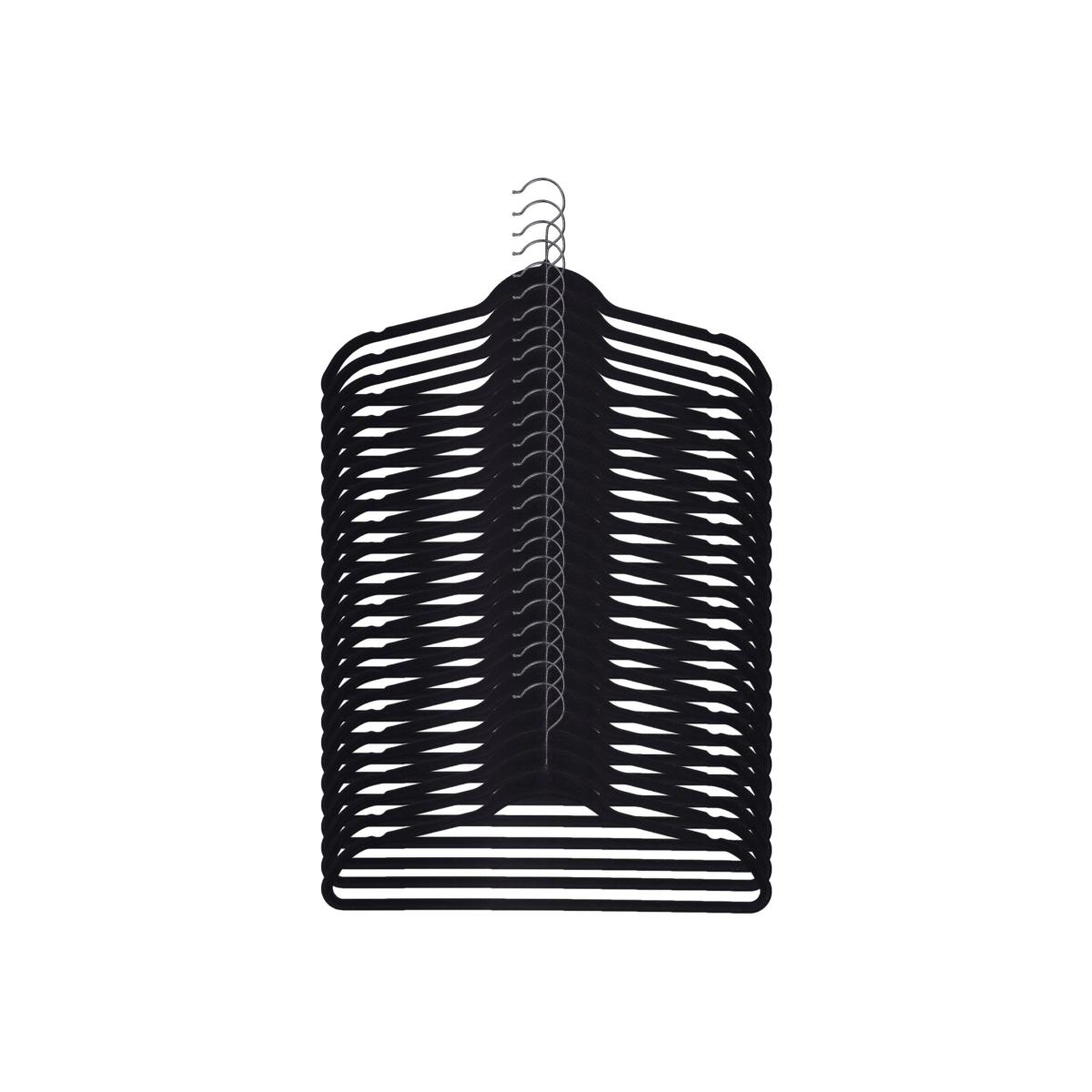 * Set of 25 * Velvet surface to prevent slipping * Slim design to save space Transform your wardrobe into a haven of order and elegance with our Set of 25 Black Flocked Hangers. The luxurious velvet surface keeps your clothes from slipping, while the soft texture treats even your most delicate fabrics with care. With their slim design, these hangers help you save precious wardrobe space, making room for all your favourites. The 360-degree swivel metal hooks add a practical touch, making hanging your clothes a breeze. Thoughtfully designed with gentle curves, they preserve the natural shape of your garments beautifully. Say goodbye to clutter and hello to a wardrobe that’s as stylish as it is organised.