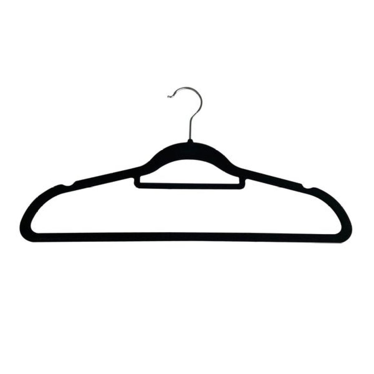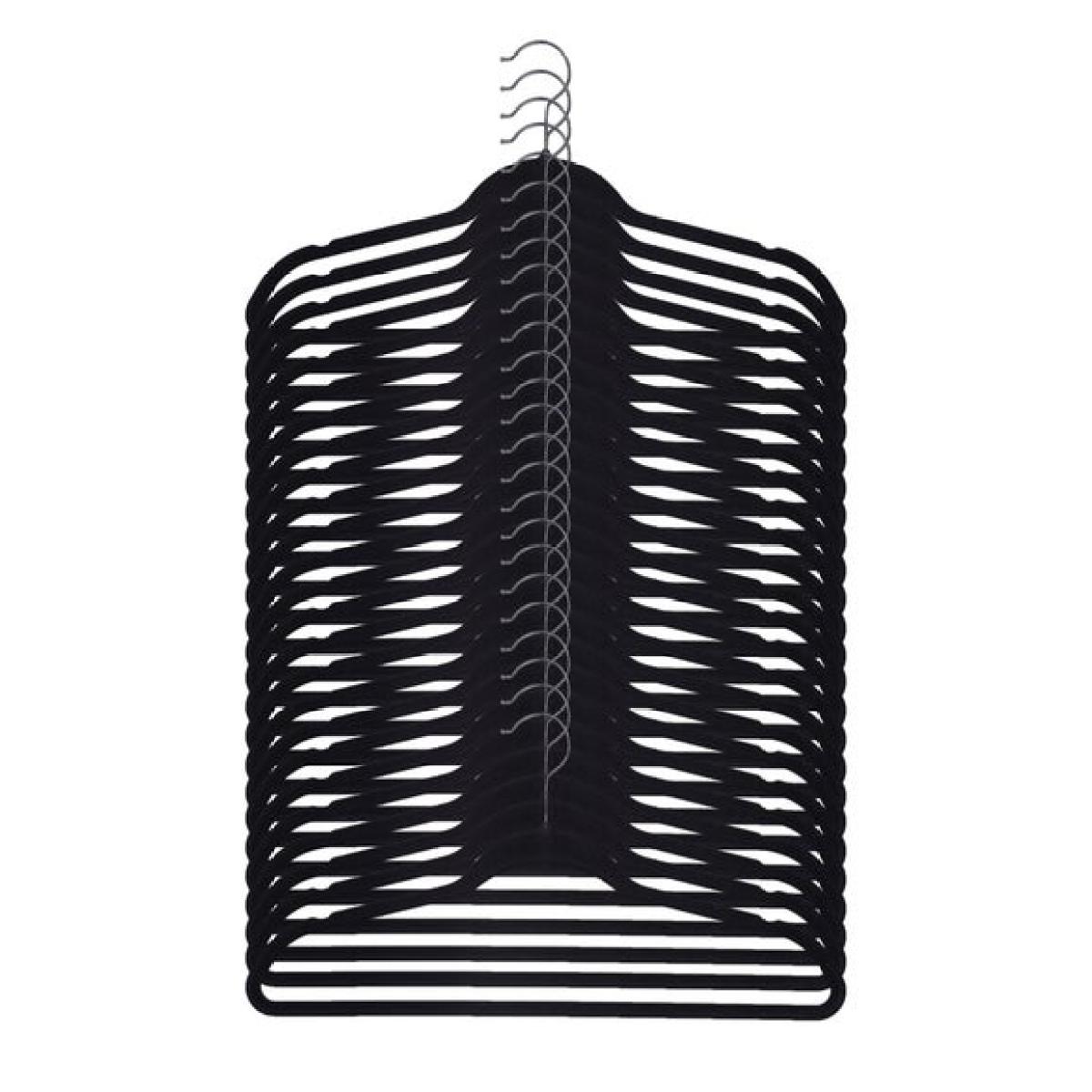 * Set of 25 * Velvet surface to prevent slipping * Slim design to save space Transform your wardrobe into a haven of order and elegance with our Set of 25 Black Flocked Hangers. The luxurious velvet surface keeps your clothes from slipping, while the soft texture treats even your most delicate fabrics with care. With their slim design, these hangers help you save precious wardrobe space, making room for all your favourites. The 360-degree swivel metal hooks add a practical touch, making hanging your clothes a breeze. Thoughtfully designed with gentle curves, they preserve the natural shape of your garments beautifully. Say goodbye to clutter and hello to a wardrobe that’s as stylish as it is organised.