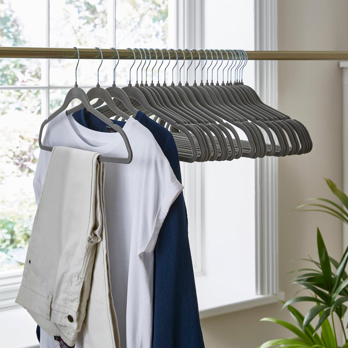 I’m a fan of these velvet hangers for how slim they are and how reliably they stop blouses or slip-dresses from sliding off an open rail. They’re ideal in contemporary or Scandi-inspired dressing areas, where you want a streamlined look and garments displayed in tonal groups. For practical styling, group by colour or garment type, leaving a little space between each item to let fabrics breathe. Use them in both built-in wardrobes and freestanding rails to give off a neat, boutique feel, and you’ll instantly upgrade even the simplest hall or bedroom storage.