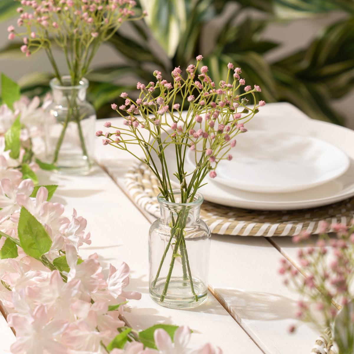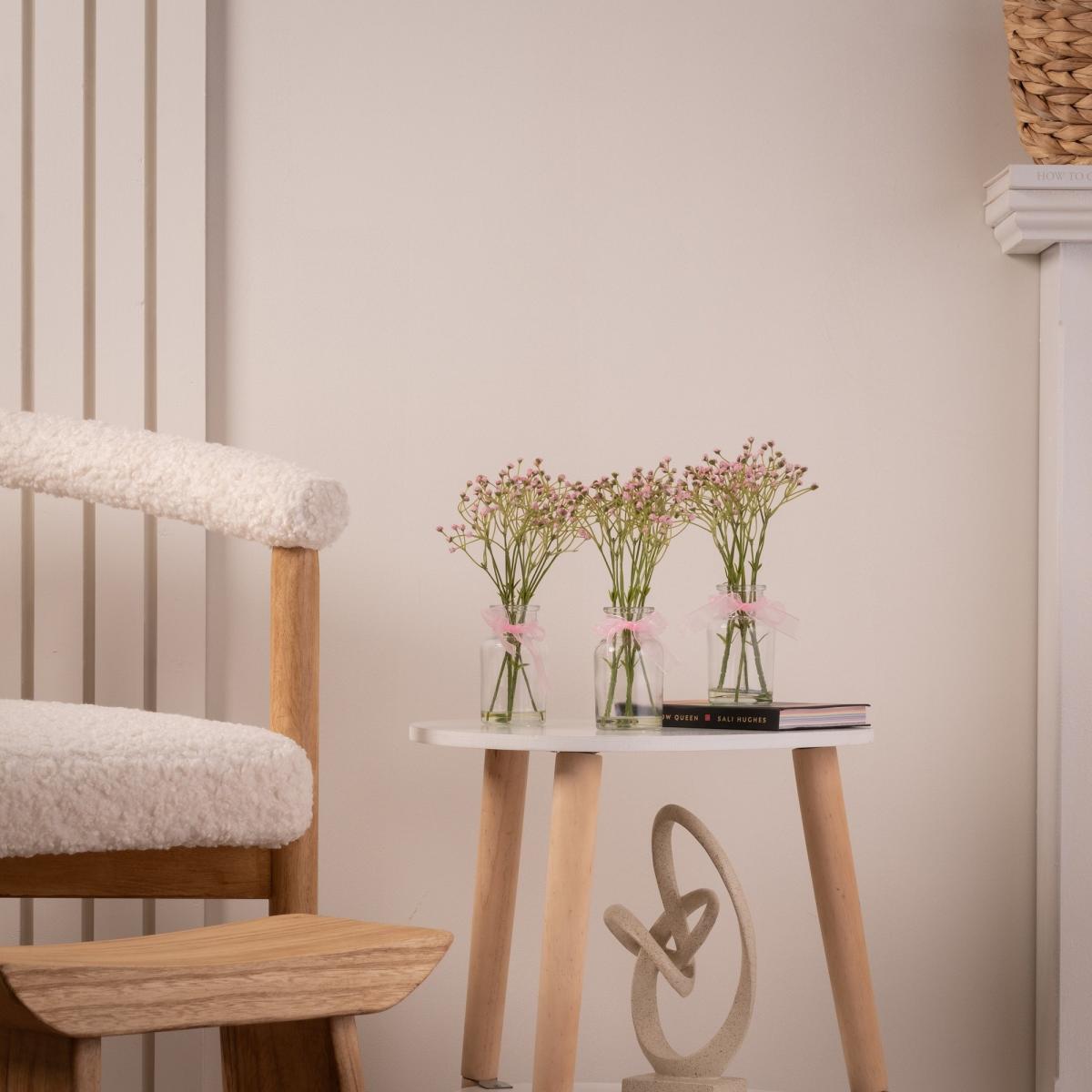 I love this set of three faux gypsophila bundles in glass bottles because they bring a soft, delicate feel to any space without the upkeep of fresh flowers. They work particularly well in minimalist or shabby chic interiors, where their subtle pink hue adds a gentle touch of colour. For styling, they look great grouped together on dining tables, shelves, or sideboards, but can also be used to create a charming centrepiece or vignette. A practical tip is to place them in a spot where natural light hits to enhance their colour and detail, and consider pairing with glass or mirrored surfaces to maximise their visual impact. Overall, they add a touch of femininity and sophistication while remaining low-maintenance.