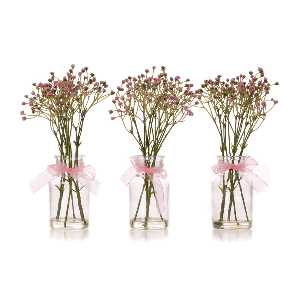 * Pack of 3 Artificial bundles, presented in glass vases* Decorated with a removable Ribbon* Perfect for use as wedding decorations This Set of 3 Artificial Gypsophila Bundles in Glass Bottle Vases adds a touch of charm to any occasion. Ideal for table centres or as DIY wedding décor, these petite vases bring a delicate beauty to your setting.