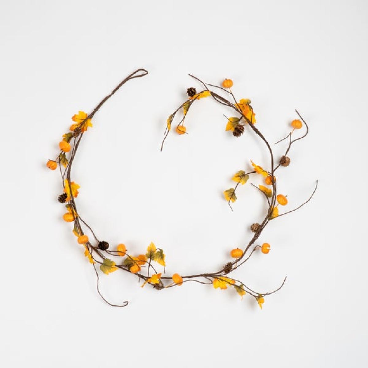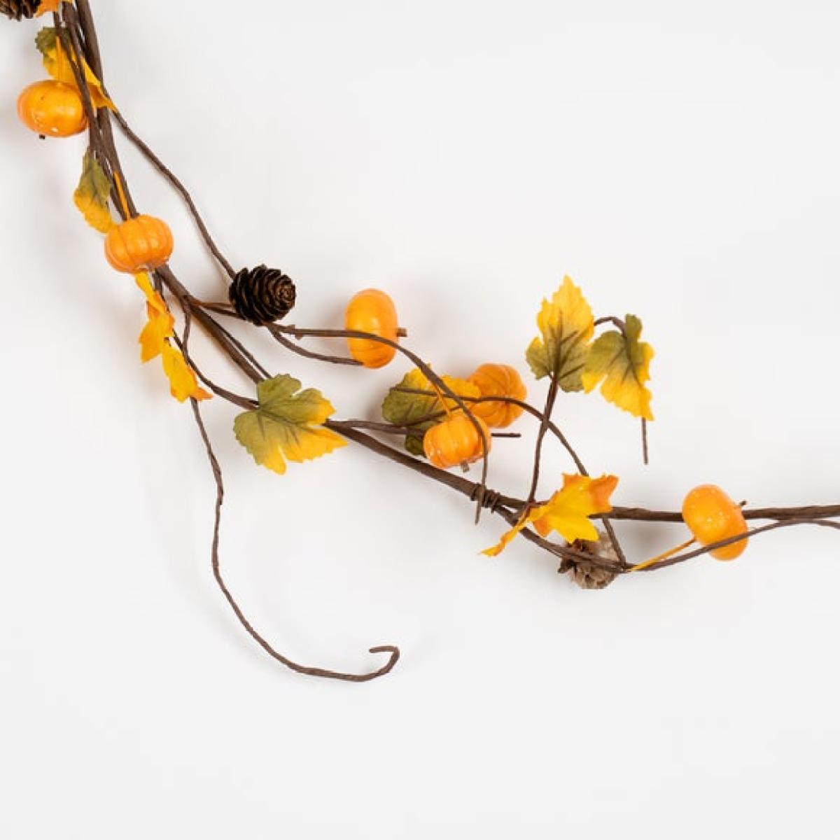 * Set of 3 garlands * Autumnal tones * Artificial pumpkins * Mixed foliage * Each: 150cm length Celebrate the cosy spirit of autumn with this set of three 150cm artificial pumpkin garlands. Filled with miniature pumpkins, rich fall leaves, and warm seasonal hues, they capture the essence of harvest time without any fuss or upkeep. Perfect for draping over mantels, winding around banisters, or adding texture to table centrepieces, these garlands bring a rustic, festive feel to any room. The blend of soft yellows, oranges, golden browns, and natural tones makes them ideal for autumn décor or harvest celebrations. Durable and reusable, they’re a simple way to bring seasonal charm into your home year after year. Remember to bring indoors during adverse weather conditions.