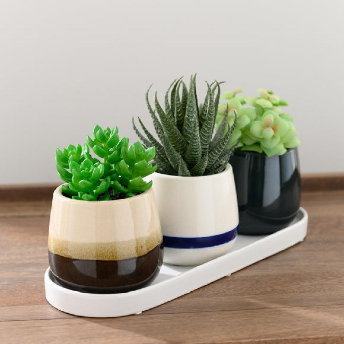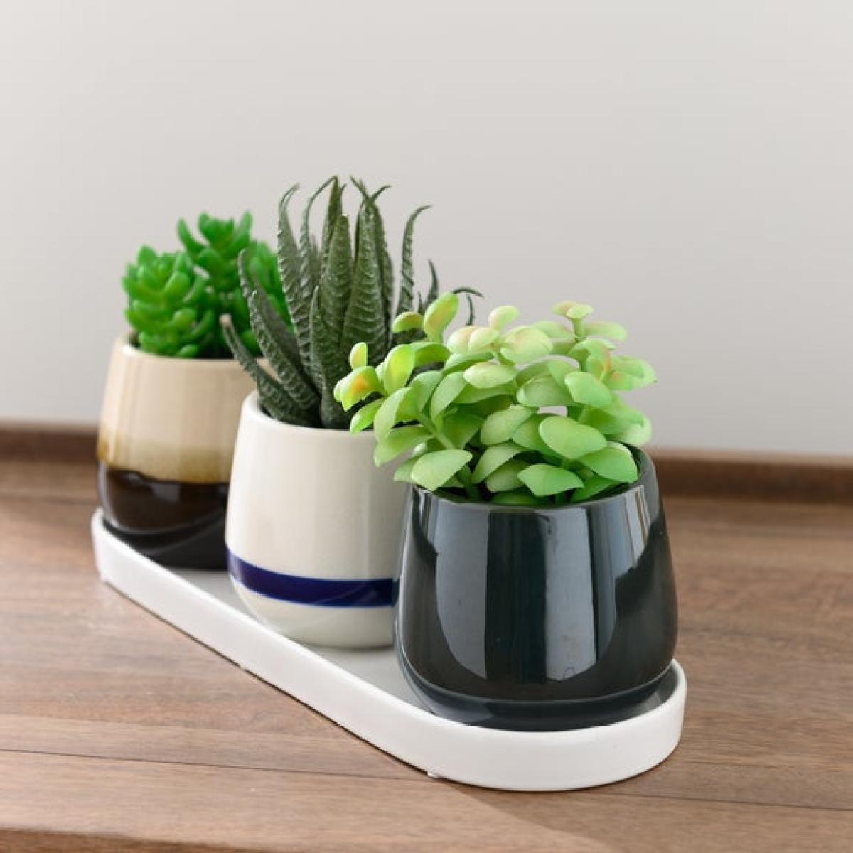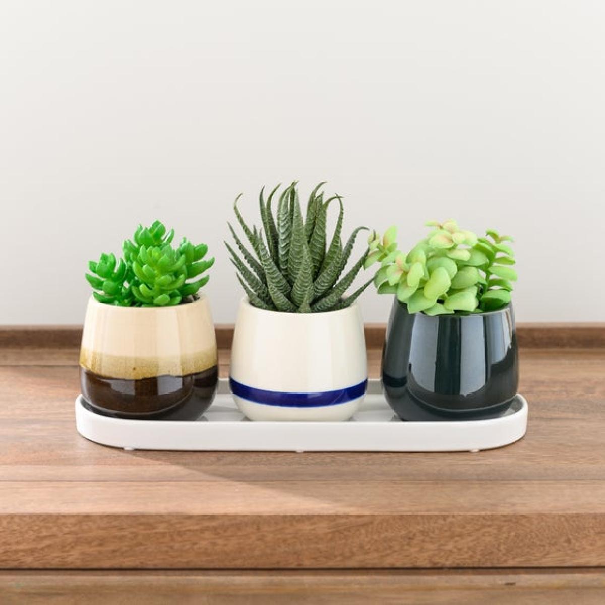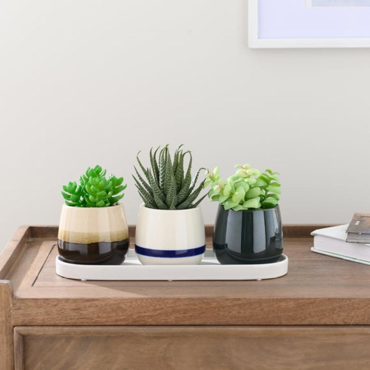 * Set of 3 artificial succulents * Ceramic pots and tray * Great for adding colour * No watering needed This set of 3 artificial succulents are a fabulous way to add colour and freshness to your space whatever the season. The realistic succulents need no watering or maintenance, and come presented in their own ceramic pots with differing patterns, all contained in a ceramic tray. This set is ideal for display on a windowsill, mantelpiece or side table, and is a lovely way to add greenery to your home.