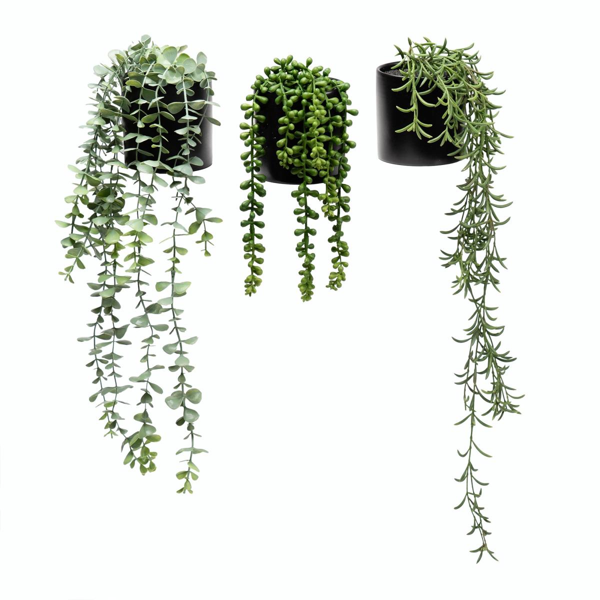 Set of 3 Artificial Trailing Plants in Black Ceramic Pots Green