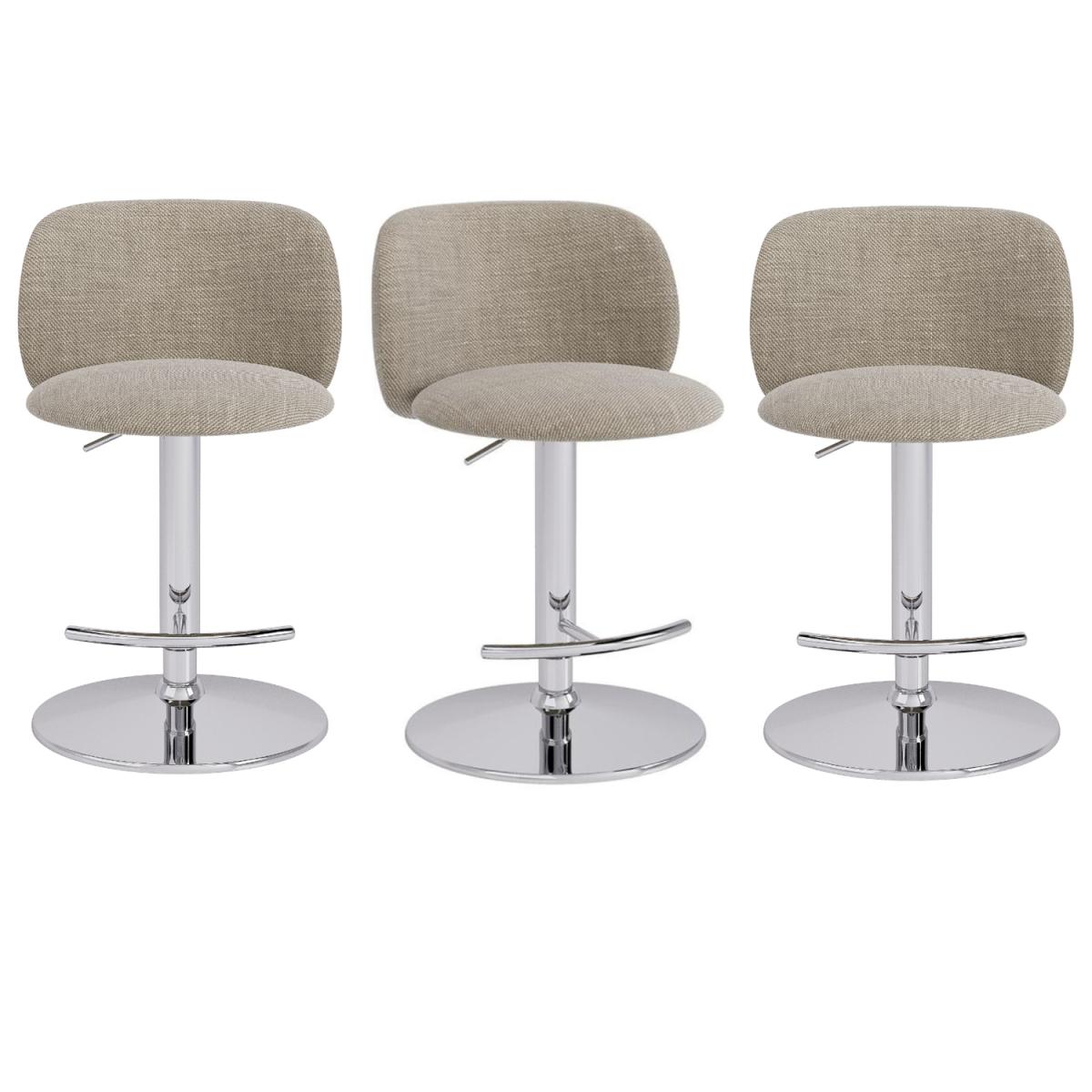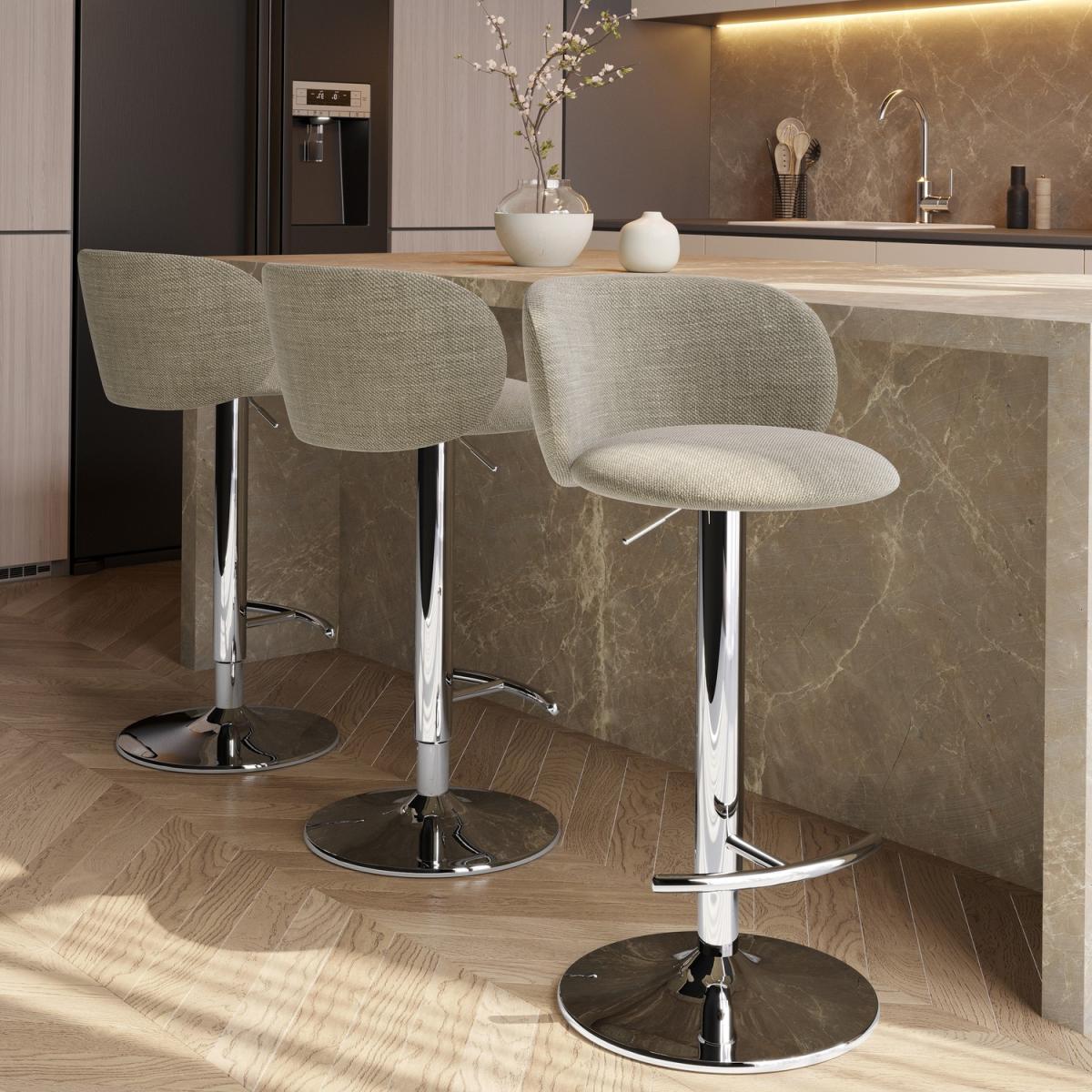 Upholstered in beige woven fabric for a modern yet cosy look that complements any décor. Easily adapt the stool’s height to suit a variety of counter or bar levels, offering versatility for your space. The 360-degree swivel feature allows effortless rotation, ideal for social settings or multitasking. A sleek chrome base adds a touch of modern sophistication while ensuring durability and stability. The low curved backrest provides just the right amount of support for comfortable seating. These set of 2 Tessa beige woven adjustable barstools is the perfect combination of style, comfort, and practicality. Its woven textured fabric upholstery brings a natural yet chic vibe to your kitchen or bar area, while the chrome leg adds a modern edge. Designed for adaptability, these barstools features an adjustable height mechanism and a smooth 360-degree swivel, making it ideal for a variety of settings and uses. With its low curved backrest and comfortable seat, the Tessa barstool offers ergonomic support without compromising on style. Whether you're enjoying a quick meal or hosting a gathering, it’s a versatile addition to any home. Built to last, it combines contemporary aesthetics with everyday functionality. Number of stools: 3 Dimensions: W46 x D51.5 x H80-100 cm Seat height: 62-82 cm Weight: 7.65 kg Max supported weight: 150 kg Colour: Beige and chrome (legs) Material:Fabric and solid iron (legs) Assembly required: Yes Packaging dimensions: W48 x D32 x H50 cm Packaging weight: 8.75 kg For domestic use only. Domestically UKFR certified.