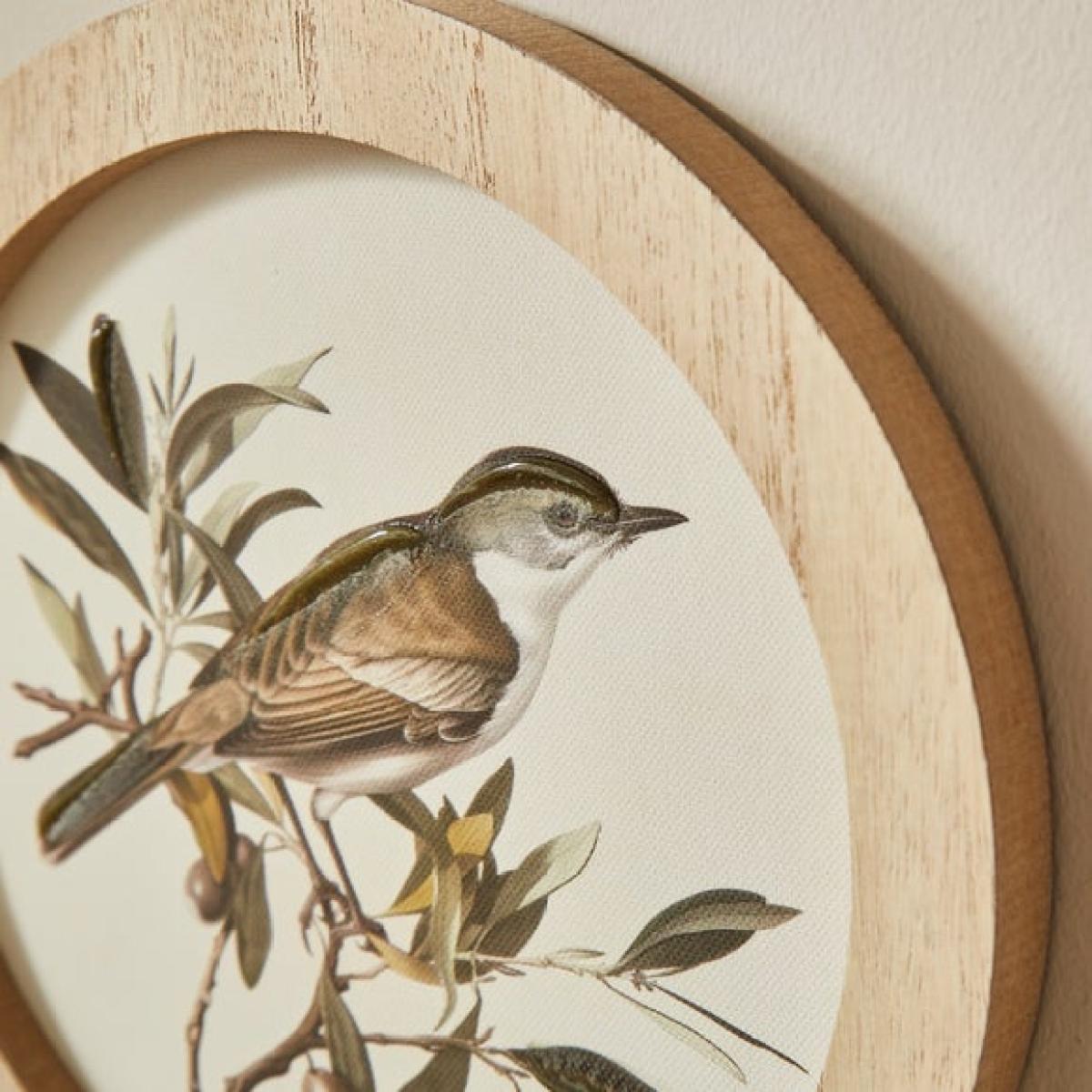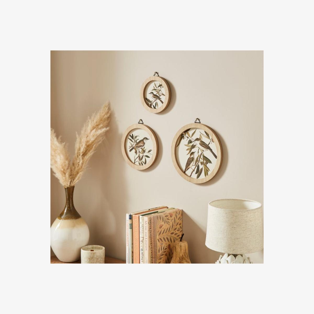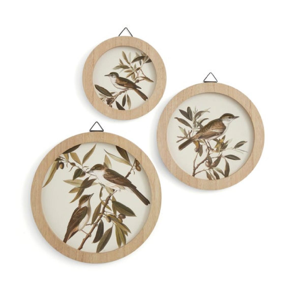 * Set of 3 * Round frames * Brown toned artwork * Bird themed This set of three round canvases features a delicate bird design in soft brown and natural tones, perfect for creating a calm, nature-inspired look. Each piece is finished with a natural wood-effect frame that adds warmth and texture to your wall. The round shape offers a refreshing alternative to traditional artwork, bringing a gentle, organic feel to your space. Ideal for hallways, bedrooms or living areas, they work beautifully as a trio or styled separately. The neutral palette blends easily with a wide range of interiors, making this set a subtle way to add natural interest and character to your décor.