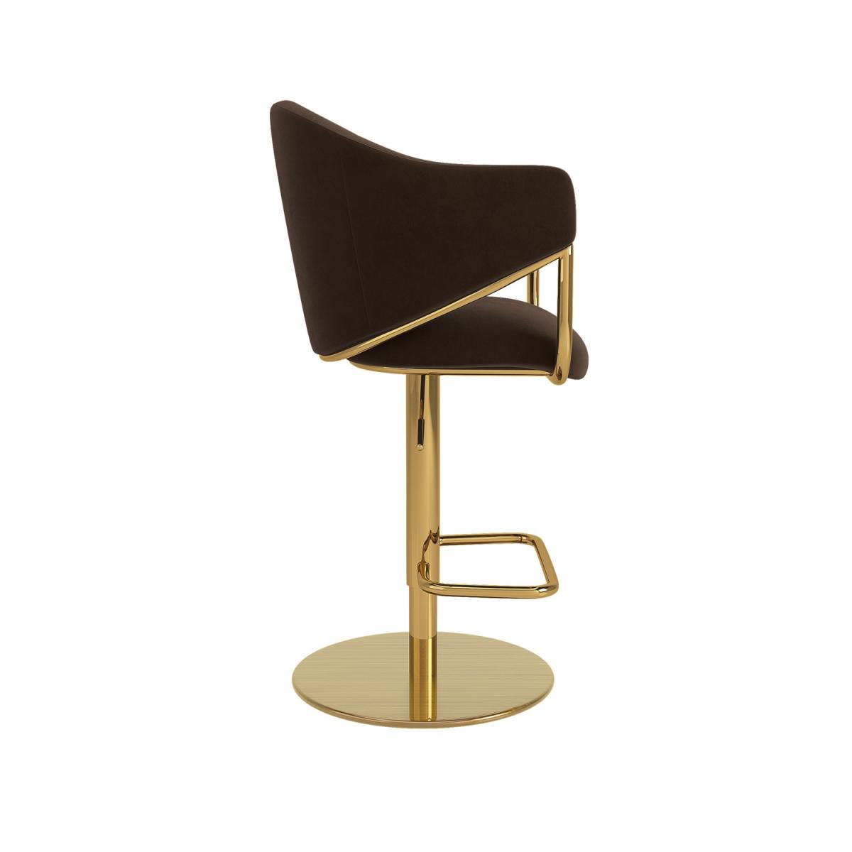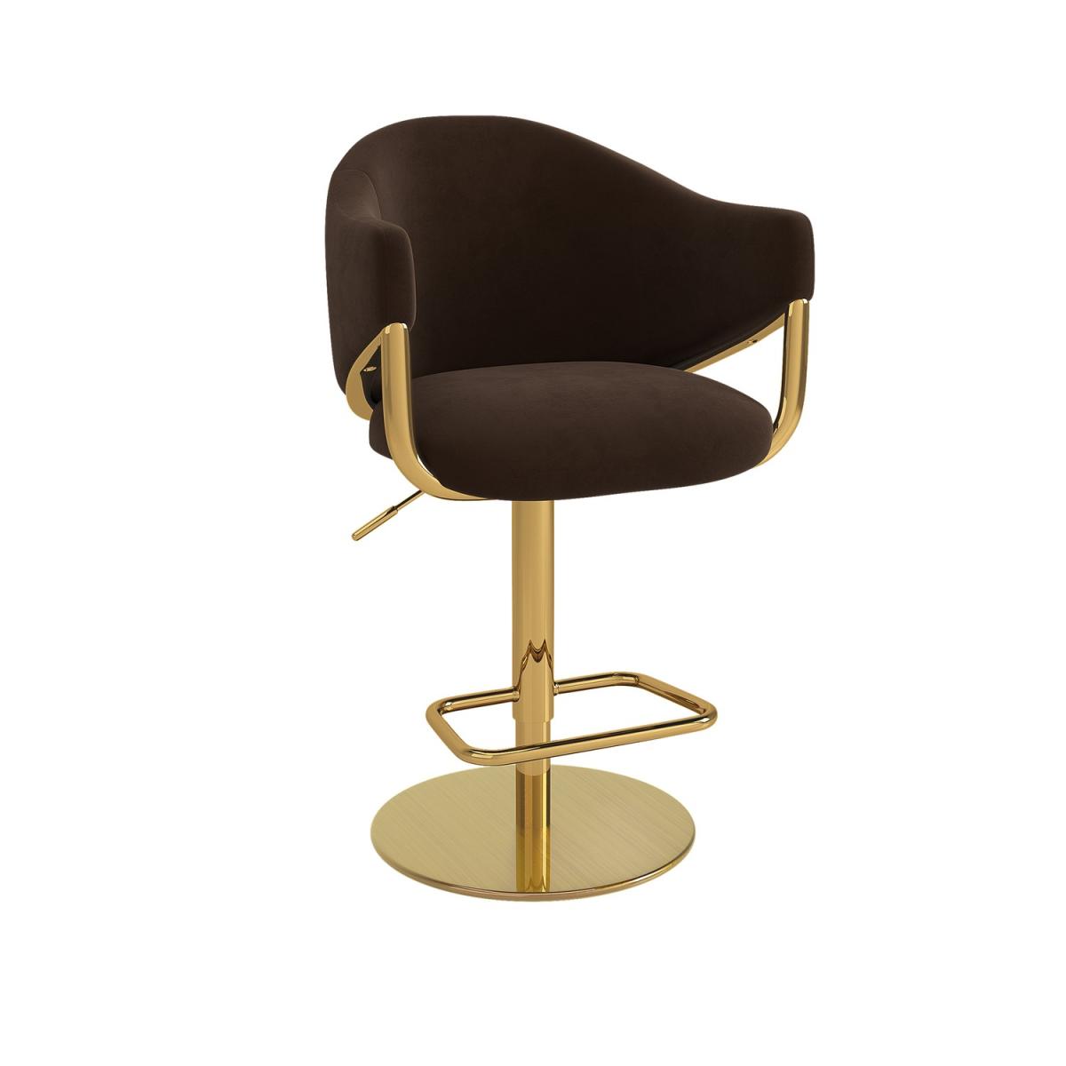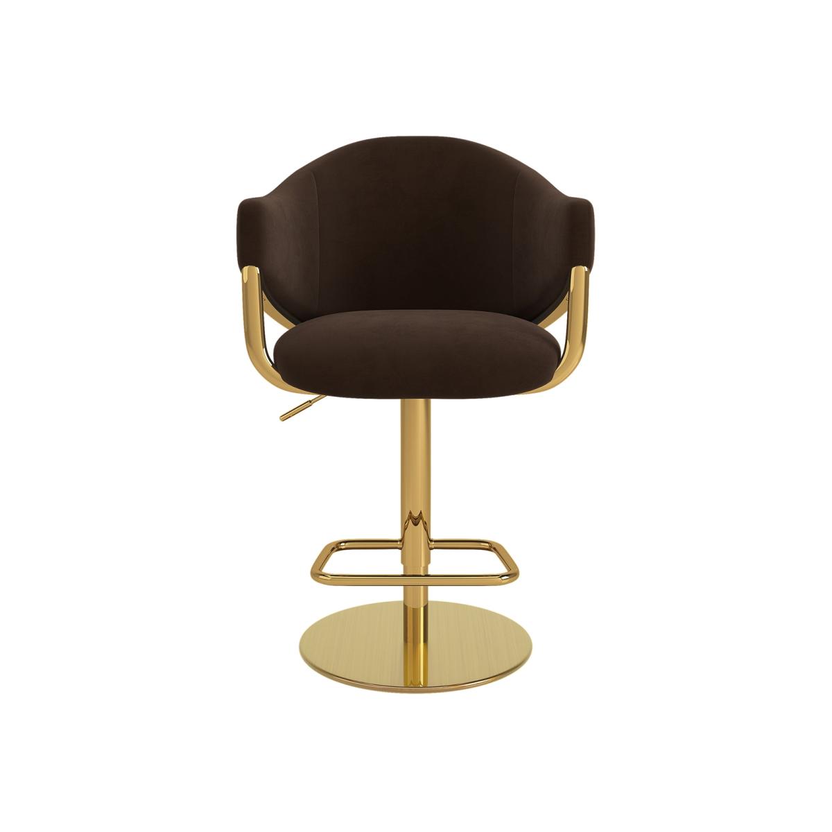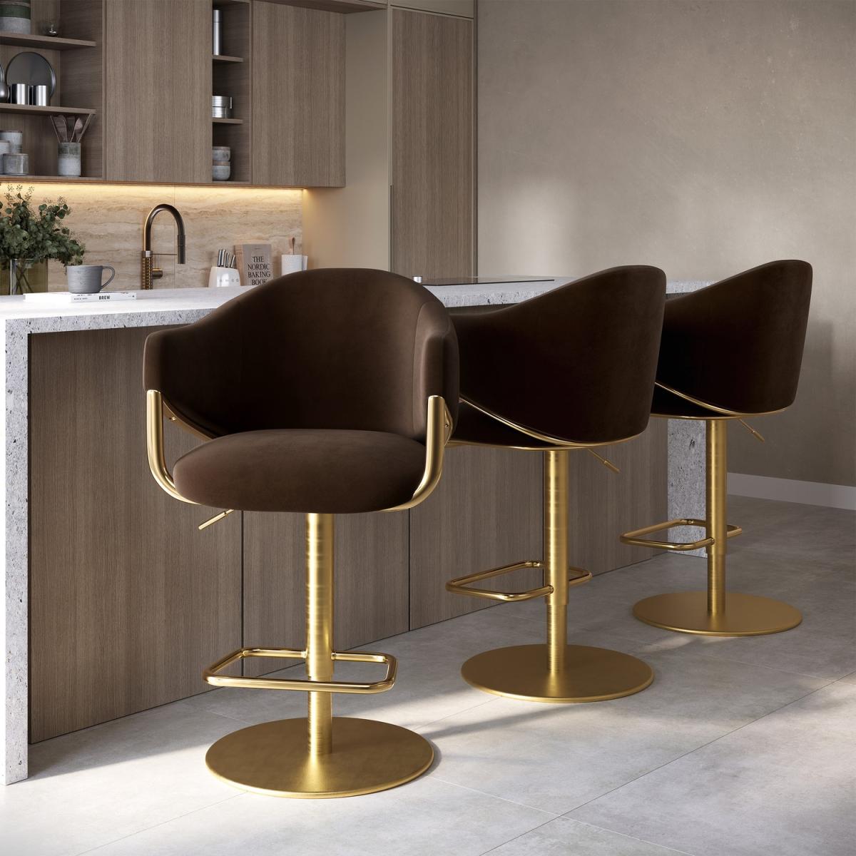 Crafted with soft brown velvet, this barstool adds a warm and elegant touch to any space. Easily adjust the stool’s height with a smooth gas lift to suit different counter or bar levels, ensuring maximum versatility and functionality. Enjoy the convenience of a 360-degree swivel, perfect for socialising or multitasking with ease. The sturdy brushed gold base not only provides excellent stability but also adds a sophisticated, modern aesthetic. The rounded backrest provides extra support, while the footrest offers additional comfort. The Ronnie brown velvet adjustable barstool perfectly blends luxury, functionality, and modern design. Upholstered in soft brown velvet, it instantly elevates the style of your kitchen or bar area. Its brushed gold base brings a contemporary flair, while the adjustable height and 360-degree swivel make it a practical choice for versatile use. Designed for maximum comfort, its supportive backrest ensure you can sit back and relax whether you're enjoying a morning coffee or entertaining guests. Its durable construction guarantees lasting quality, making it a stylish and reliable addition to any home.
