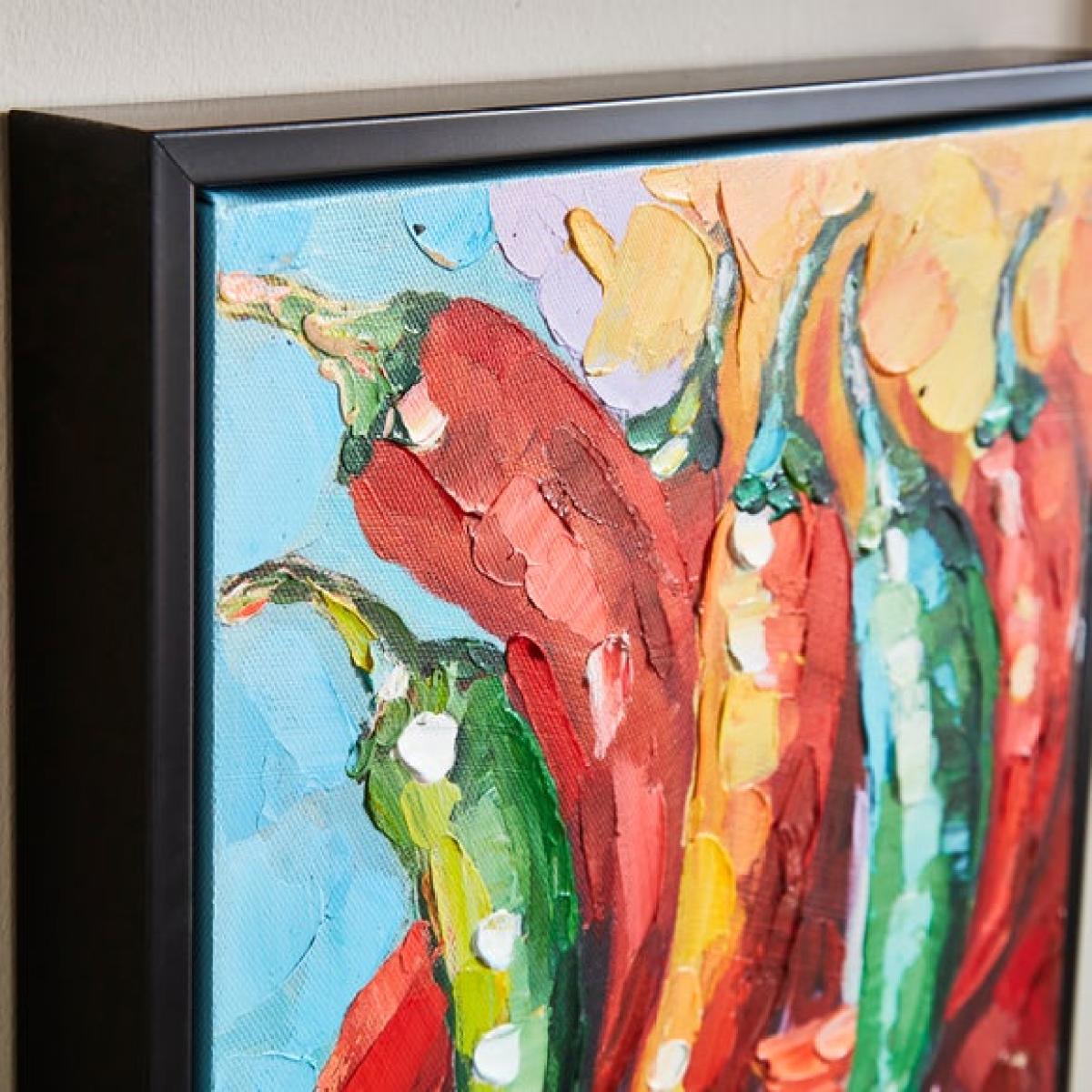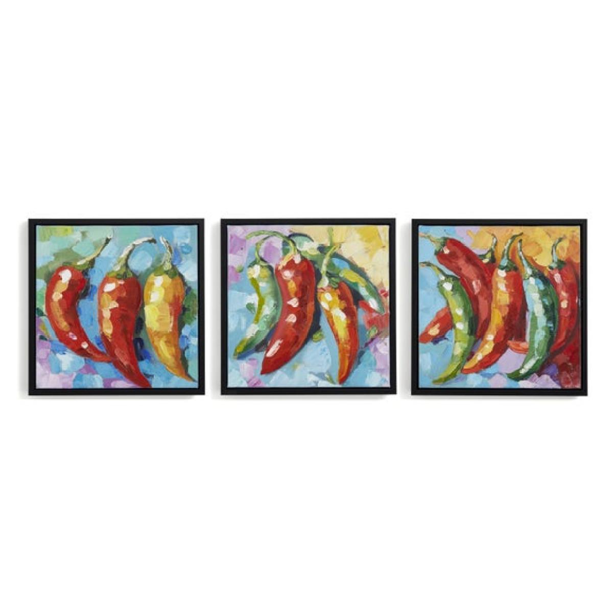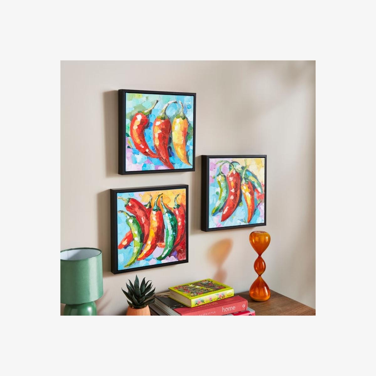 * Bright colours * Set of 3 canvases * Simple black frames This set of 3 hand-finished canvases features vibrant, bold chillies that add a pop of colour to your walls. The textured finish brings depth and character to each piece. Simple black frames provide a clean contrast, allowing the bright colours to stand out. Perfect for kitchens, dining areas or anywhere that could use a touch of energy, the playful design adds a fun and lively element to your décor.