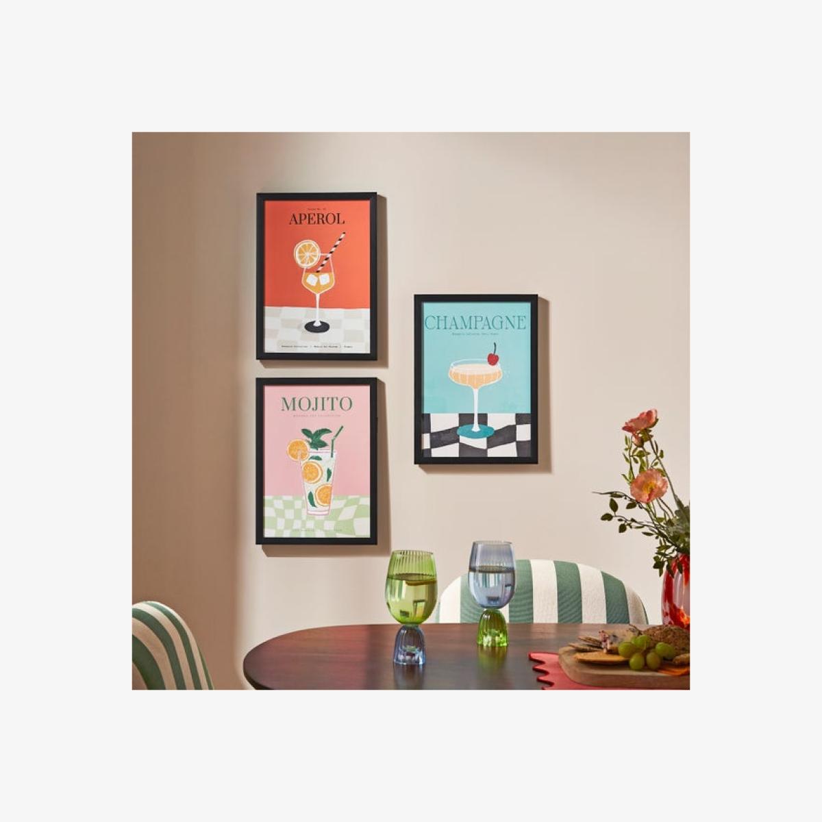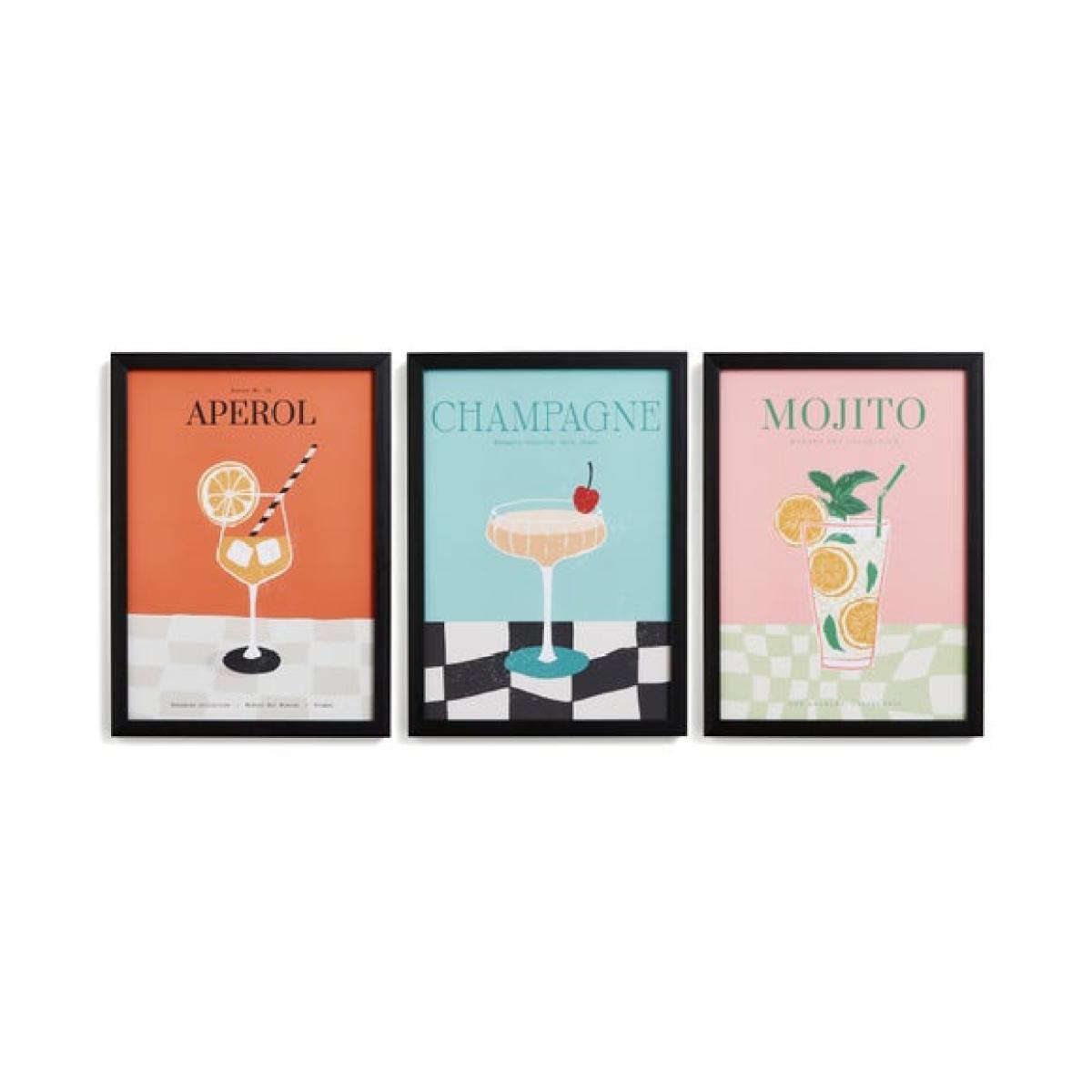 * Set of 3 * Cocktail design * Colourful prints * Ready to hang Add a pop of colour to your space with the Set of 3 Cocktail Framed Prints. Featuring a modern cocktail design, these prints bring a fun feel to any room. Perfect for kitchens, dining rooms or home bars, they come framed and ready to hang. Simple yet bold, these prints are an easy way to refresh your décor.