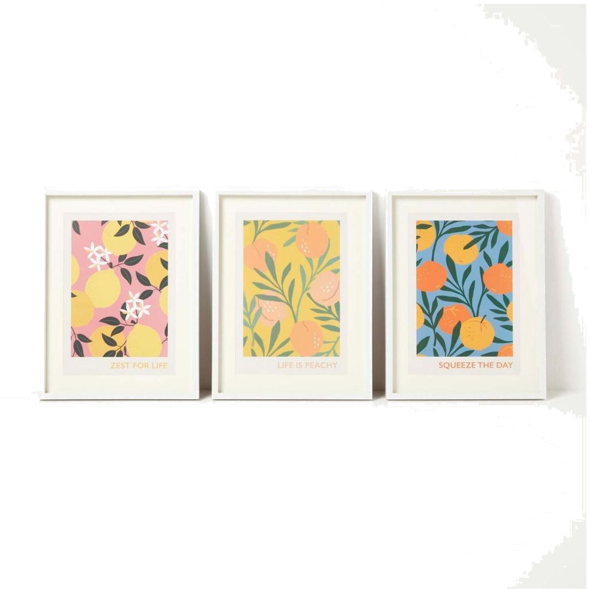 I love this set of 3 colourful summer fruits prints for their bright and fresh aesthetic - they bring a cheerful vibe to any space. They work particularly well in kitchens, dining areas, or playrooms where vibrant, playful art enhances the overall feel. For styling tips, consider framing them in a similar white border to create a cohesive look, and group them on a plain wall to let the artwork stand out. They also pair nicely with neutral or pastel walls, adding a lively focal point without overwhelming the room. These prints are a versatile choice for adding a pop of colour and summery spirit to your interiors.