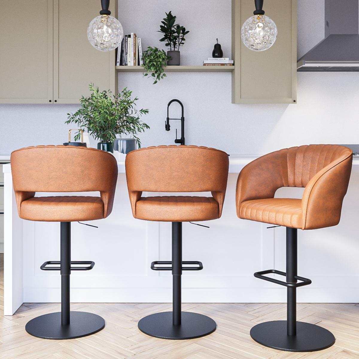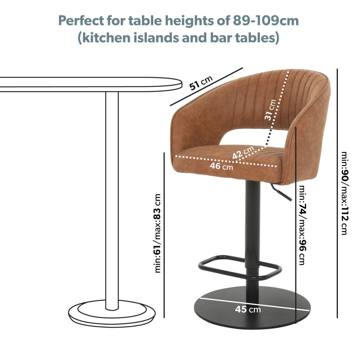 This bundle includes: 3 x Curved Tan Faux Leather Adjustable Bar Stools with Backs - Runa Features we love Adjustable bar stools with backrest in tan The PU material is easy to wipe clean Gas lift mechanism makes it easy to adjust the height Fits a standard bar table perfectly Swivels all the way around for extra versatility Suitable for bar table heights of 104-109cm, please measure before purchasing All about me These tan PU bar stools features a contrasting black footrest and base are modern and on trend. The footrest is a great addition to this stool as it proves added comfort. Designed to be comfier for longer, the seat is foam filled, perfect for perching while you eat, drink or work. The vertical stitching detail and warm tan tone add a perfect modern finish to your space. Need to know Dimensions:W56 x D51 x H90-112 cm Weight: 14.35kg Colour:Tan and black Material: PU and solid iron Assembly required: Yes