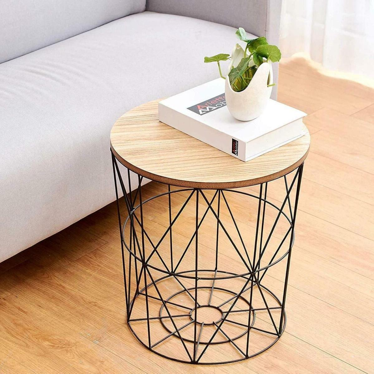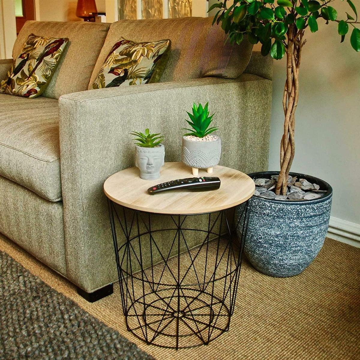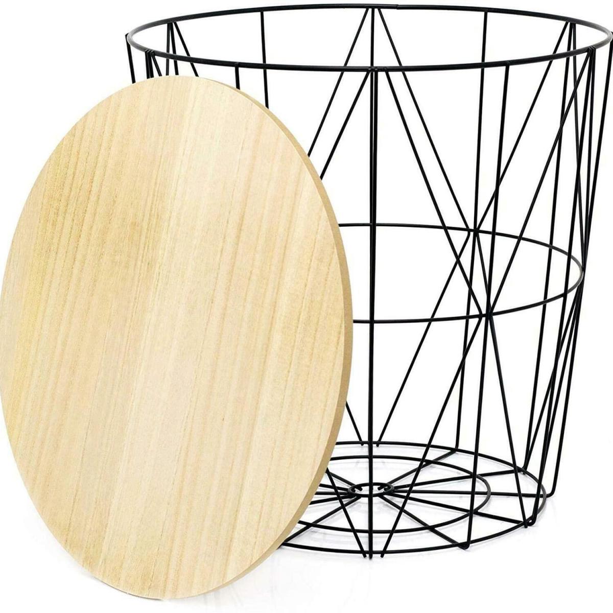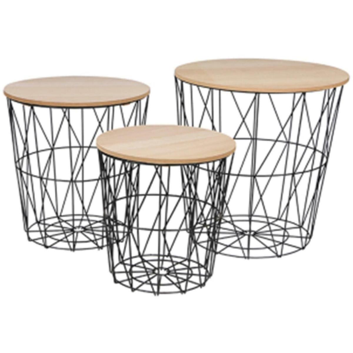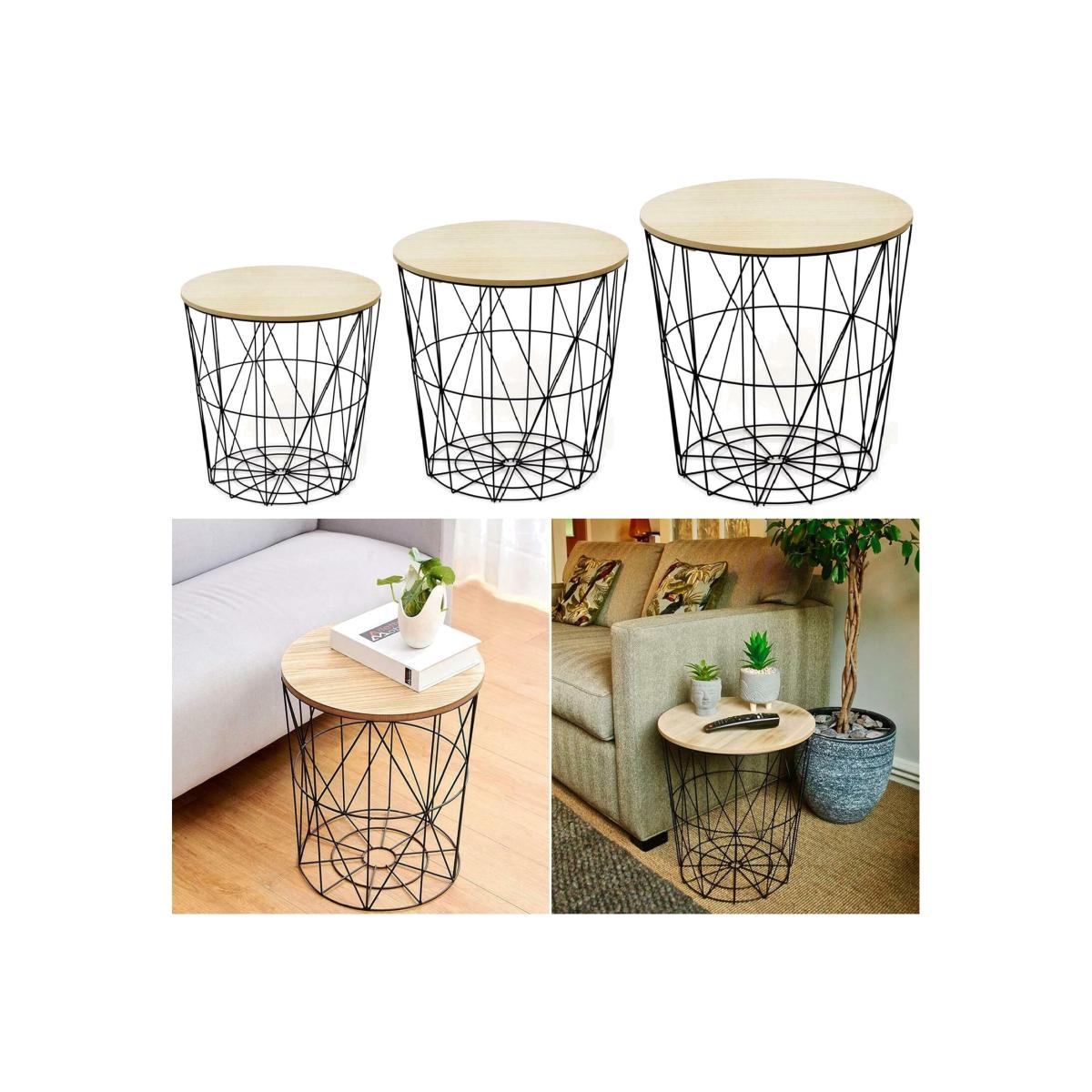 Gr8 Home Set Of 3 Black Geometric Wire Round Coffee Side End Table Bedside Nest Tray With Storage Basket Metal Iron Wooden. This gorgeous modern black metal geometric wire occasional side storage table with Wooden Top would look fabulous in any room in your home and is perfect for a variety of different uses, such as displaying plants, or keeping your reading material or drink nearby, while the wire basket base provides an extra storage solution for your home. Very easy to assemble, simply rest the wooden table top on to the wire frame base - no tools required