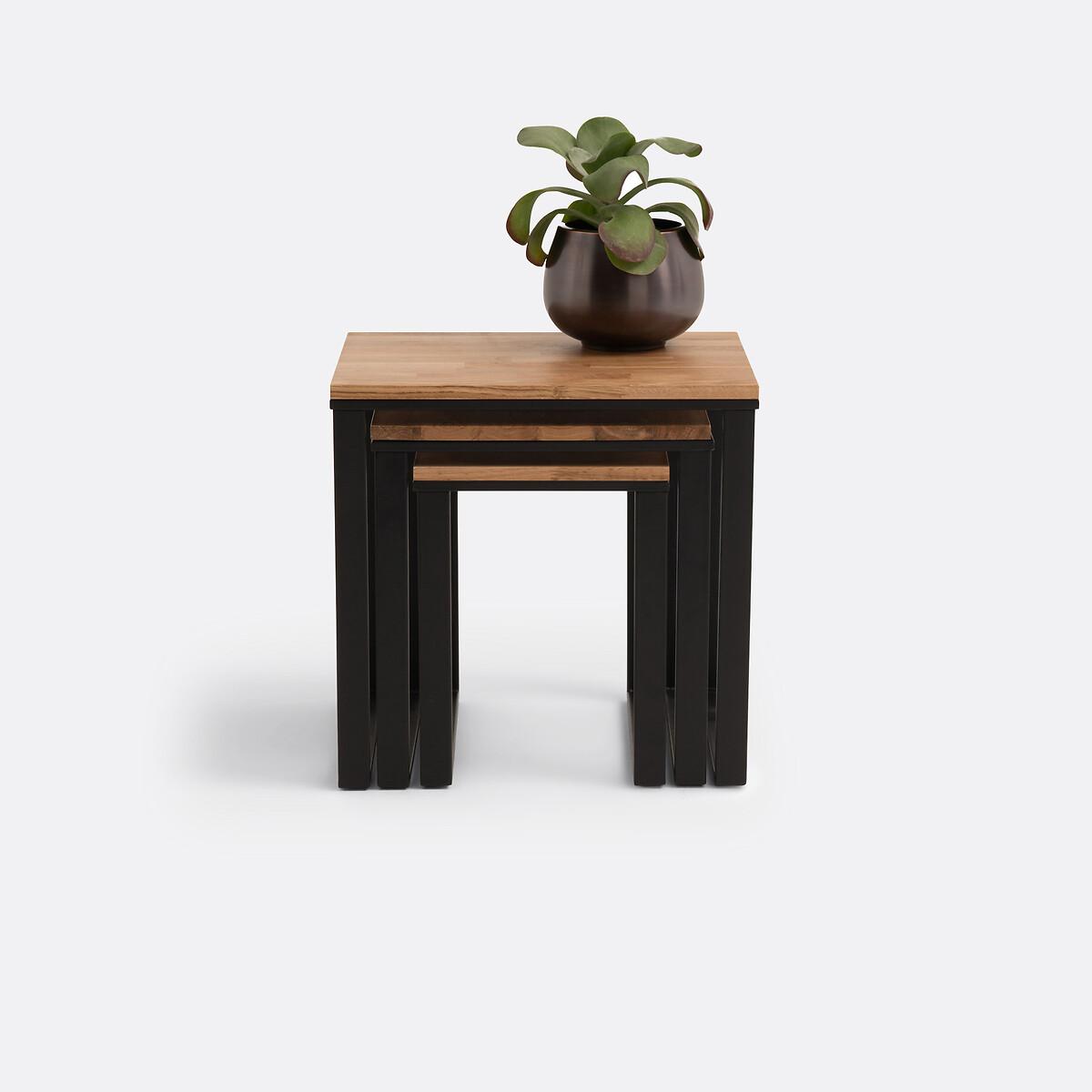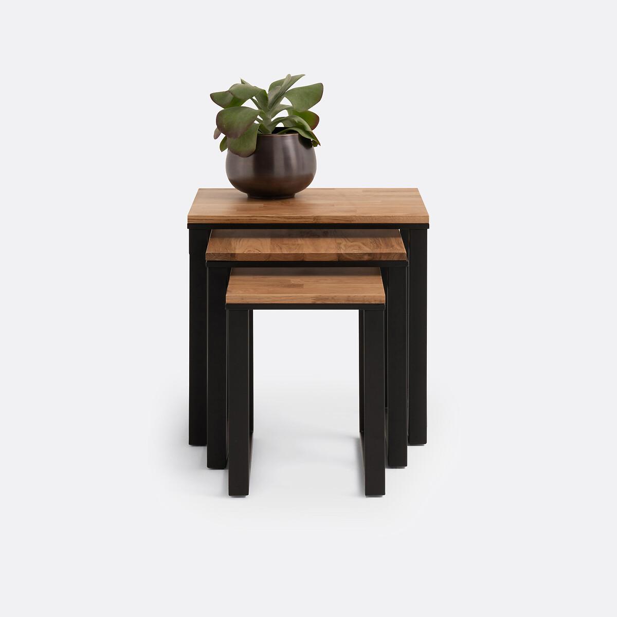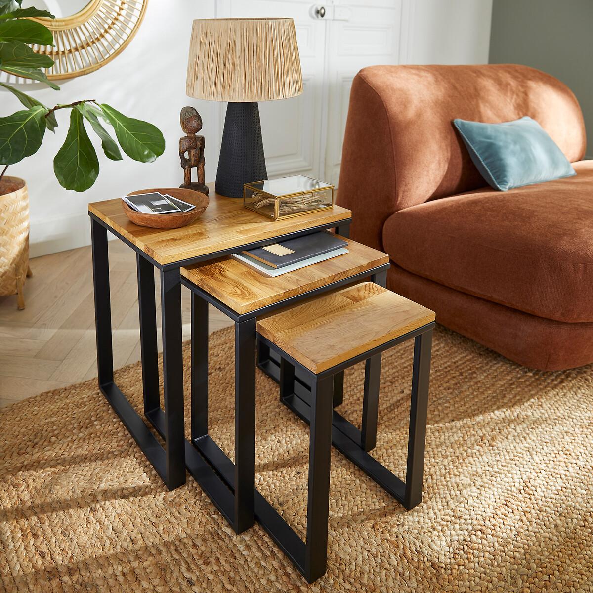 Sleek and modern. The Hiba collection plays with wood & metal. The sleek graphic lines of this side table have a contemporary feel. Add a new dimension to your interior style!Product Details • Tops in solid finger-jointed oak, nitrocellulose varnish finish, in nuanced colours • Structure and sled-style base in steel with a black epoxy lacquer coating, aged untreated finish (lightly textured for an irregular effect) • Built-in protection padsDimensionsOverall. Large table • Width: 50cm • Height: 50cm • Depth: 40cm. Medium sized table • Width: 40cm • Height: 45cm • Depth: 40cm. Small table • Width: 30cm • Height: 40cm • Depth: 40cmDelivery:. Assembly required. Available for home delivery. Dimensions and weight of parcel • L148 x H52 x D18cm • 19kg