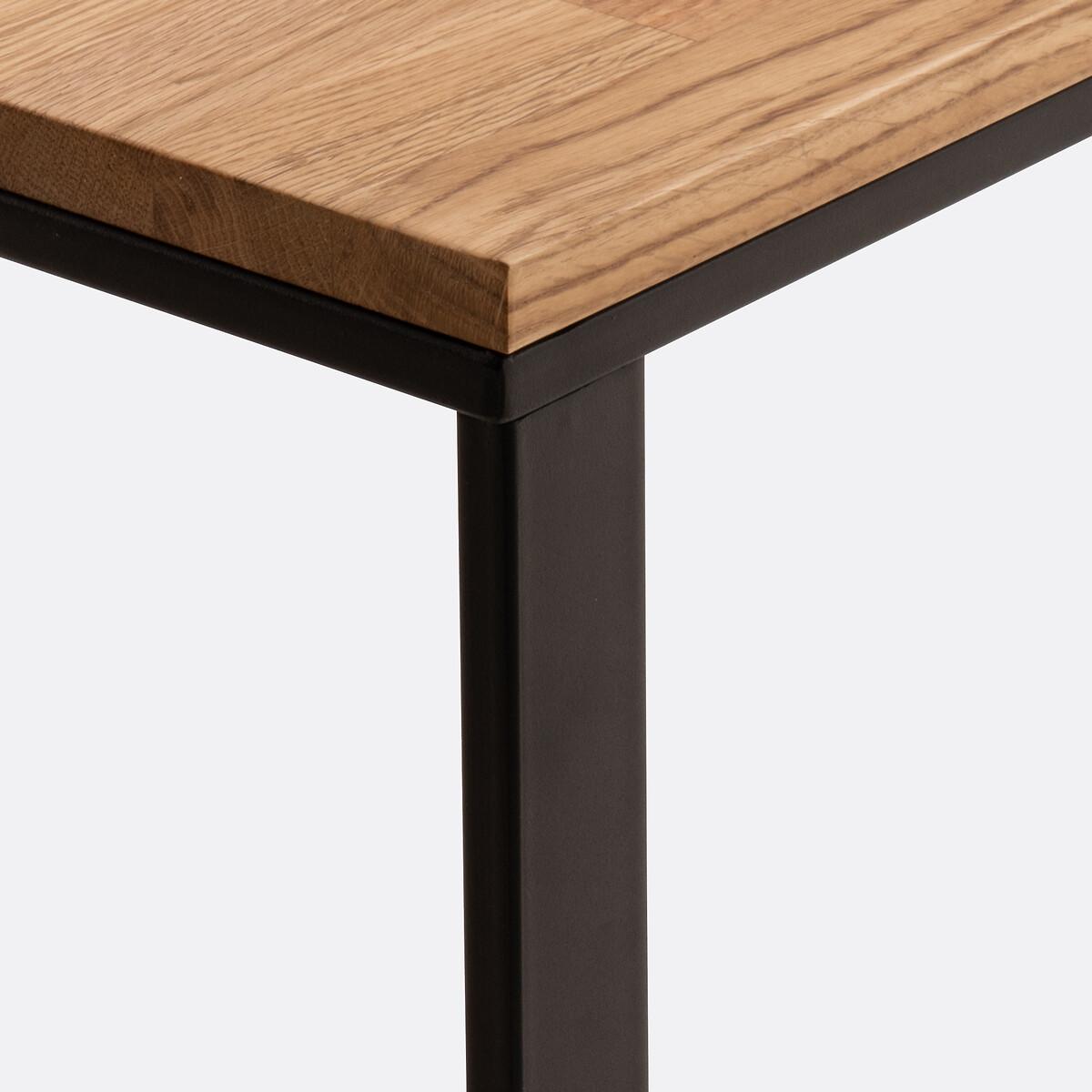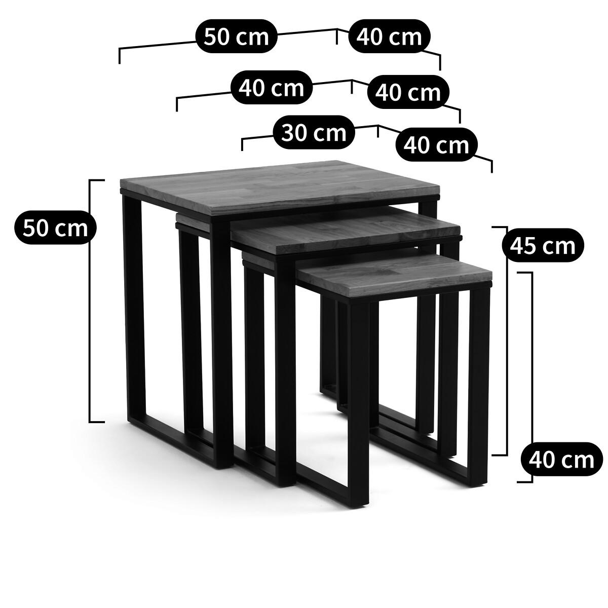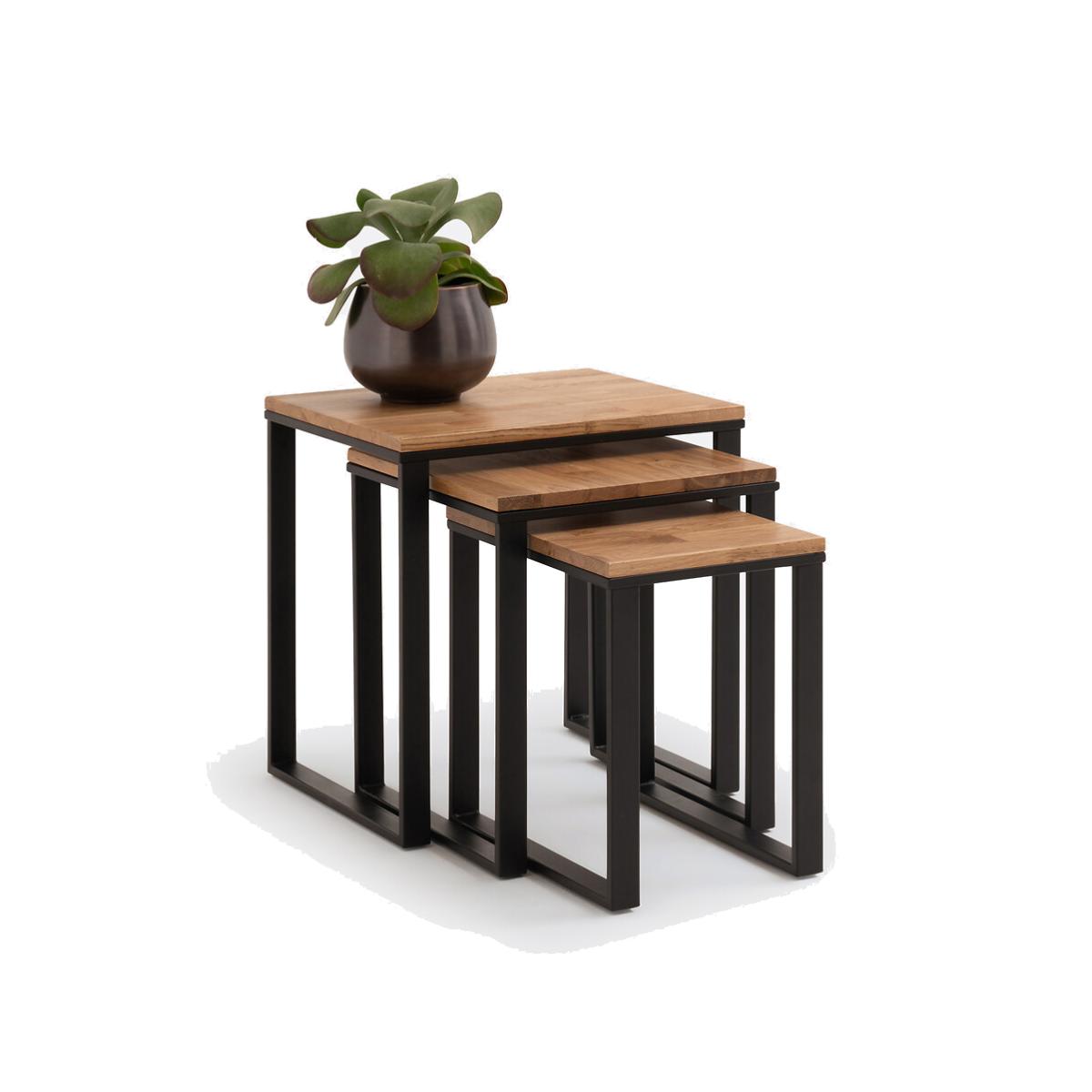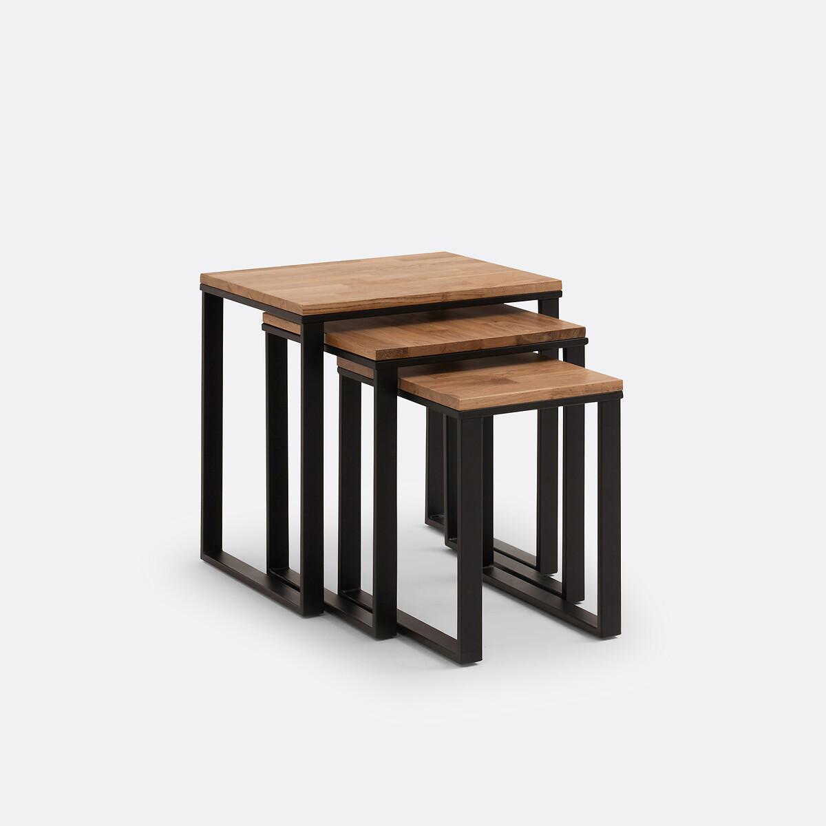 Sleek and modern. The Hiba collection plays with wood & metal. The sleek graphic lines of this side table have a contemporary feel. Add a new dimension to your interior style!Product Details • Tops in solid finger-jointed oak, nitrocellulose varnish finish, in nuanced colours • Structure and sled-style base in steel with a black epoxy lacquer coating, aged untreated finish (lightly textured for an irregular effect) • Built-in protection padsDimensionsOverall. Large table • Width: 50cm • Height: 50cm • Depth: 40cm. Medium sized table • Width: 40cm • Height: 45cm • Depth: 40cm. Small table • Width: 30cm • Height: 40cm • Depth: 40cmDelivery:. Assembly required. Available for home delivery. Dimensions and weight of parcel • L148 x H52 x D18cm • 19kg